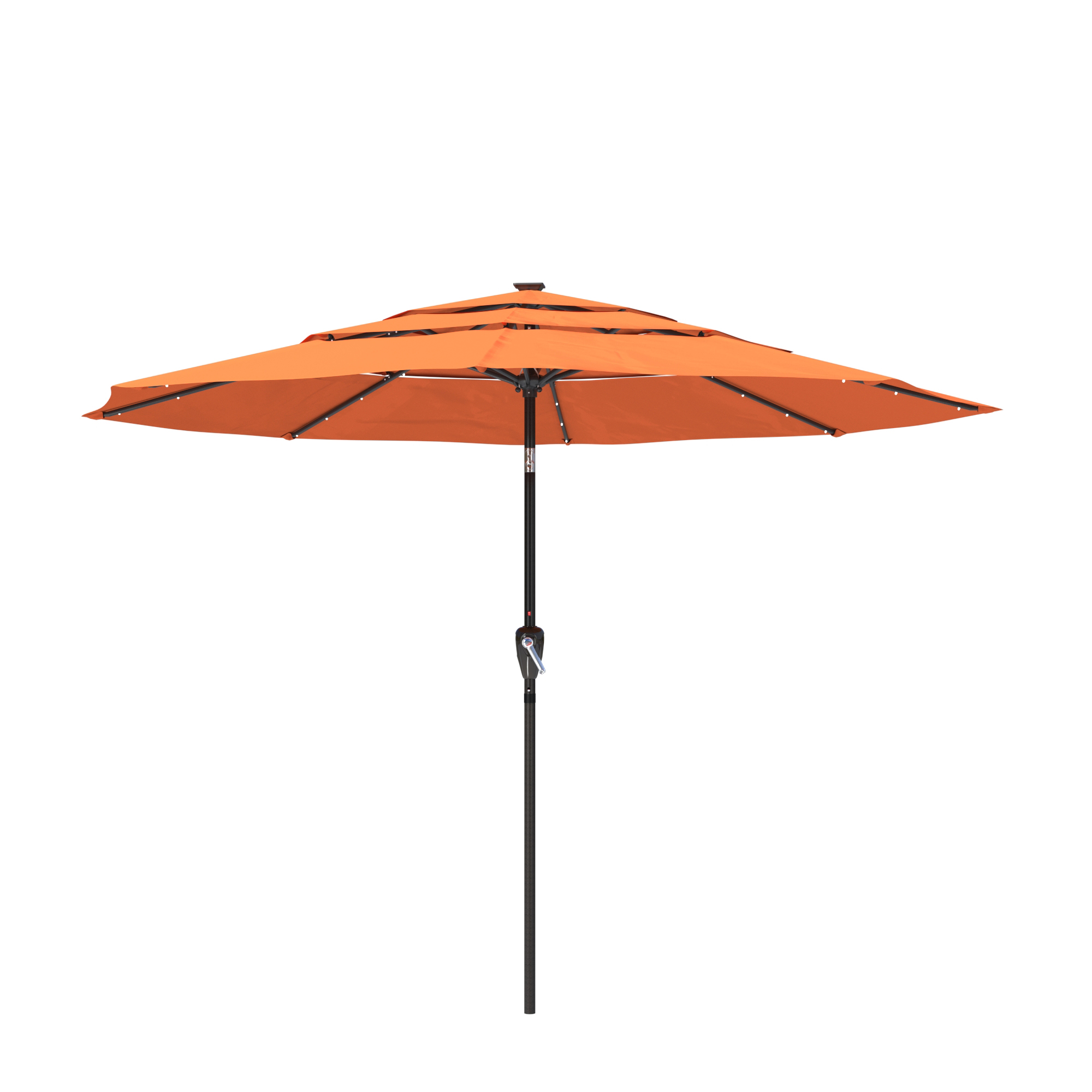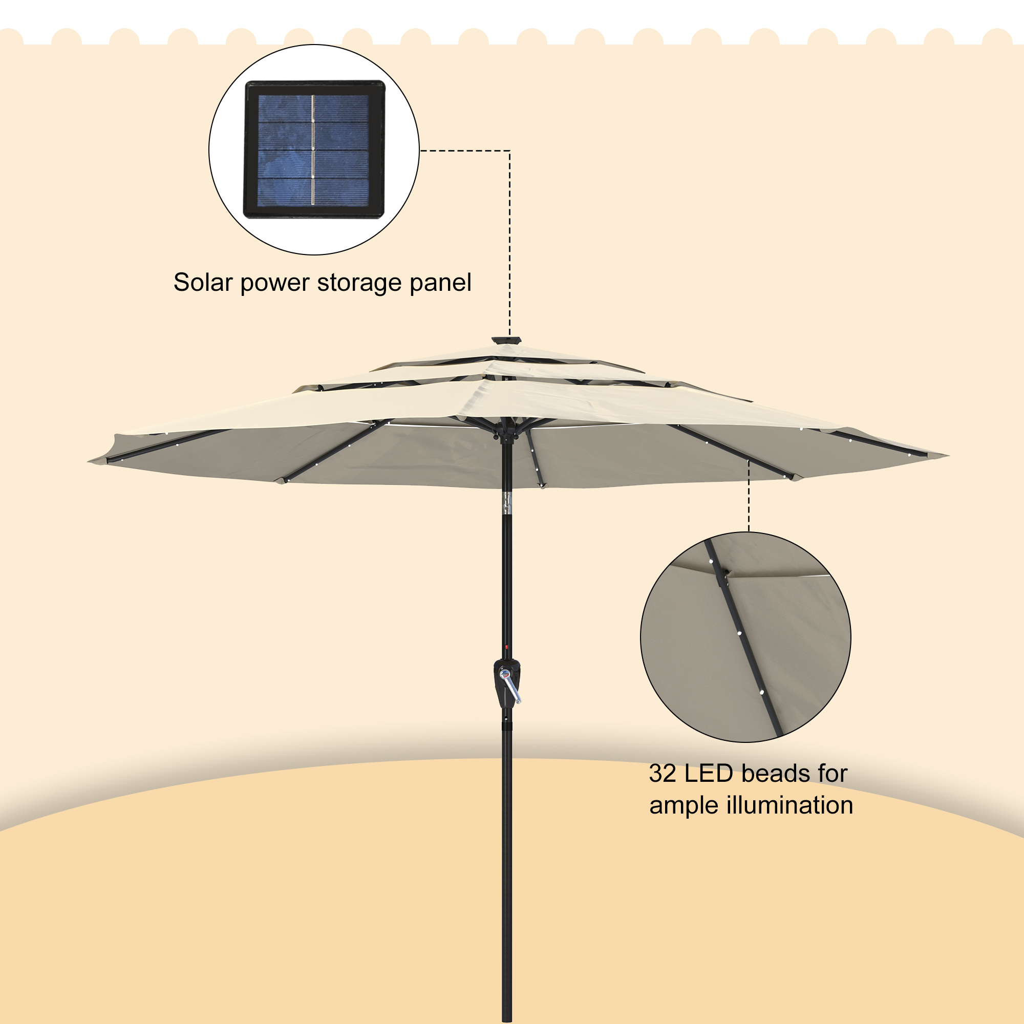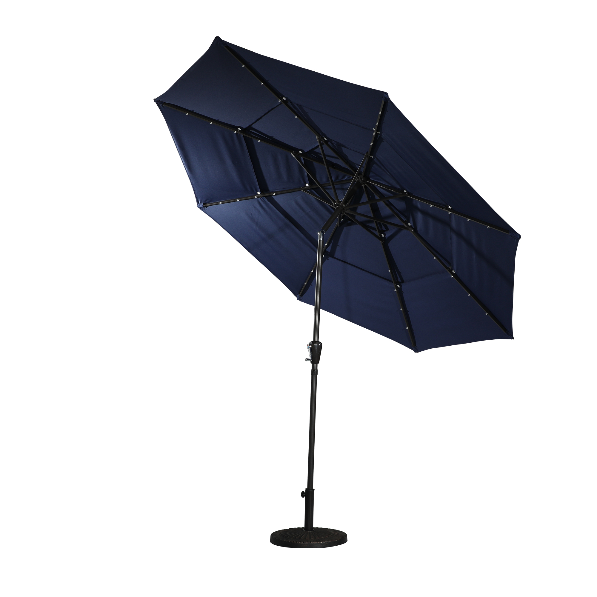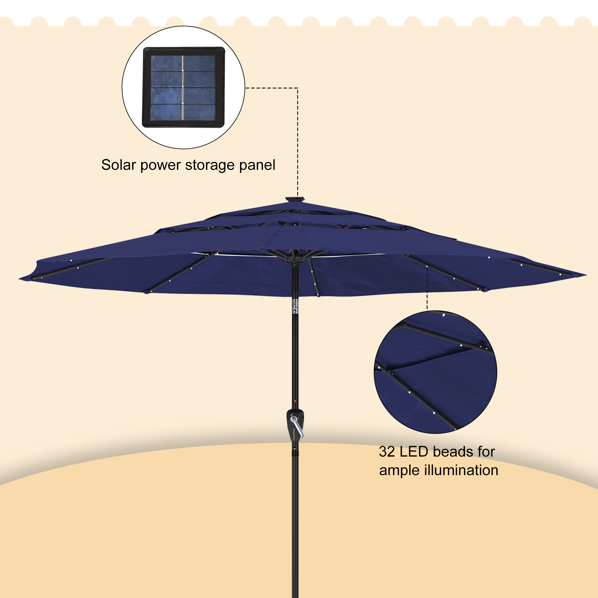 Utilize the umbrella in the evening to prolong your time spent outside. this 11-foot patio solar LED umbrella provides a whole shade area. This umbrella opens quickly and effortlessly with a crank. One base is absent from the umbrella.
