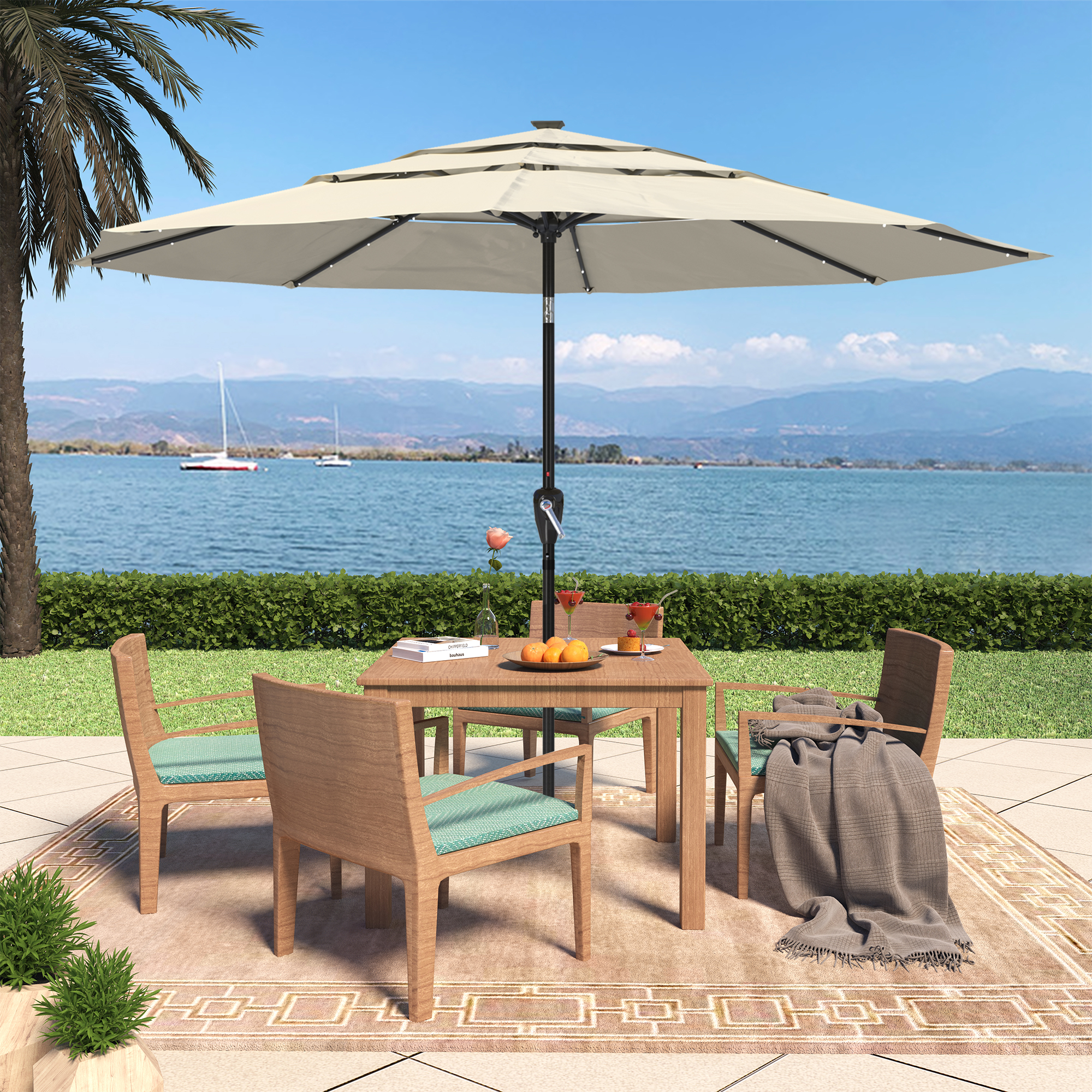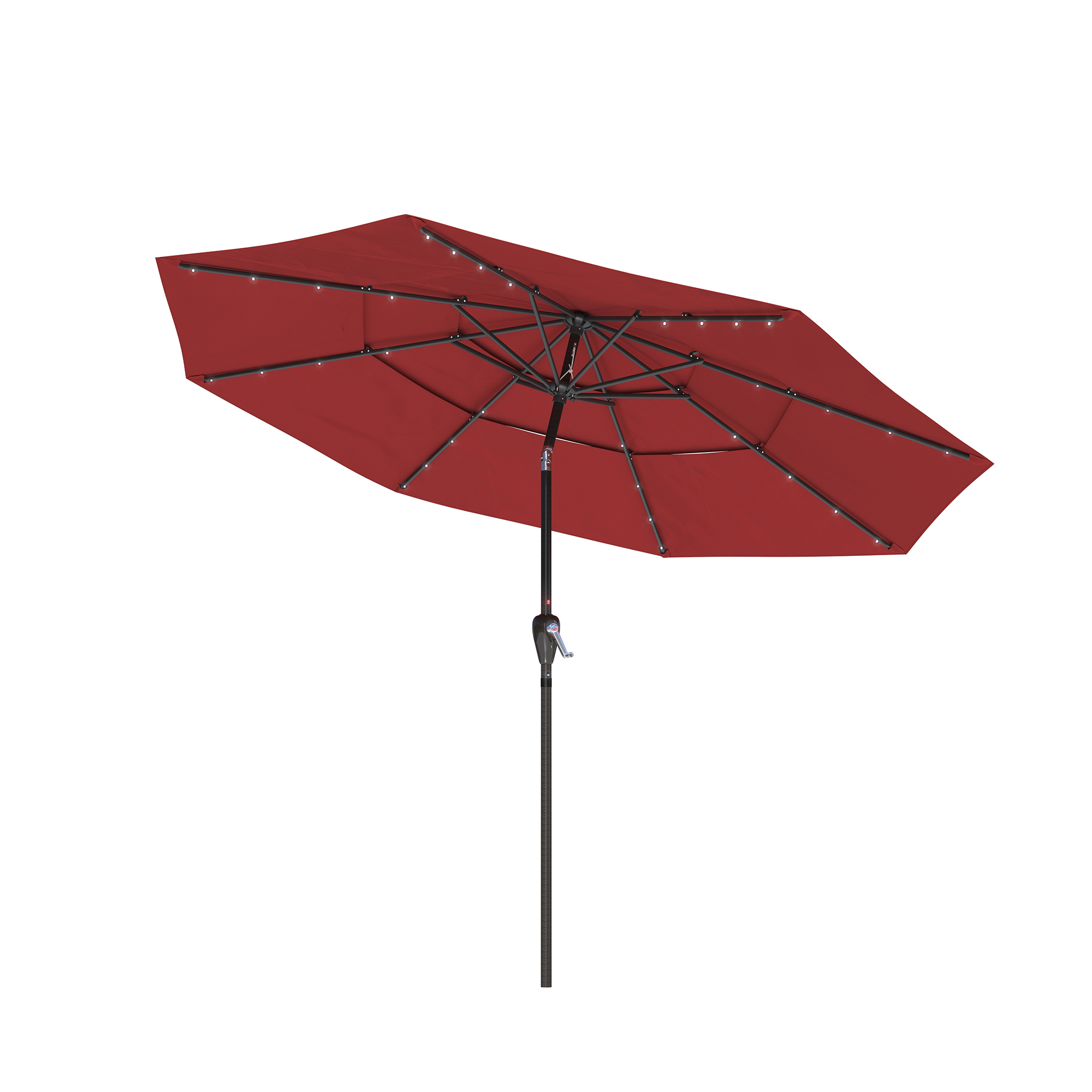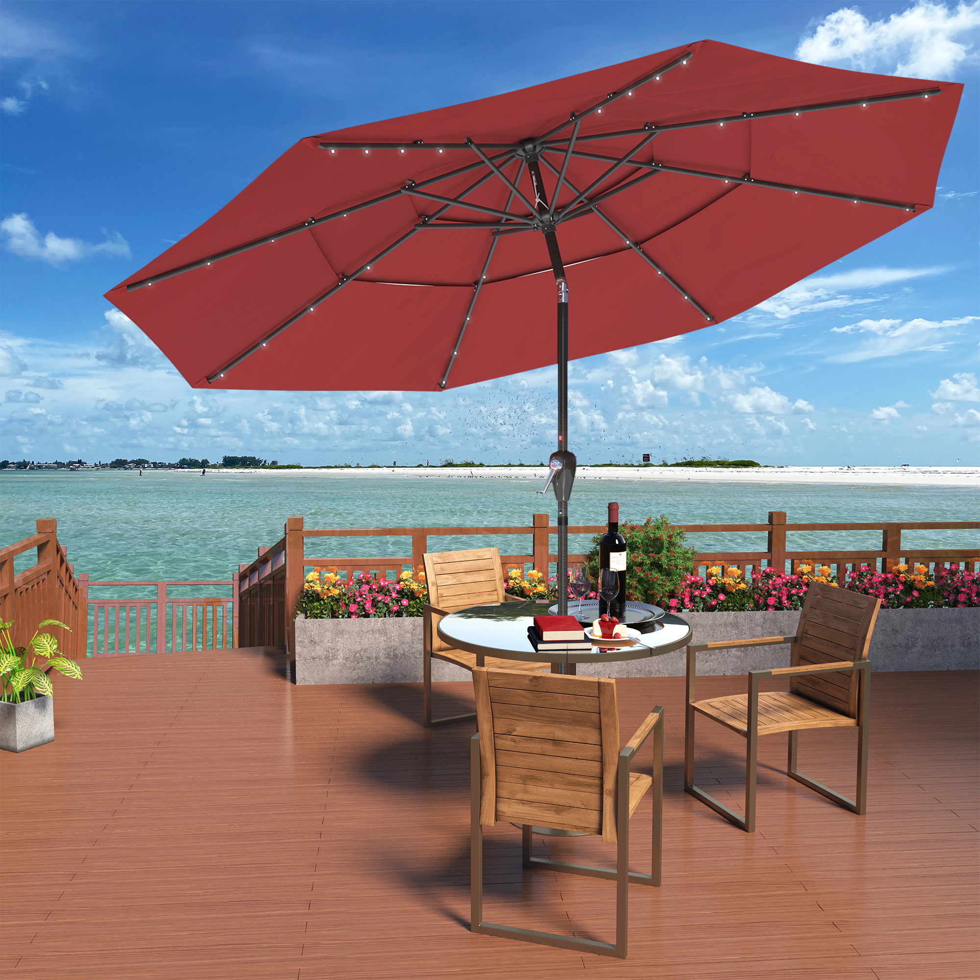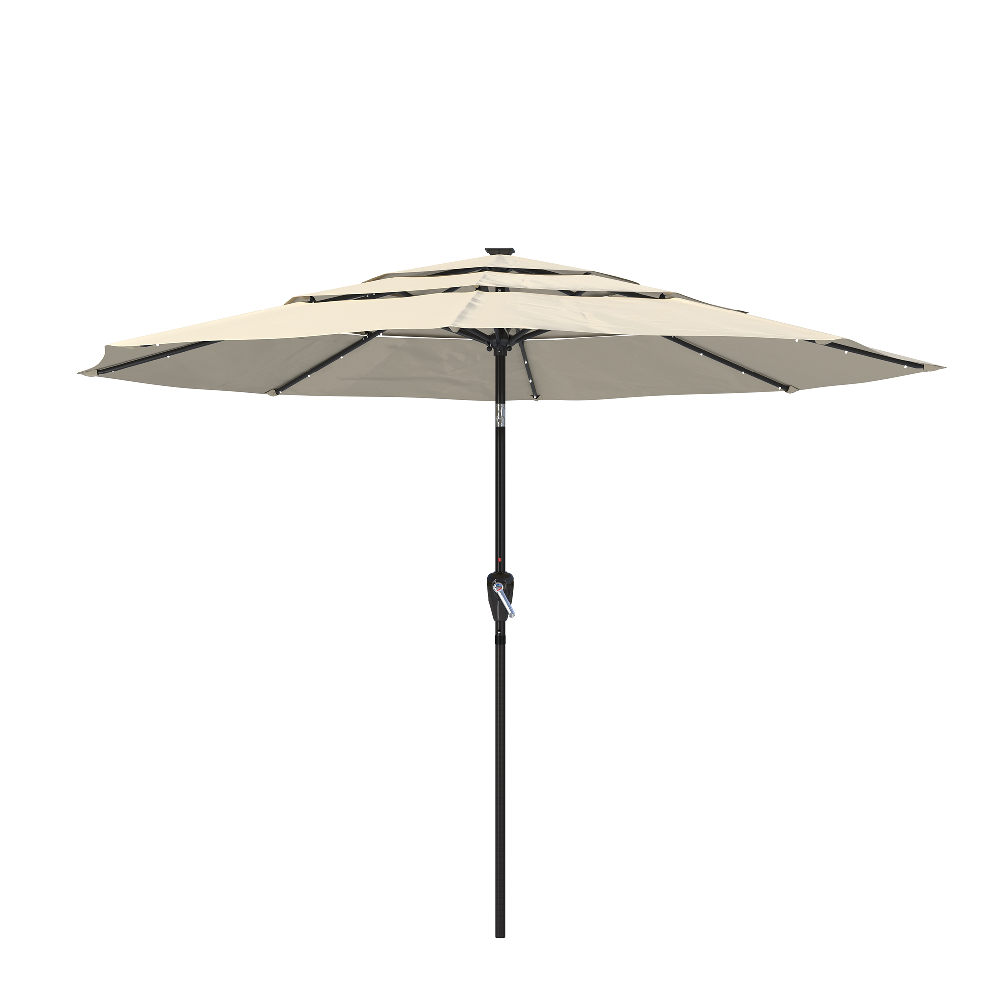 Utilize the umbrella in the evening to prolong your time spent outside. this 11-foot patio solar LED umbrella provides a whole shade area. This umbrella opens quickly and effortlessly with a crank. One base is absent from the umbrella.