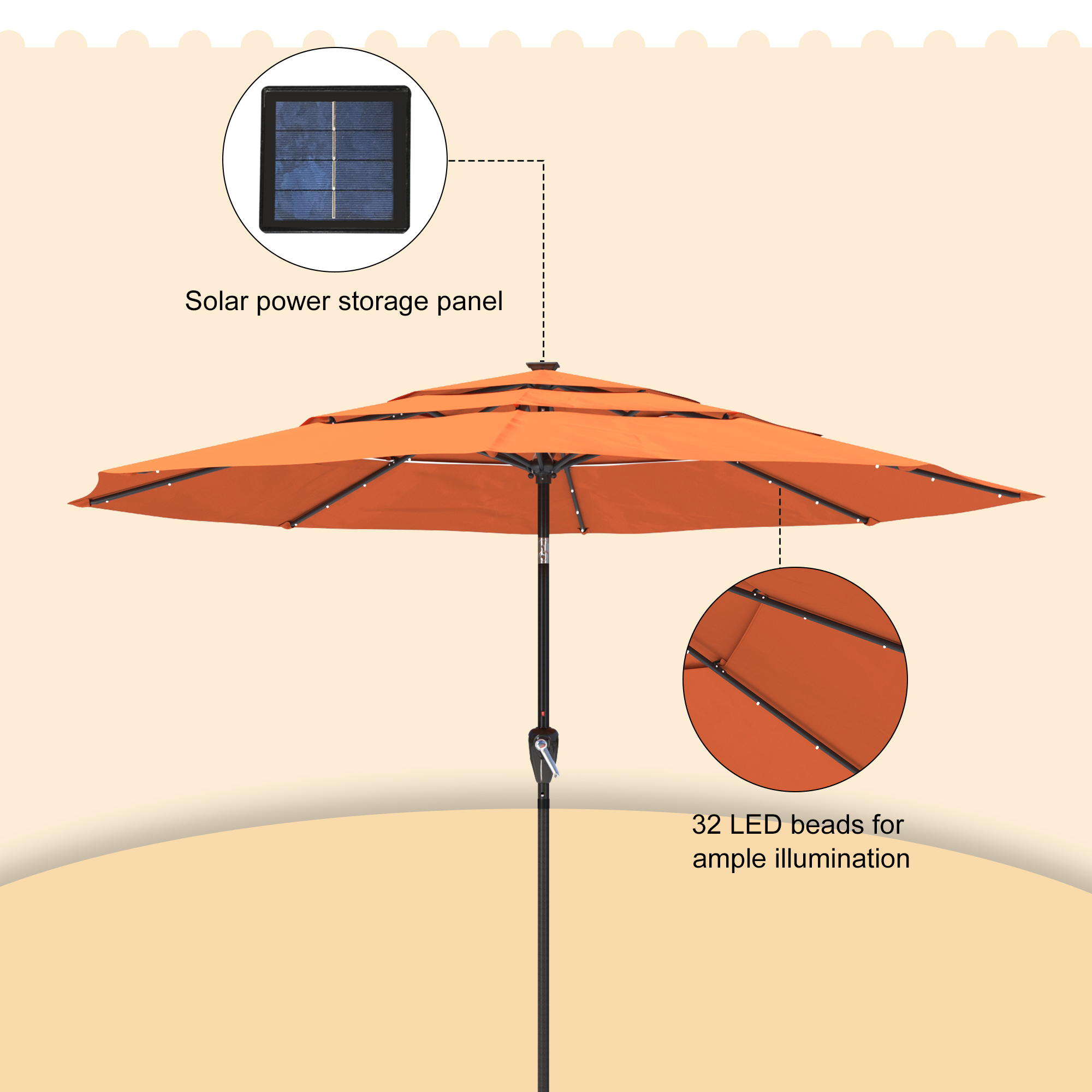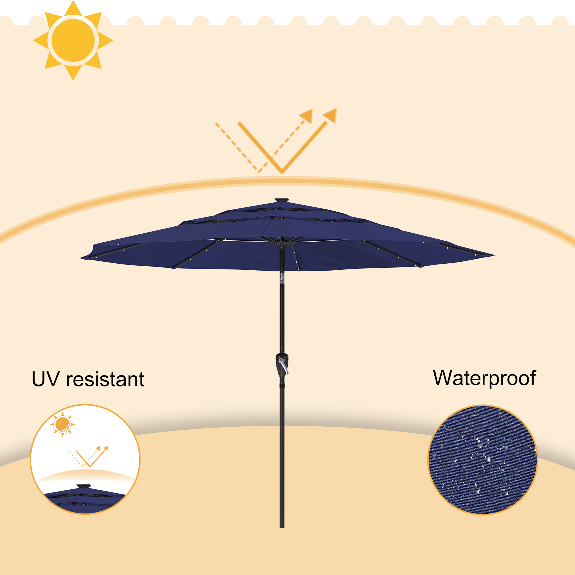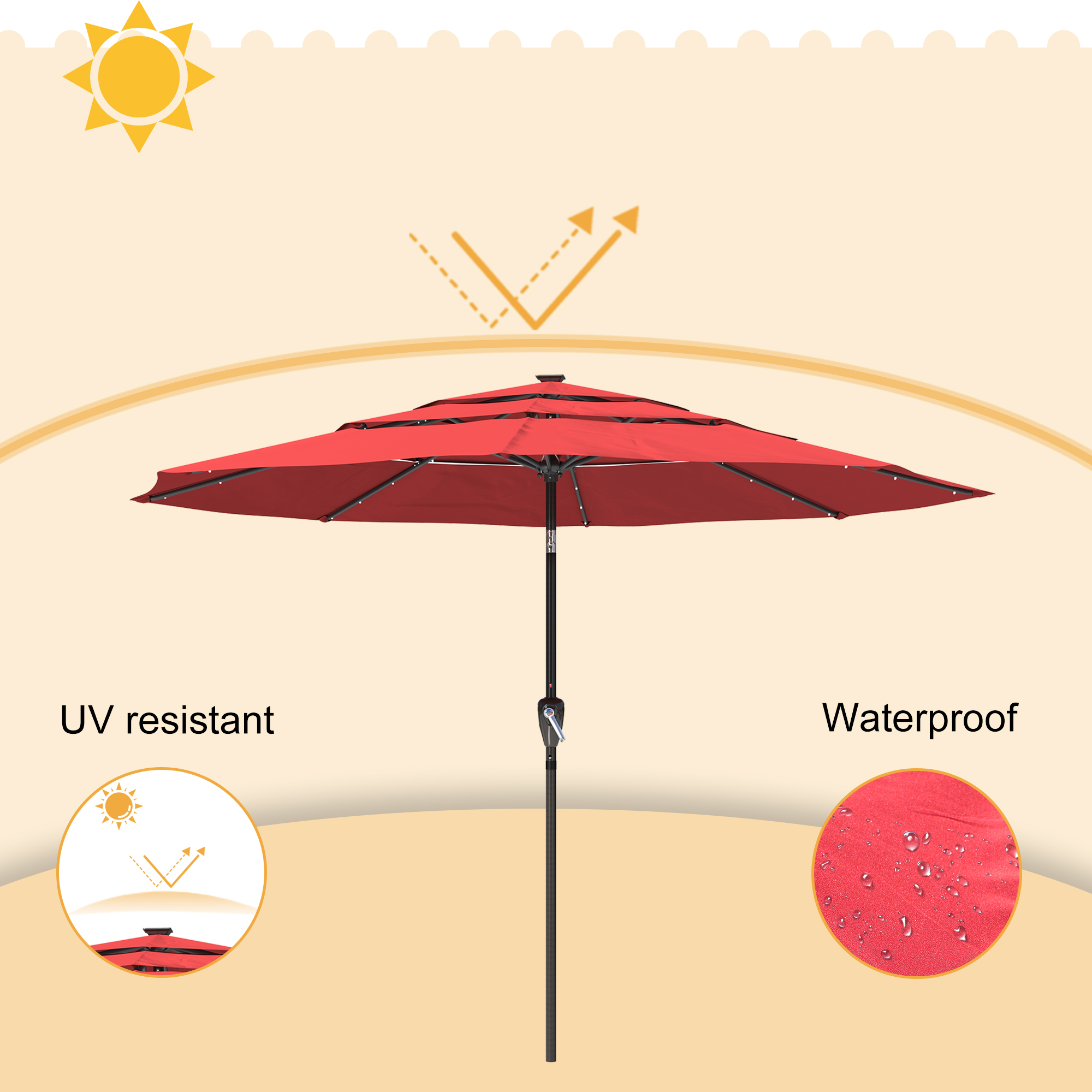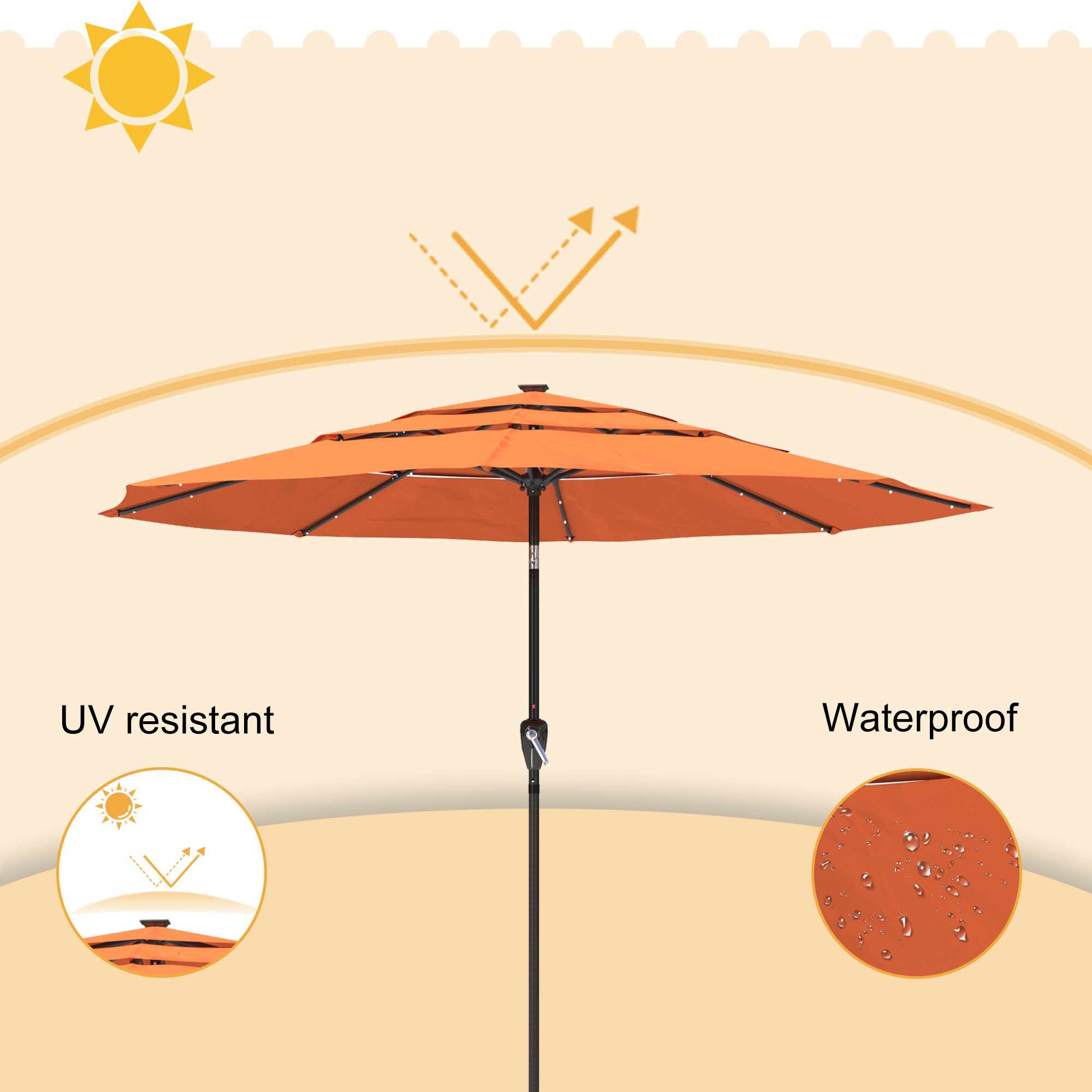 - Polyester umbrella material that has achieved American Standard Level 4 certification, long-lasting color, waterproofness, and UV protection