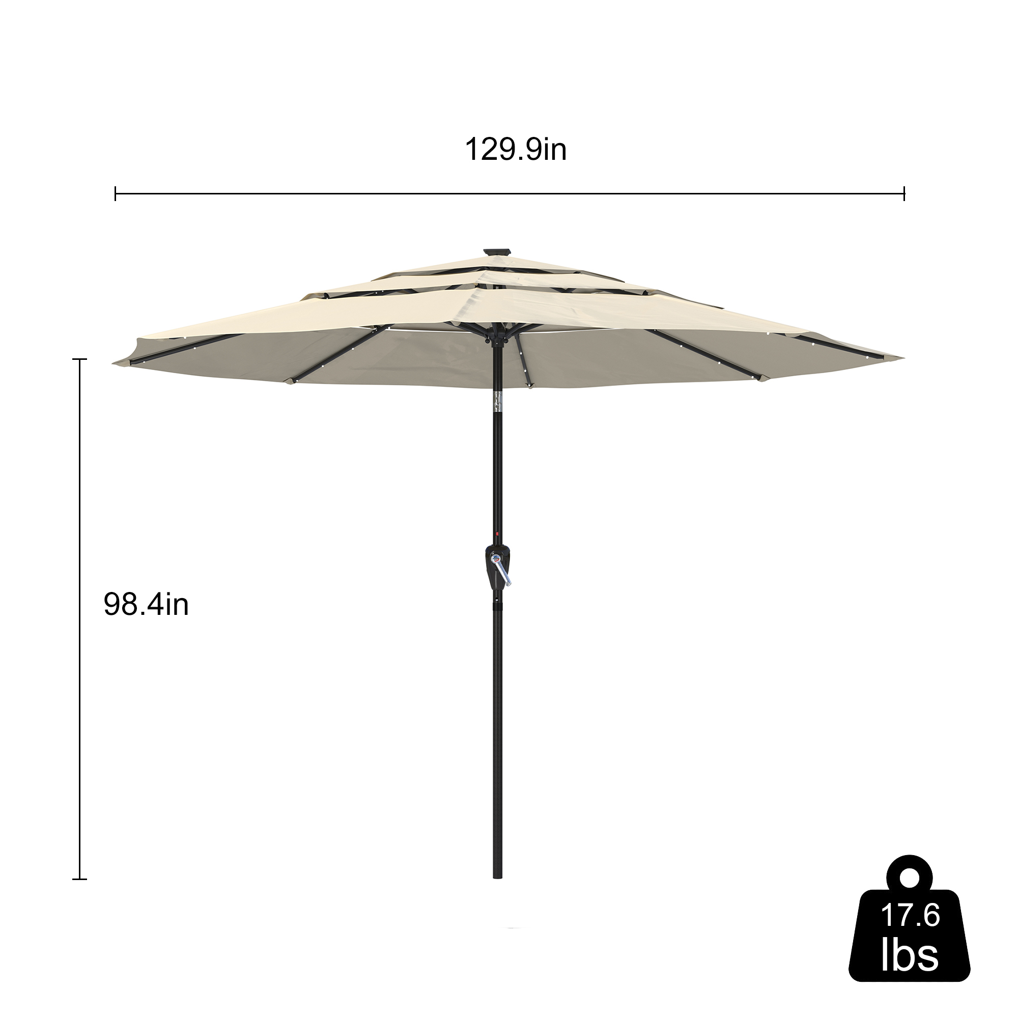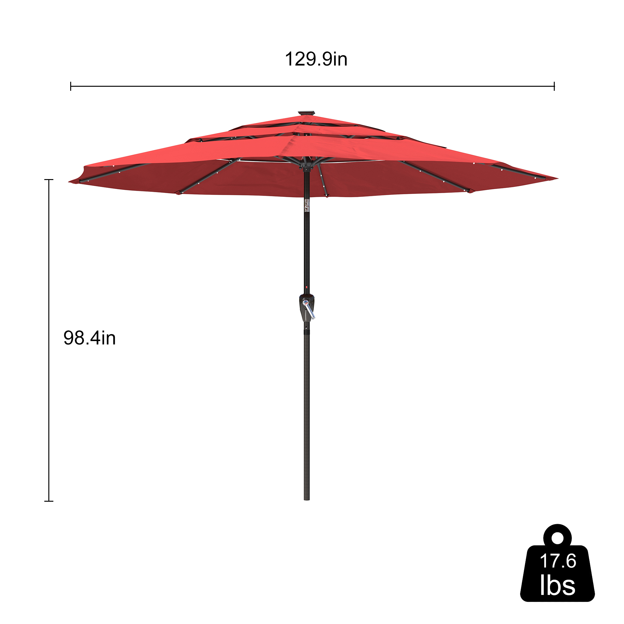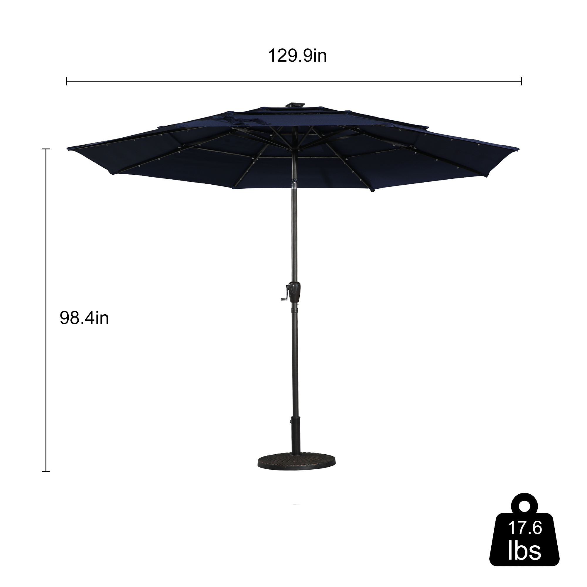 - This umbrella's top, which has a diameter of 130 inches and gives you extra space, does not contain the base.