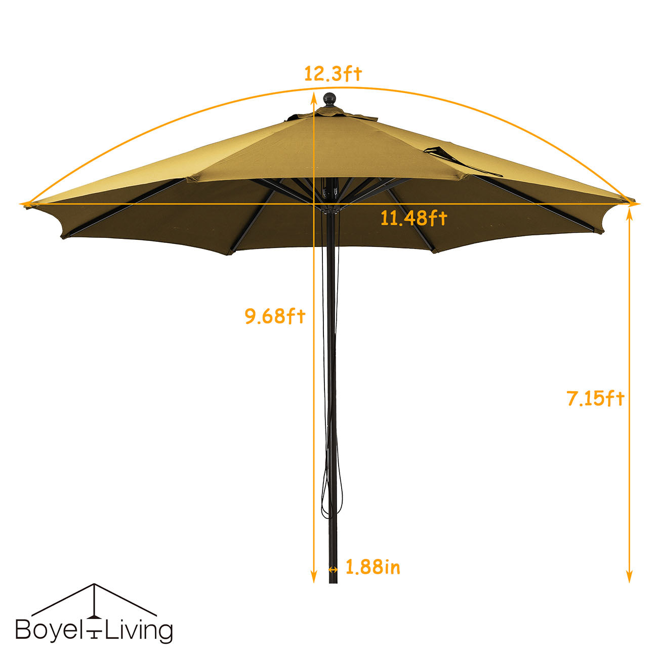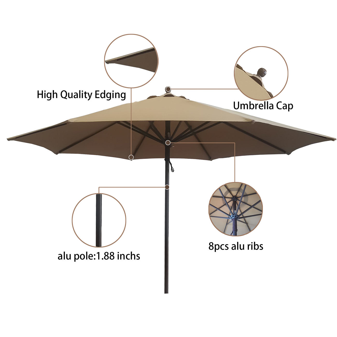 1. The 1.88-in diameter aluminum pole and 8 ribs provide enhanced durability to this umbrella