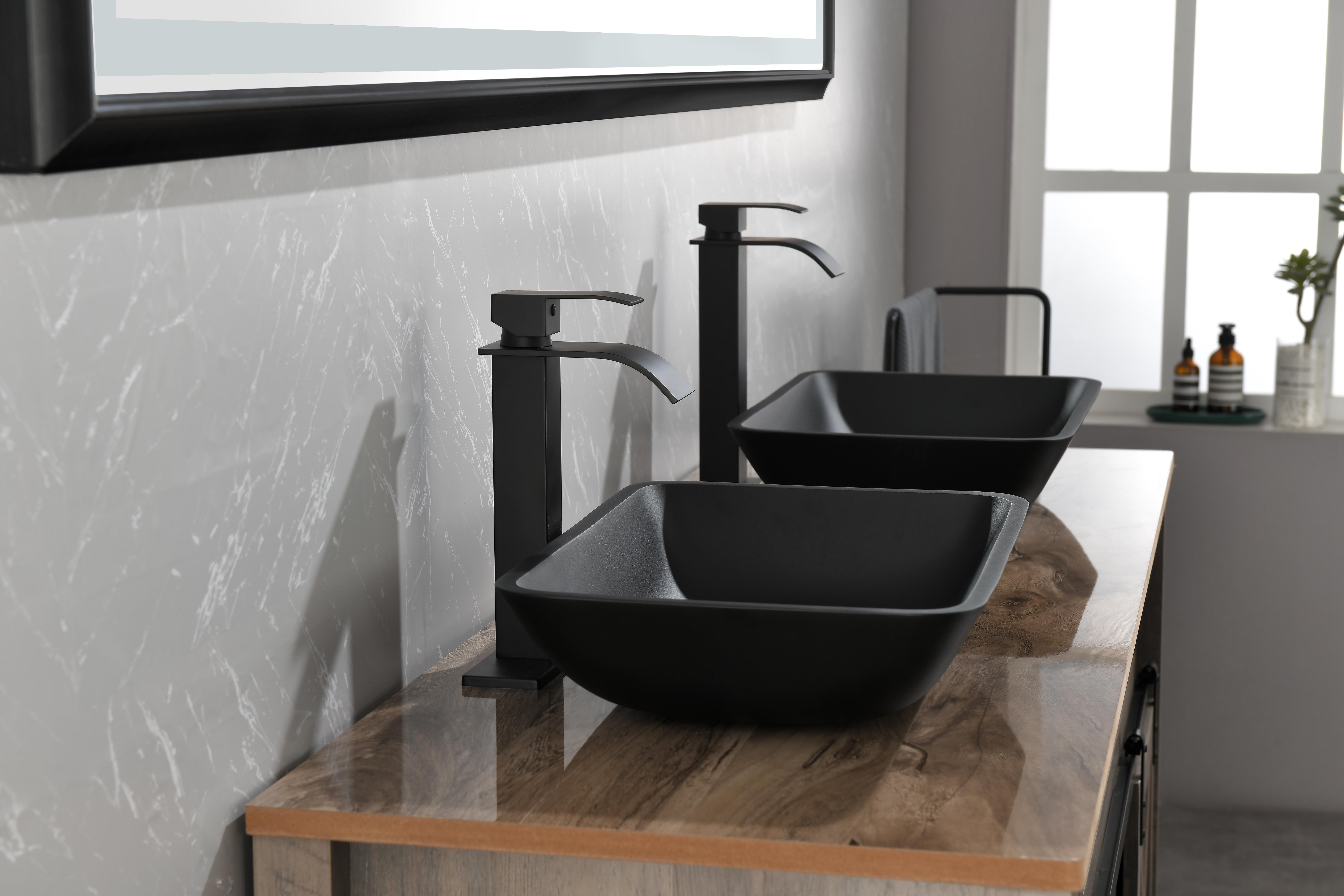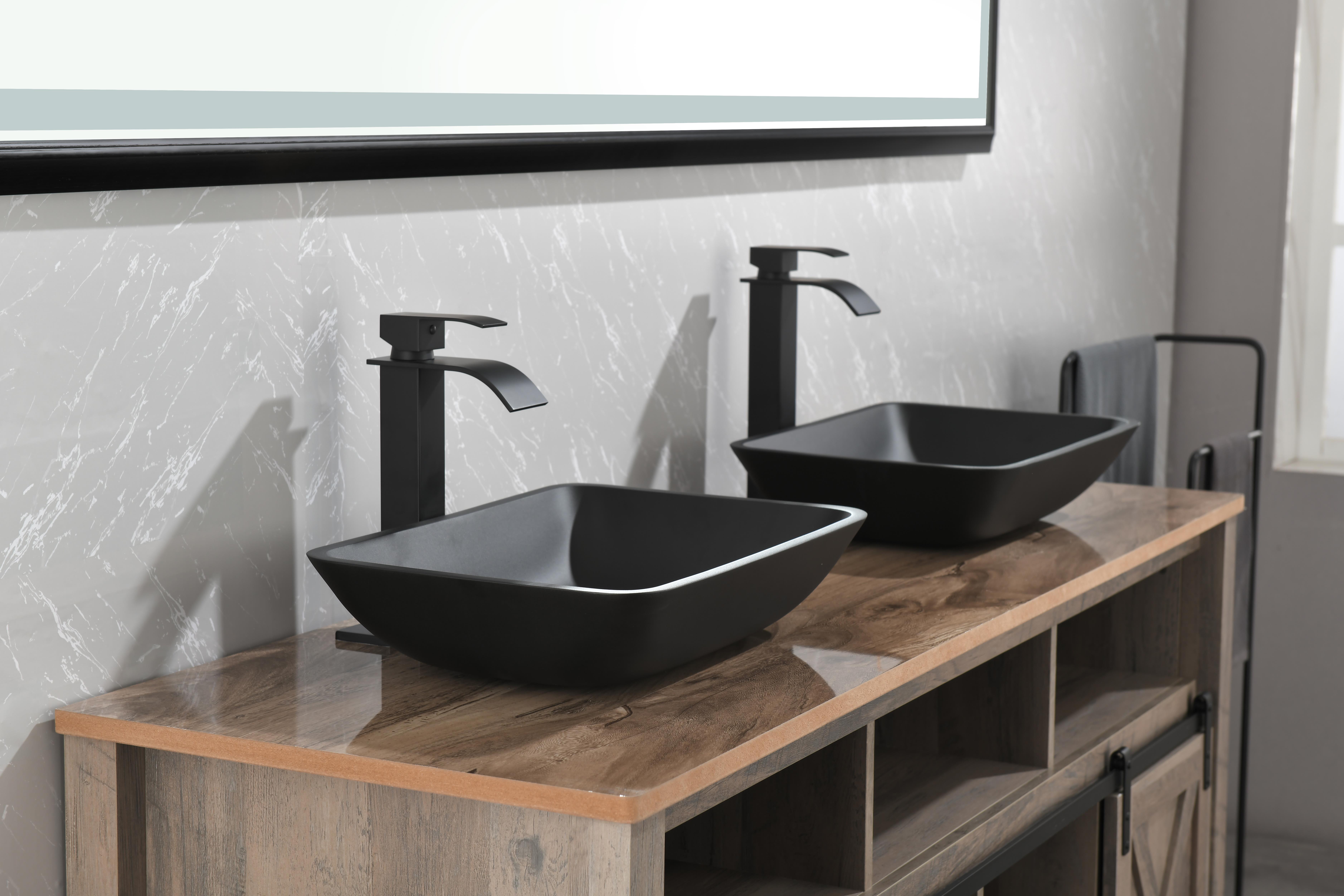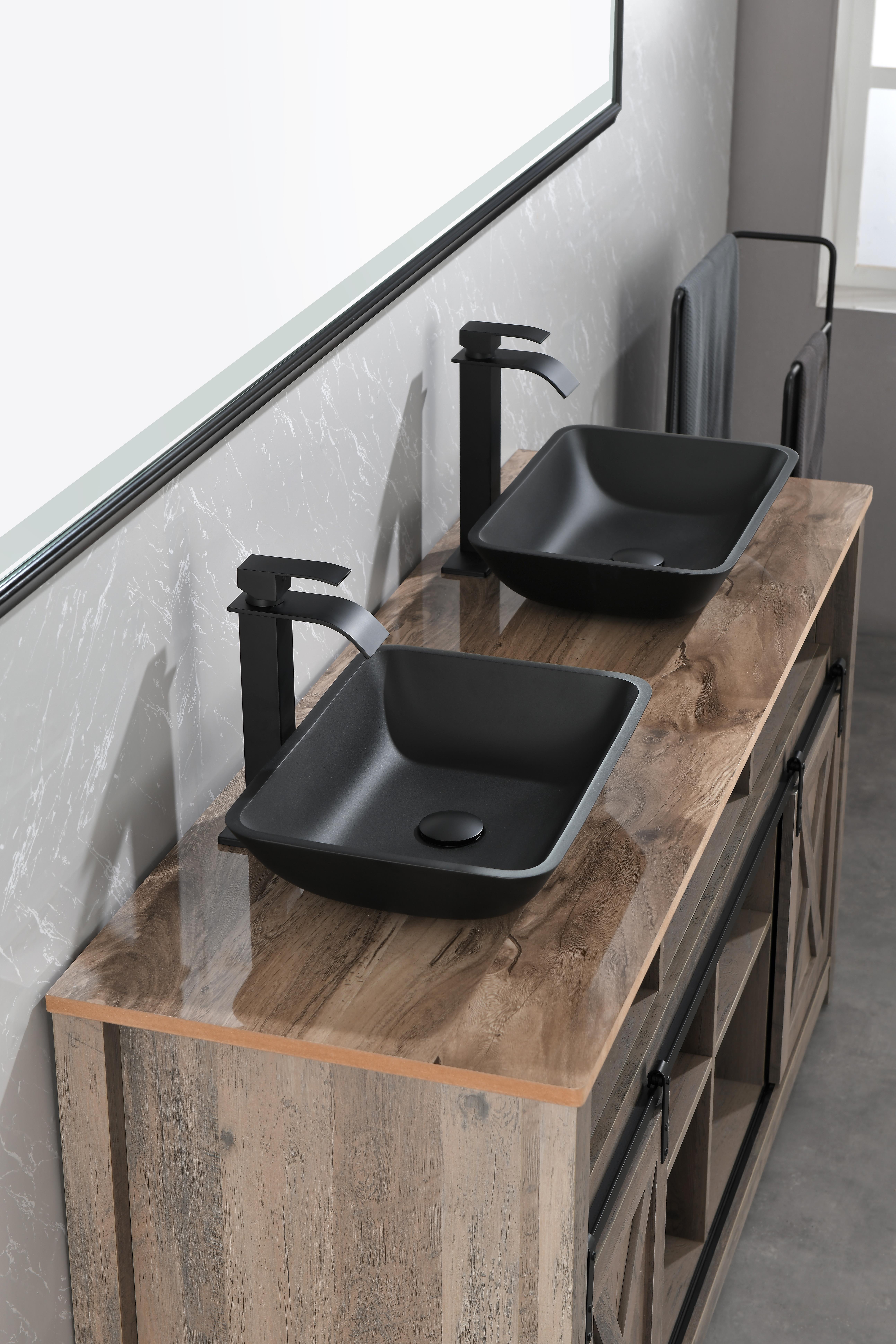 13.0" L -18.13" W -4" H Matte Shell Glass Rectangular Vessel Bathroom Sink in Black with Matte Black Faucet and Pop-Up Drain in Matte BlackANTI-RUST FINISH: plated finish on faucet and pop-up drain expertly resist rust, corrosion, and tarnishECO-FRIENDLY FAUCET: Bathroom faucet operates at flow rate, conserving water without sacrificing water pressureALL-IN-ONE SET INCLUDESs: 1 rectangular Matte Shell vessel bowl sink, 1 single-hole 1-handle vessel faucet, 1 pop-up drain without overflow, all mounting hardware and hot/cold waterlinesSINK DIMENSIONS: 18-in L x 13-in W x 4-in HFINGERPRINT FREE: Unique sink construction has specialty coating to repel fingerprints and markssink sets bring state-of-the-art components and style to your modern bathroom of today. Deliberately designed, Black Bathroom Sink Set is made to outlast years of use. Innovative and intense, sinks bring the same excellence of classic solid tempered glass and take the construction to the next level. The is deeply opaque and has an eggshell-like sheen that is rich yet subtle. Its deep ebony shade is infused into the sink itself, eliminating the risk of a chipped finish. It has a unique coating to prevent fingerprints and marks, leaving it pristine for years of use. This sink has a bold rectangular shape that brings modernity into any bathroom. single-hole, vessel mount bathroom faucet. This easy-to-use faucet is tall without overpowering your space. It has exceptional hardware and is outfitted in a modern matte black finish that resists rust, corrosion and tarnish. The set is made complete with a matching pop-up drain without overflow. Experience the synergy of character and style with this all-in-one bathroom set.Contact customer service for more high-quality pictures