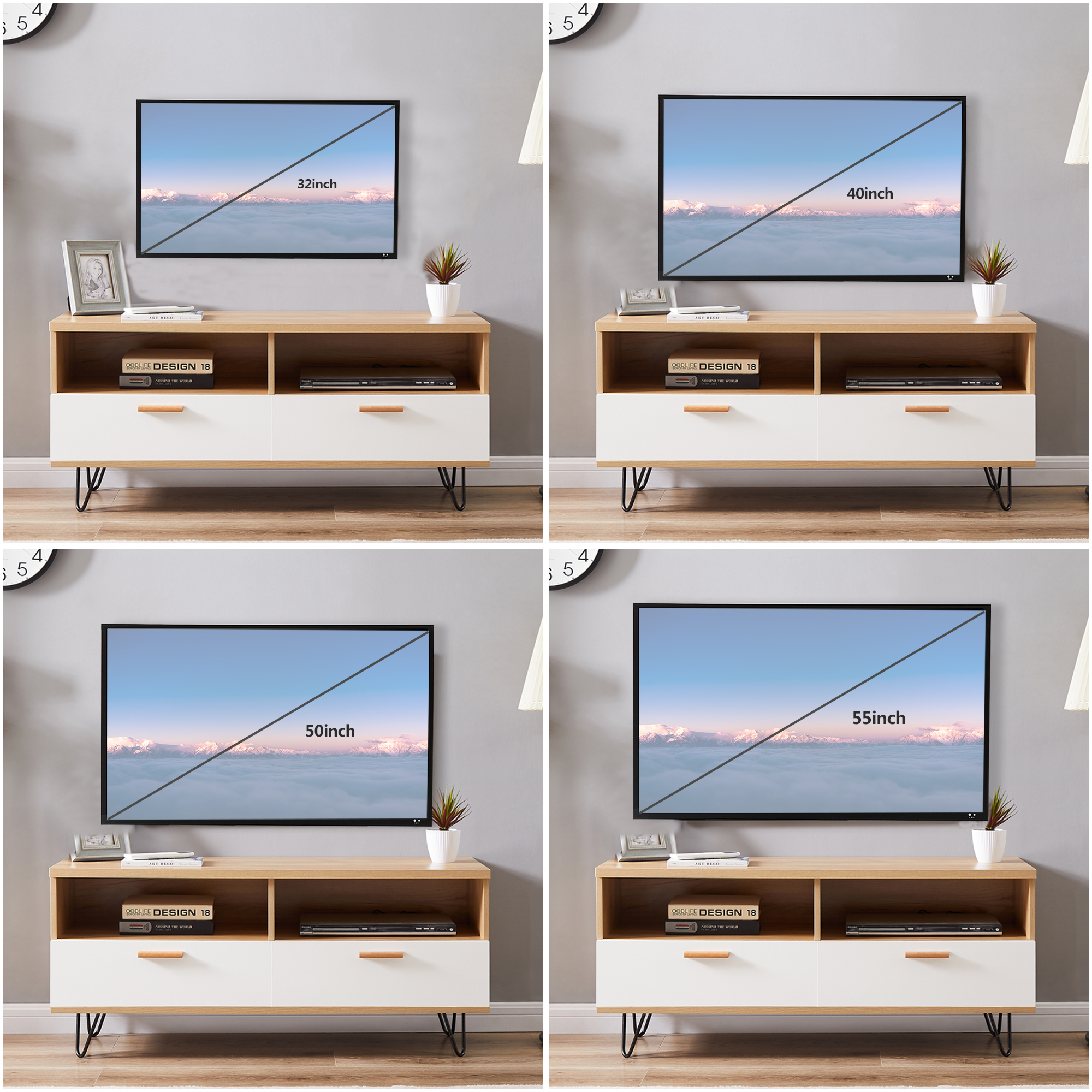 - PERFECT SIZE: 47(L)x 15(W)x 21(H)inch, this white+WOOD GRAIN TV console fit up to 55 inch TV. Spacious tabletop along with 2 large storage space satisfies all your display and storage needs in the bedroom or living room