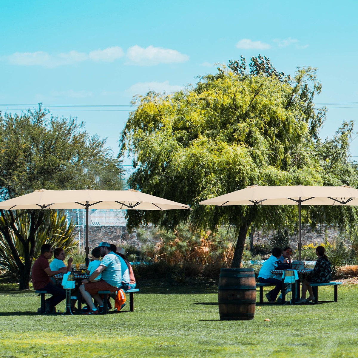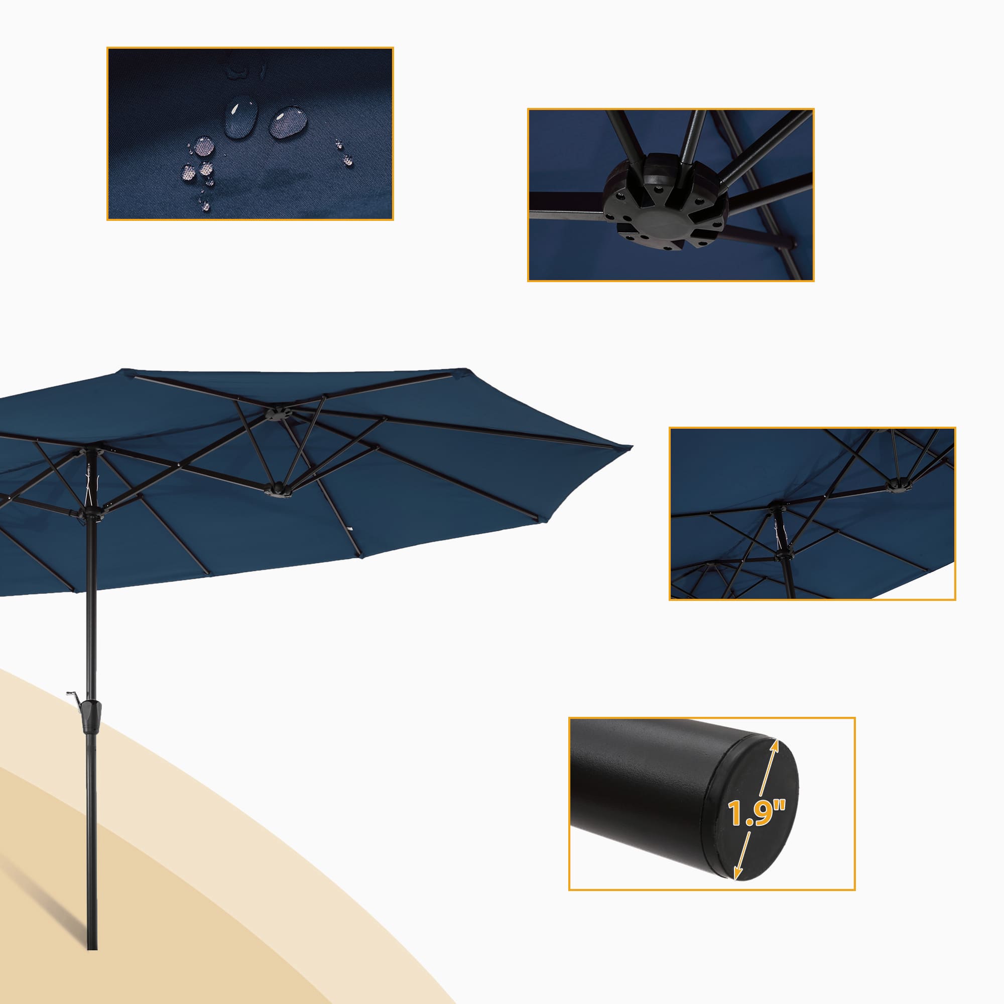 Do you often chat happily with your friends outside? The weather outside sometimes prevents you from doing it. This umbrella is made of a thick steel pole and quality polyester, which is antirust and waterproof that great for outdoor use. The 15ft patio double-side umbrella provides ample shade to keep you cool and protect you from the hot sun. The extra large double-sided design also matches your desk and chair and provides more shade area. You can easily use the crank to turn it on or off which is not only laborsaving but also safe. Vents give you more coolness and safety because it allows airflow and reduces wind pressure. Assembly is easy and can be done without the aid of tools.