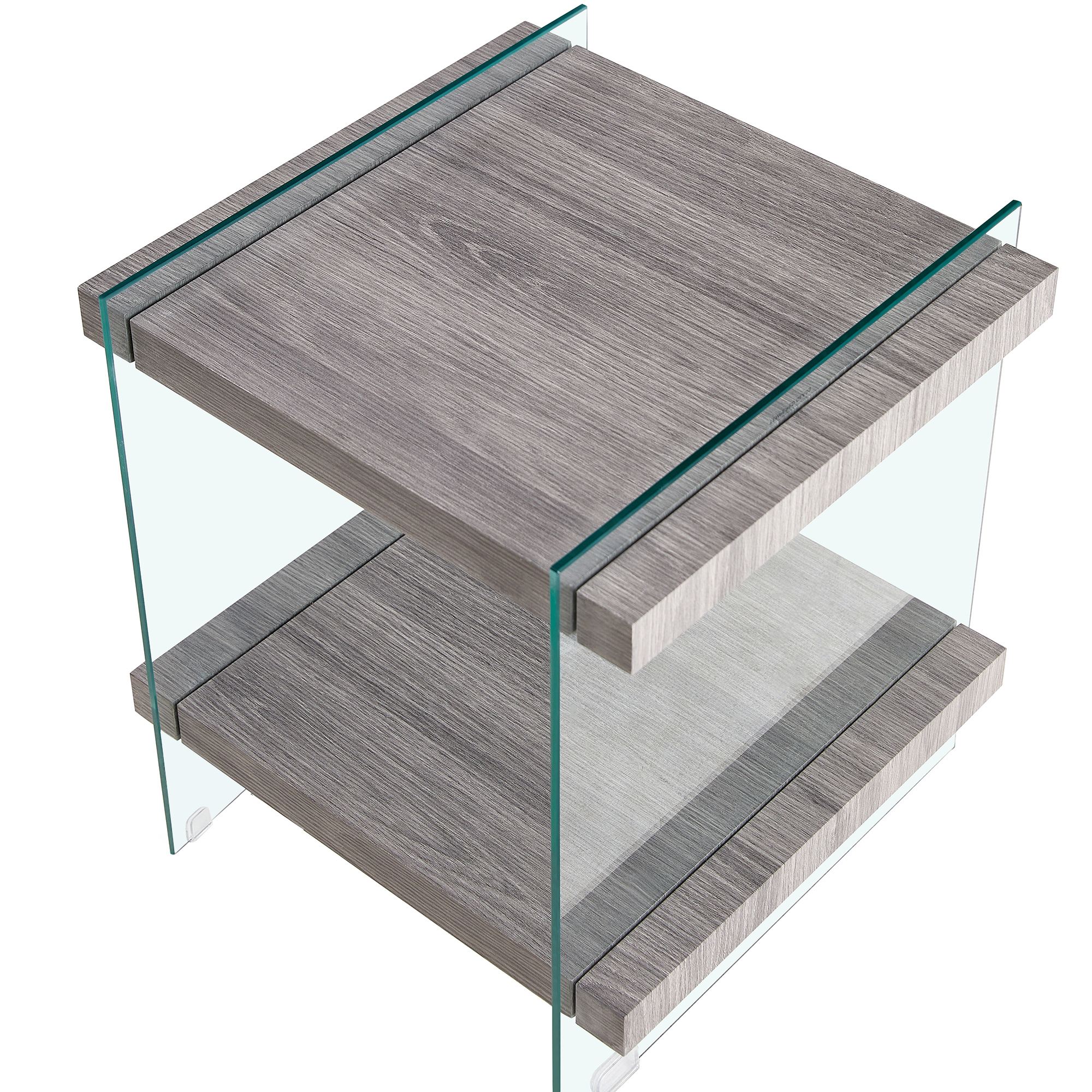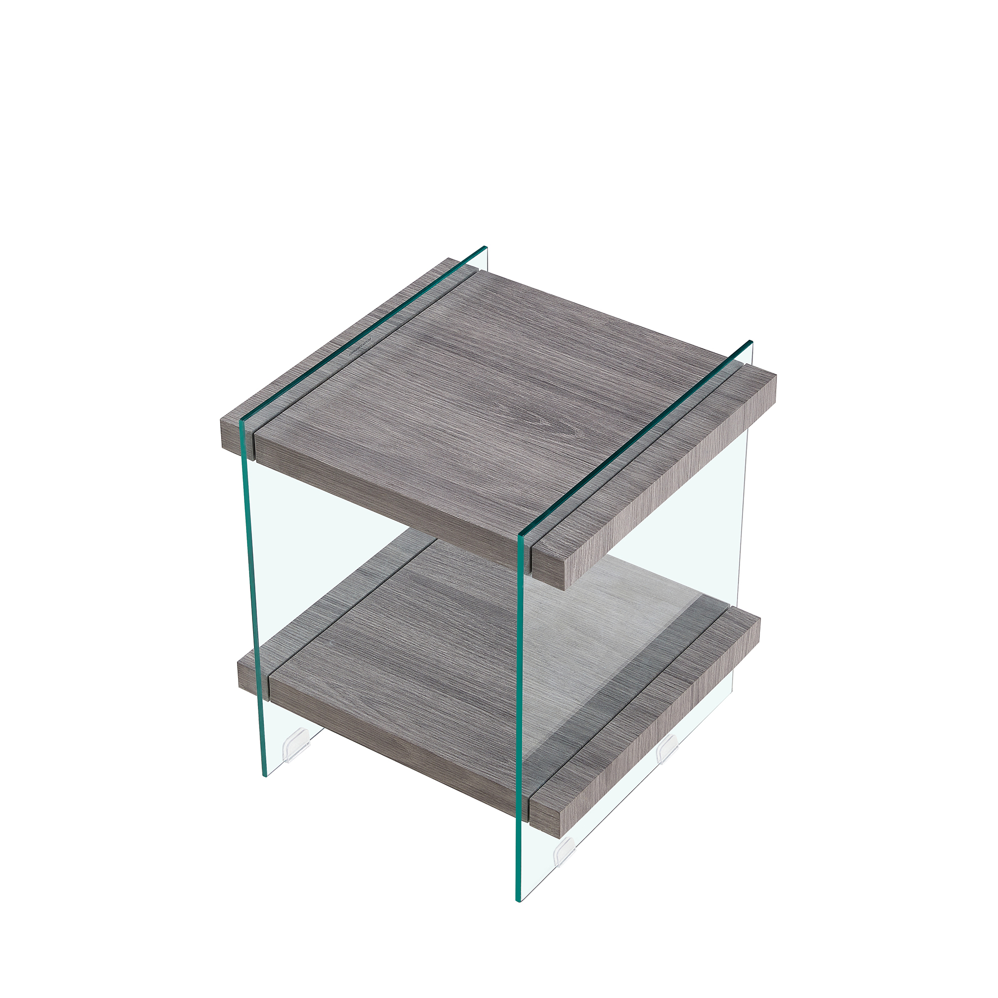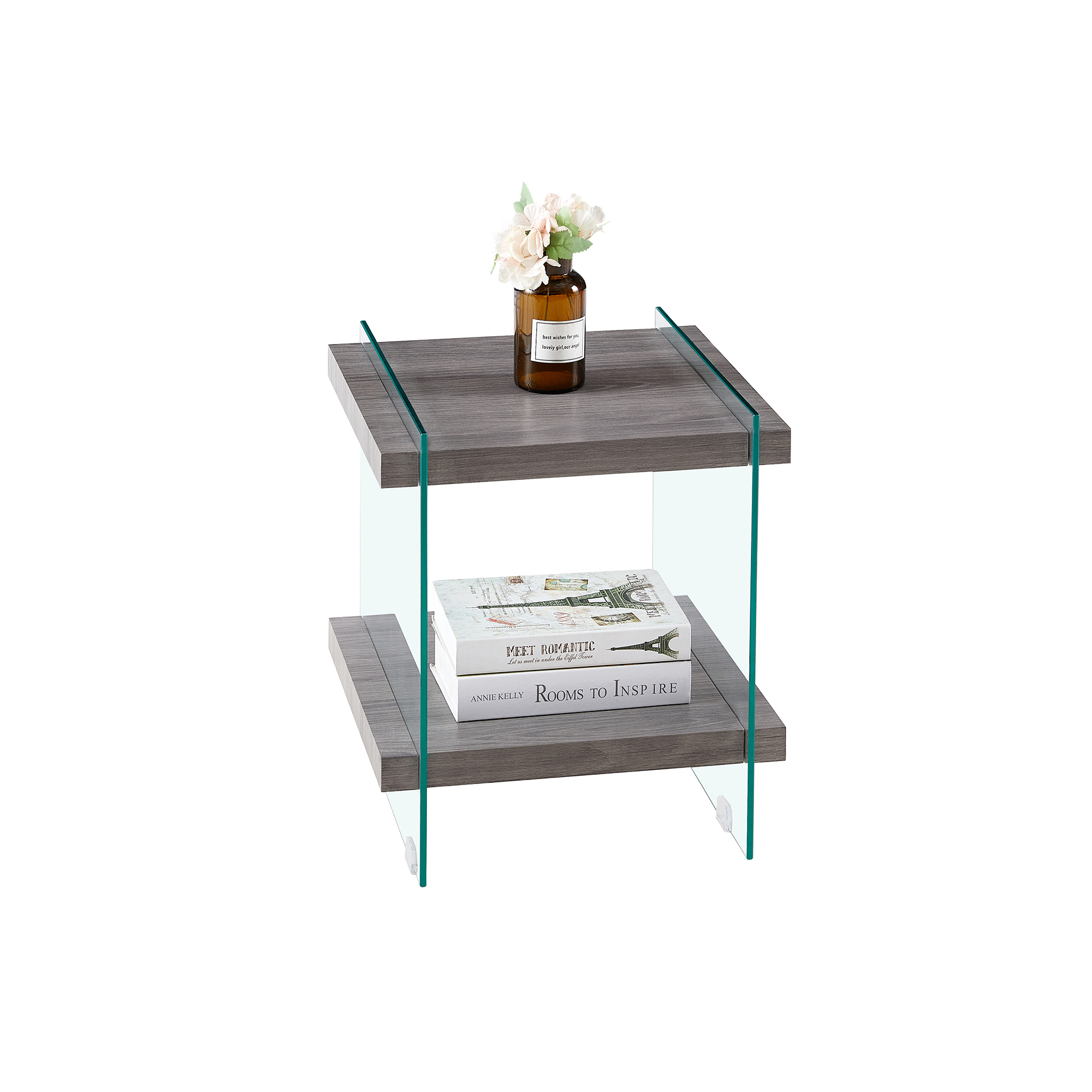 1.Product dimensions: 17.72"*17.72"*19.69"Net weight: 35.64lbsLoad-bearing capacity:220lbs2.High-Quality Material: The table legs are made of 8mm tempered glass and are highly durable. The use of tempered glass ensures that the table is resistant to scratches and wear, making it a reliable and long-lasting piece of furniture.3.Two-Tier Design: The table has two tiers made of MDF, which provides ample space for storage and display. This design is not only functional but also adds to the sleek and modern look of the table.4.Sleek and Elegant Appearance: The table's simple and refined design makes it an attractive addition to any living space. The combination of glass and MDF creates a stylish and contemporary look that is sure to impress.5.Non-slip feature: The table features PVC material on the bottom of its glass legs, which provides a non-slip function, preventing accidents and increasing safety. 6.Easy assembly: The table is easy to assemble, with all hardware and instructions included in the package. The simple and straightforward assembly process makes it convenient for customers to put together and enjoy the table in no time.