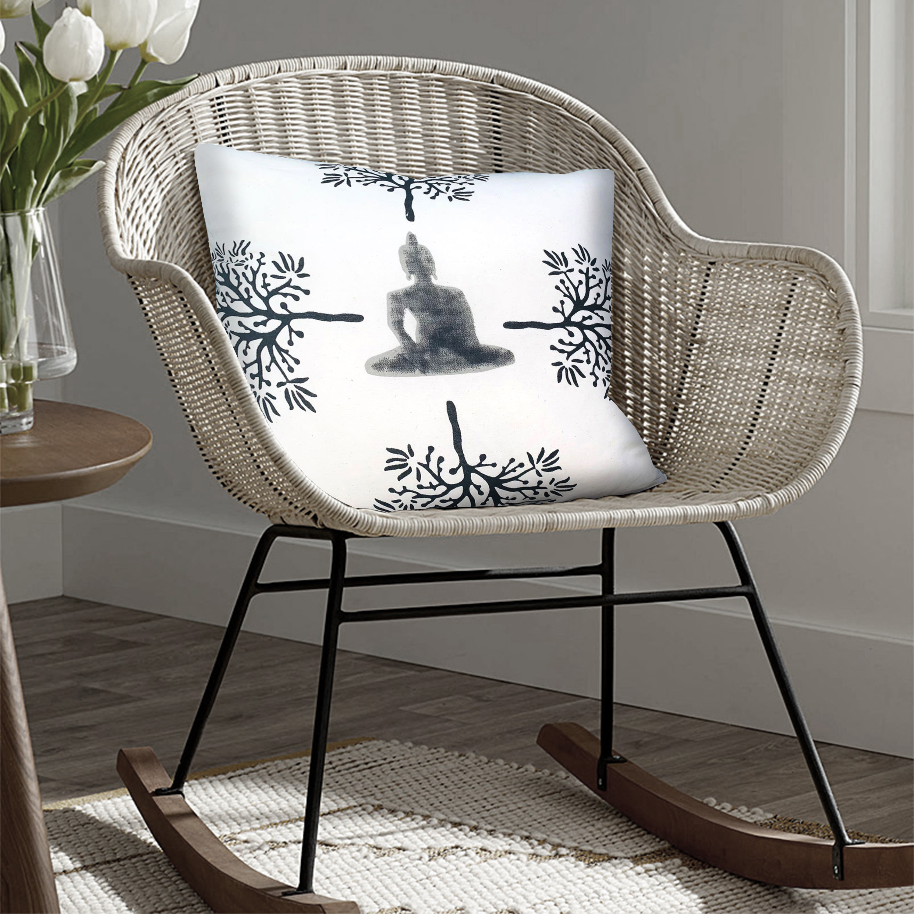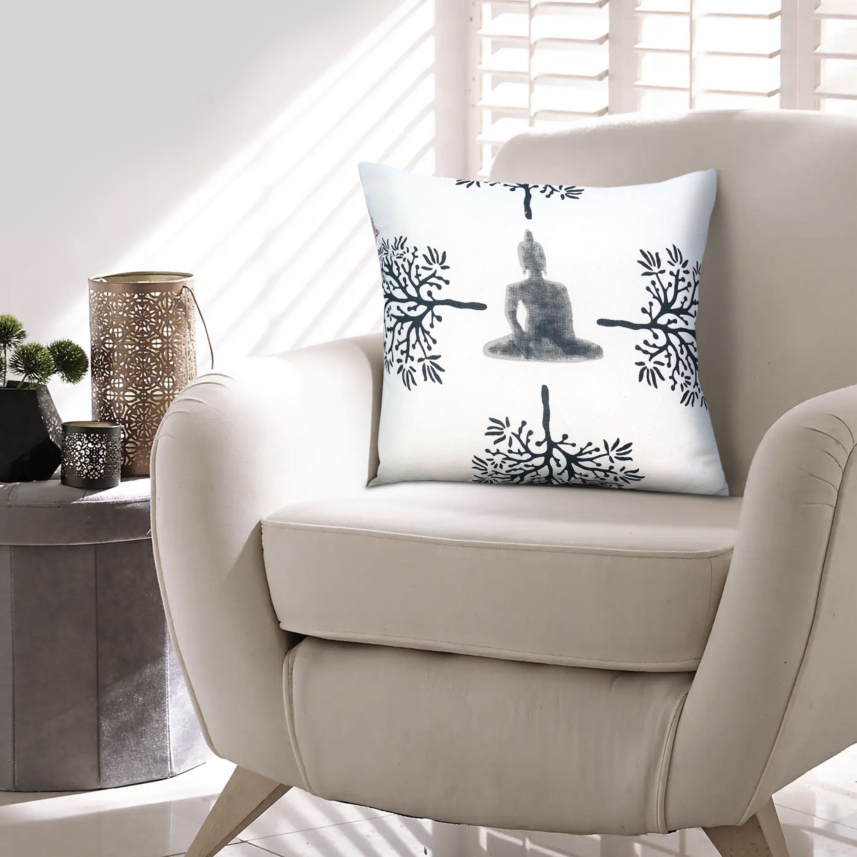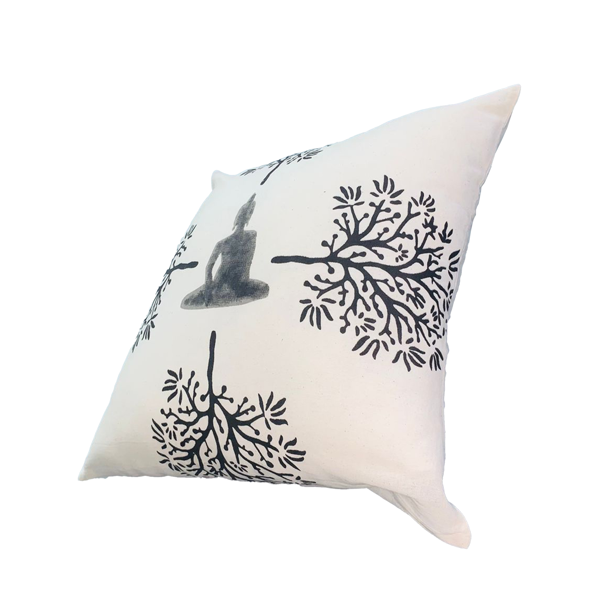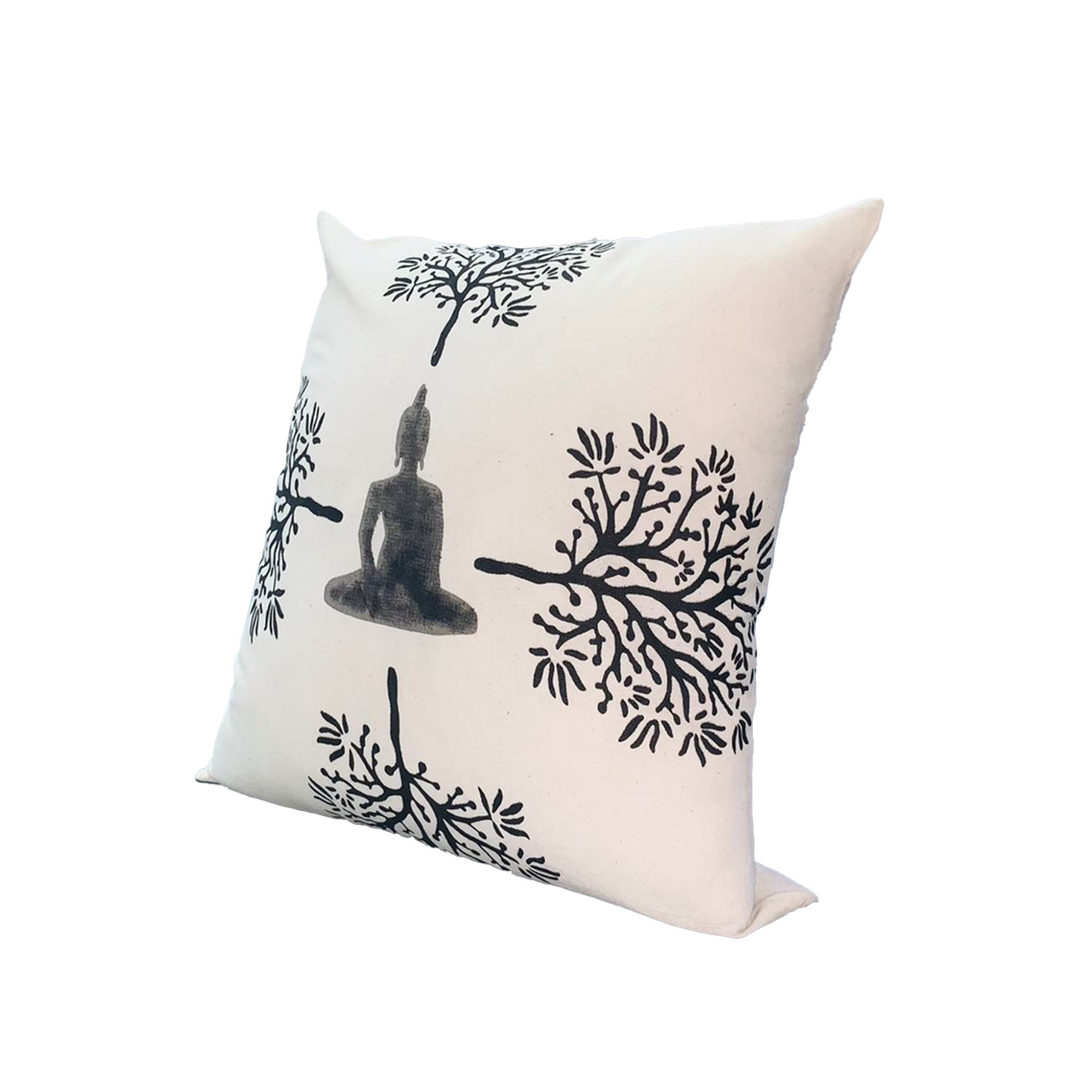 With an essence of tranquility and calmness, this accent pillow is sure to add a remarkable character to your interior decor. Depicting the buddha mid meditation and surrounded by trees, it includes durable stitching along the edges, perfect for the long time durability of the piece, and is crafted from plush cotton fabric. The gray tone print complements the white accented background, creating a contrasting and striking appearance. Whether on your sofa, loveseat, accent chair, or bedding, it easily blends in with a variety of decor settings.