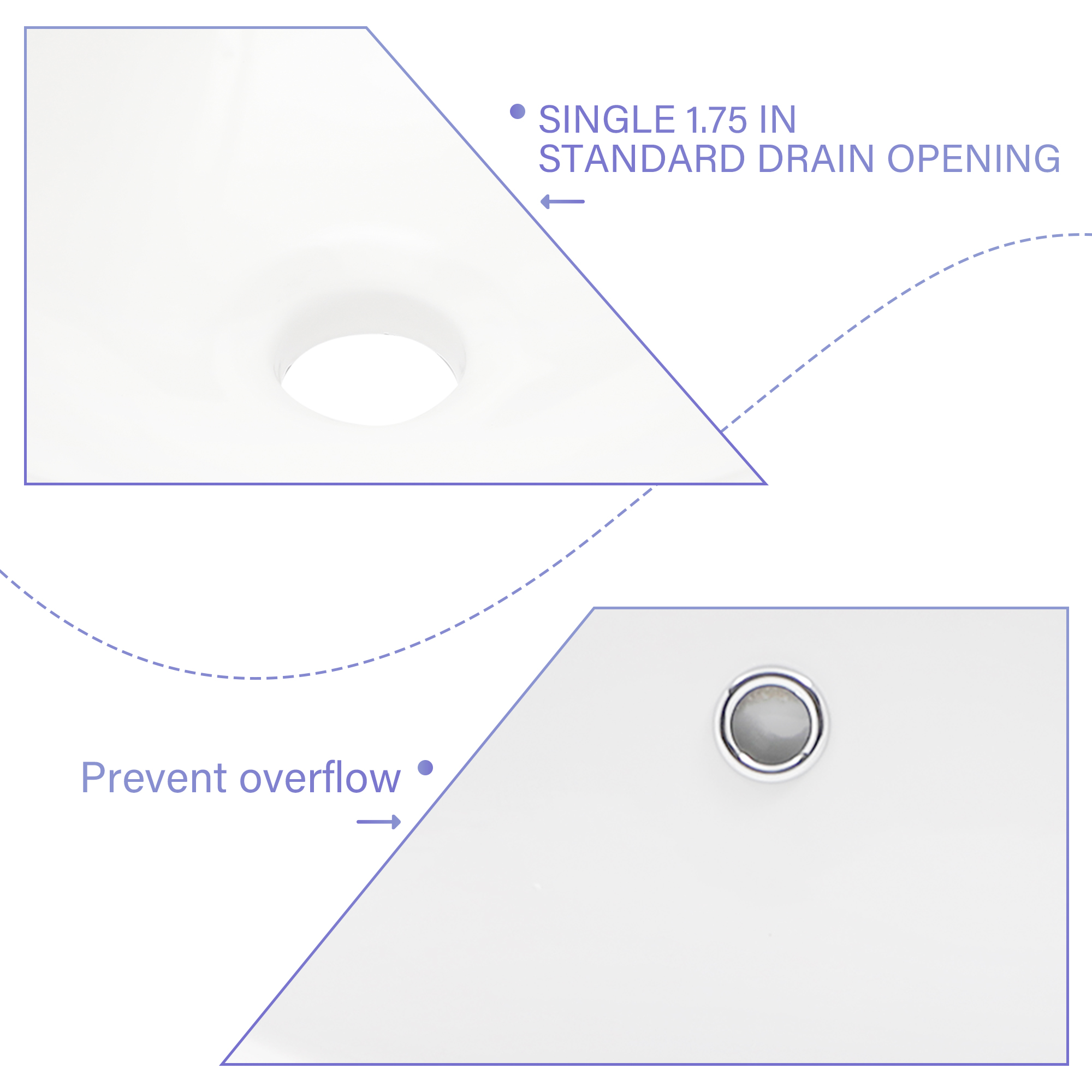 - No faucet holes, requires wall or counter-mount faucet.