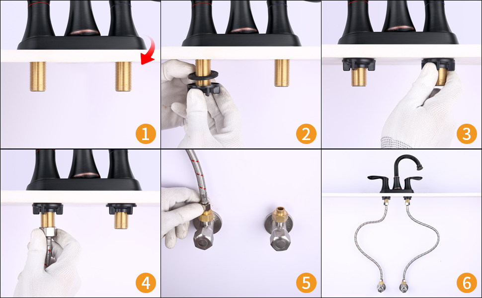 1. OVERALL MEASUREMENTS: Height:10.06"; Spout Height:4.99"; Spout Reach:4.69".2. MODERN DESIGN: Two-Handle installation for effortless flow and water temperature control. 3. PREMIUM QUALITY: Solid brass plastic casting body construction ensures durable use 4. ACCESSORIES: Hot and cold flexible hoses(23.6 inch long) and pop up drain are included.