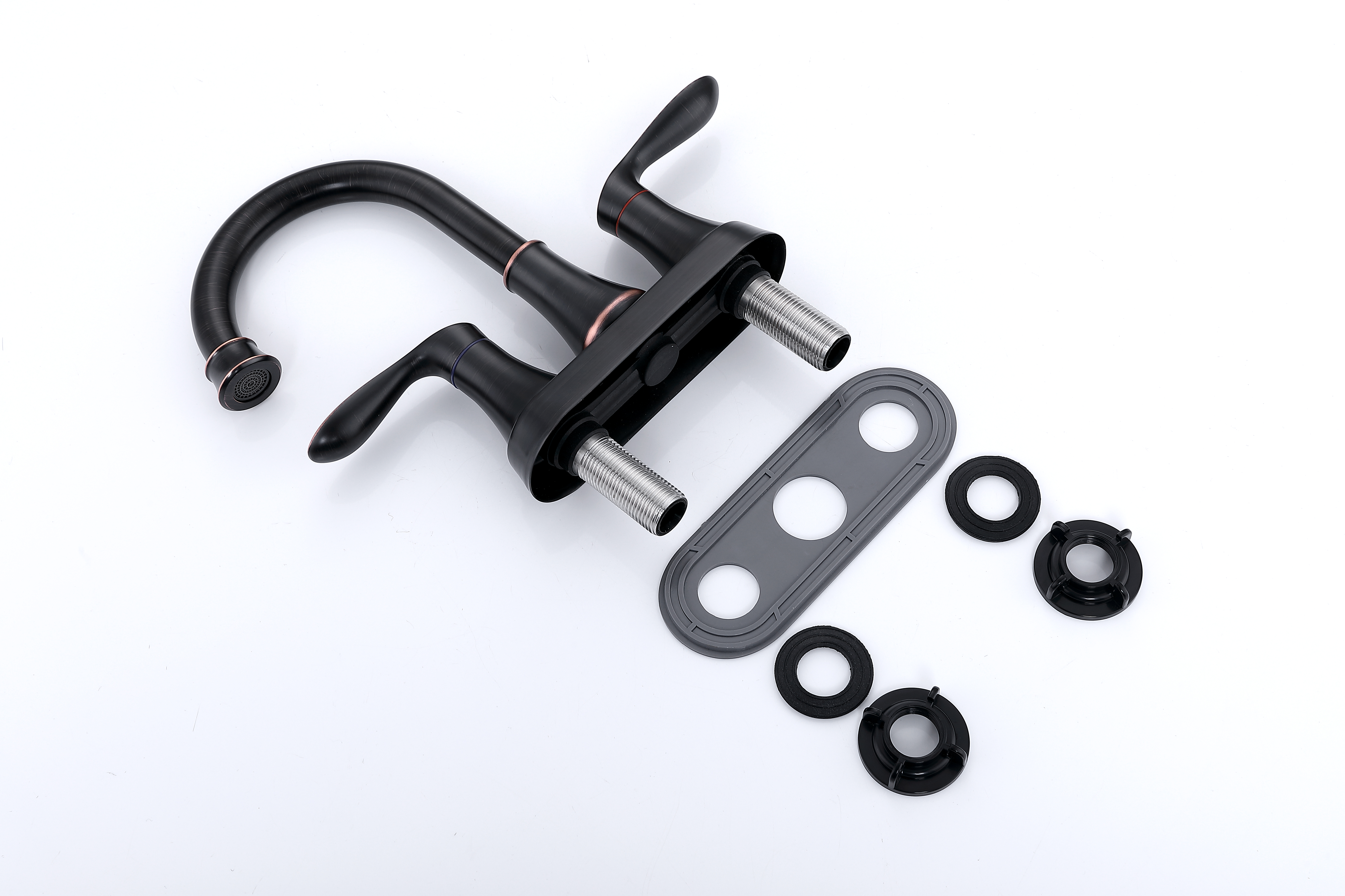 1. Item Weight: 3 pounds2. Package Dimensions: 14.1x7.2x4 inches3. Color: Oil-Rubbed Bronze4. Style :Modern5. Finish: Oil Rubbed6. Material:Plastic casting7. Number of Handles 28. Handle Material :Zinc9. Plug Profile: Deck Mount10.Batteries Required? No