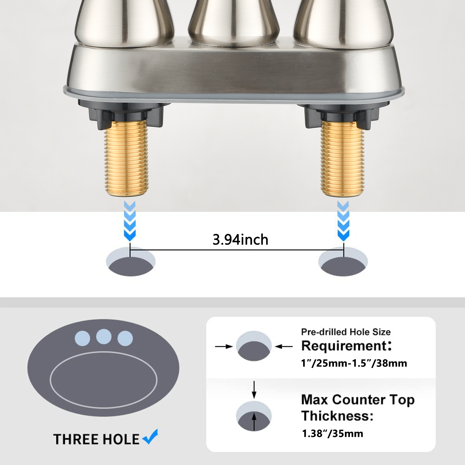 Installation Type: CentersetNumber of Installation Holes: 2Faucet Design: MeteringFinish: Brushed NickelSupply Lines included: YesMaterial: zinc alloyPieces Included: Bathroom faucetLead Free: YesMount: Surface MountedSoap Dispenser Included (With Soap D ispenser Soap Dispenser): NoDeck Plate Required: NoDrain Assembly Included: yesNumber of Handles: 2Weights & Dimensions:
