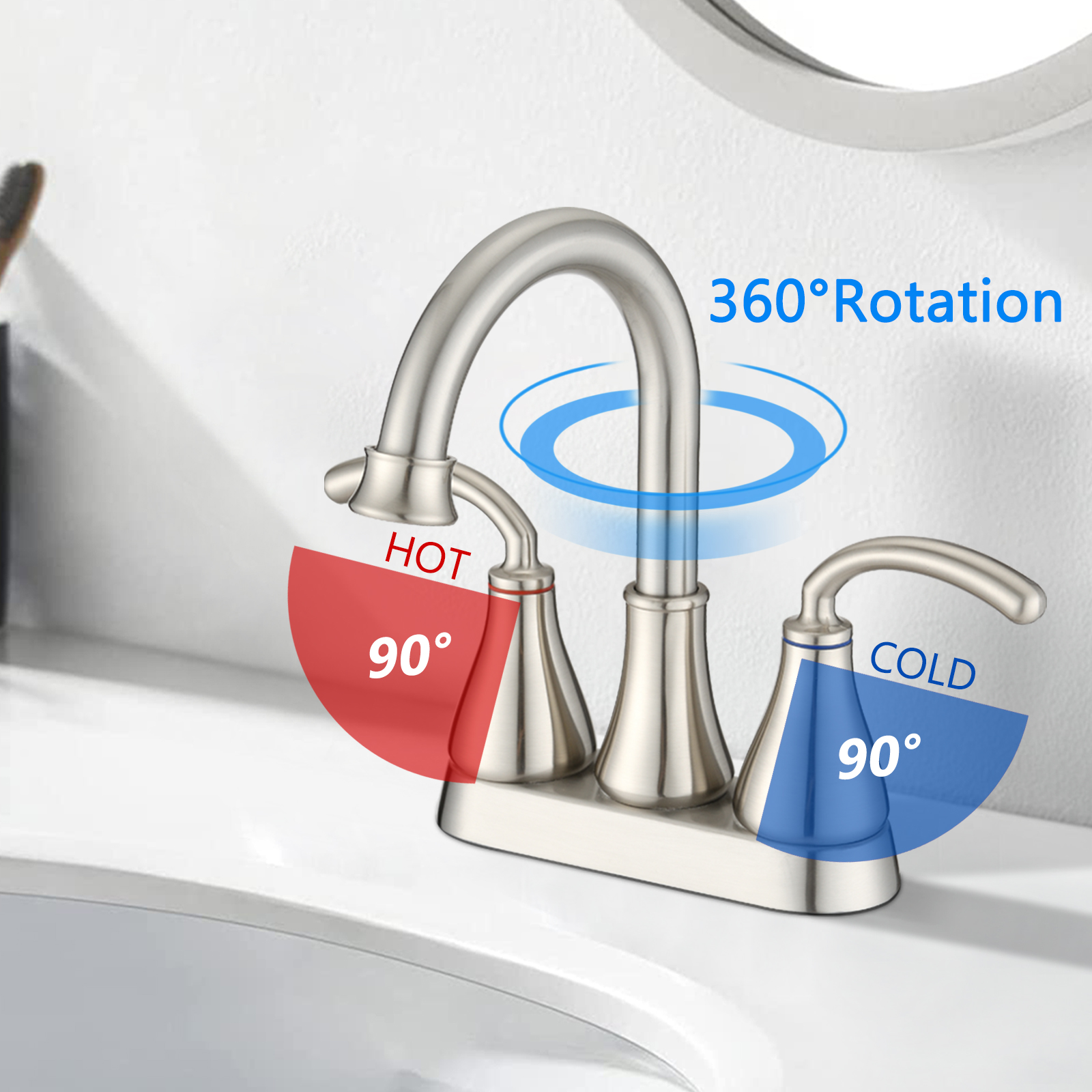 2-handle lever handles make it easy to adjust the water.Aerated flow is ideal for everyday bathroom tasks.High-arc spout for enough sink space and clearance, Washing is more convenien.The ABS aerator the water flow is dense and soft without splashing,improve water efficient. Premium material construction for durable and reliable; Lead-Free, non-toxic and rustproof, you can use it with confidence.360 degree swivel nozzle supply full range of washing for your bathroom sink.Features: