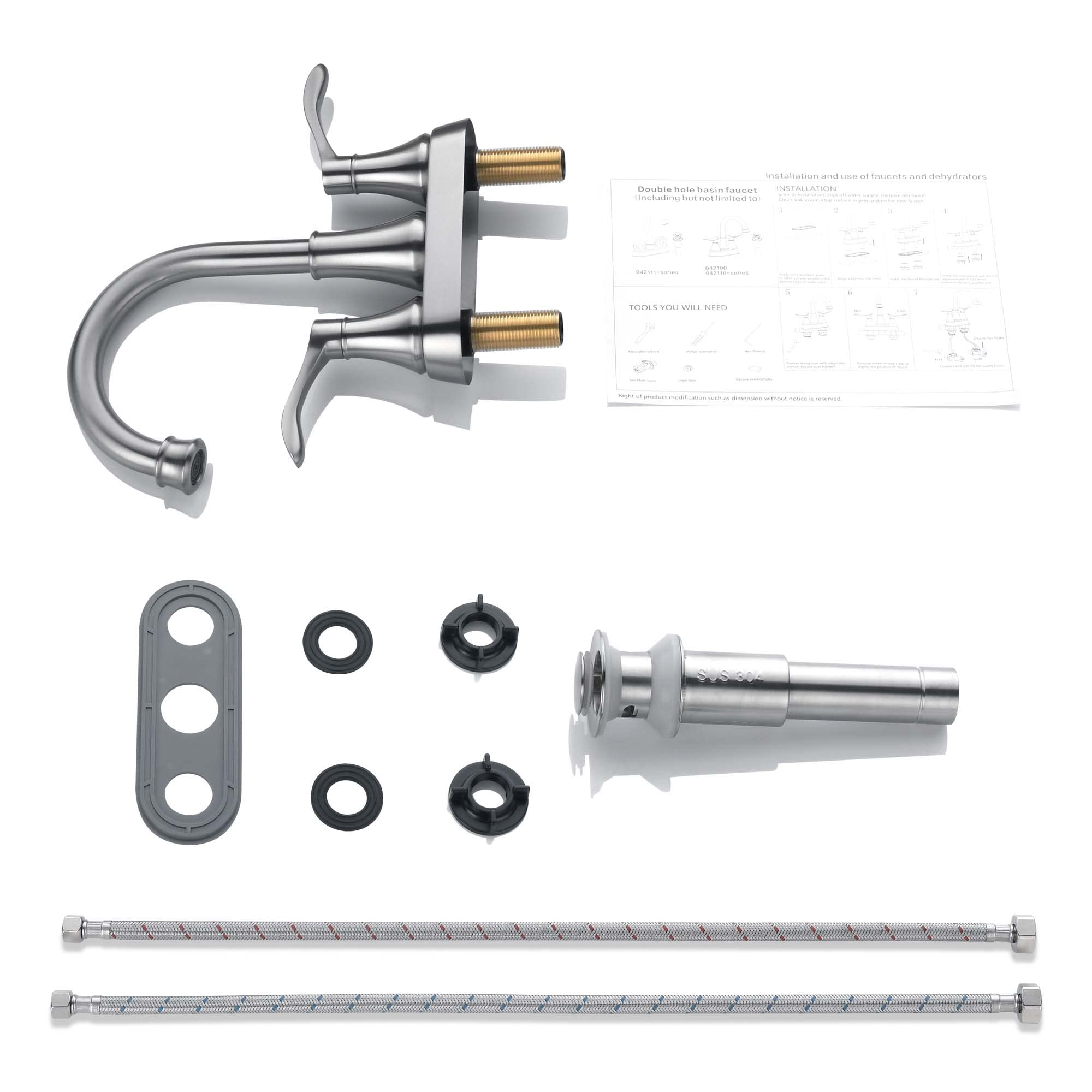 𝐏𝐚𝐜𝐤𝐚𝐠𝐞 𝐋𝐢𝐬𝐭: 1x 2 handle Vanity Faucet, 1x pop-up drain assembly, 2x stainless steel hot and cold water supply pipe, 1x installation manual and other necessary accessories, Complete accessories, and easy installation
