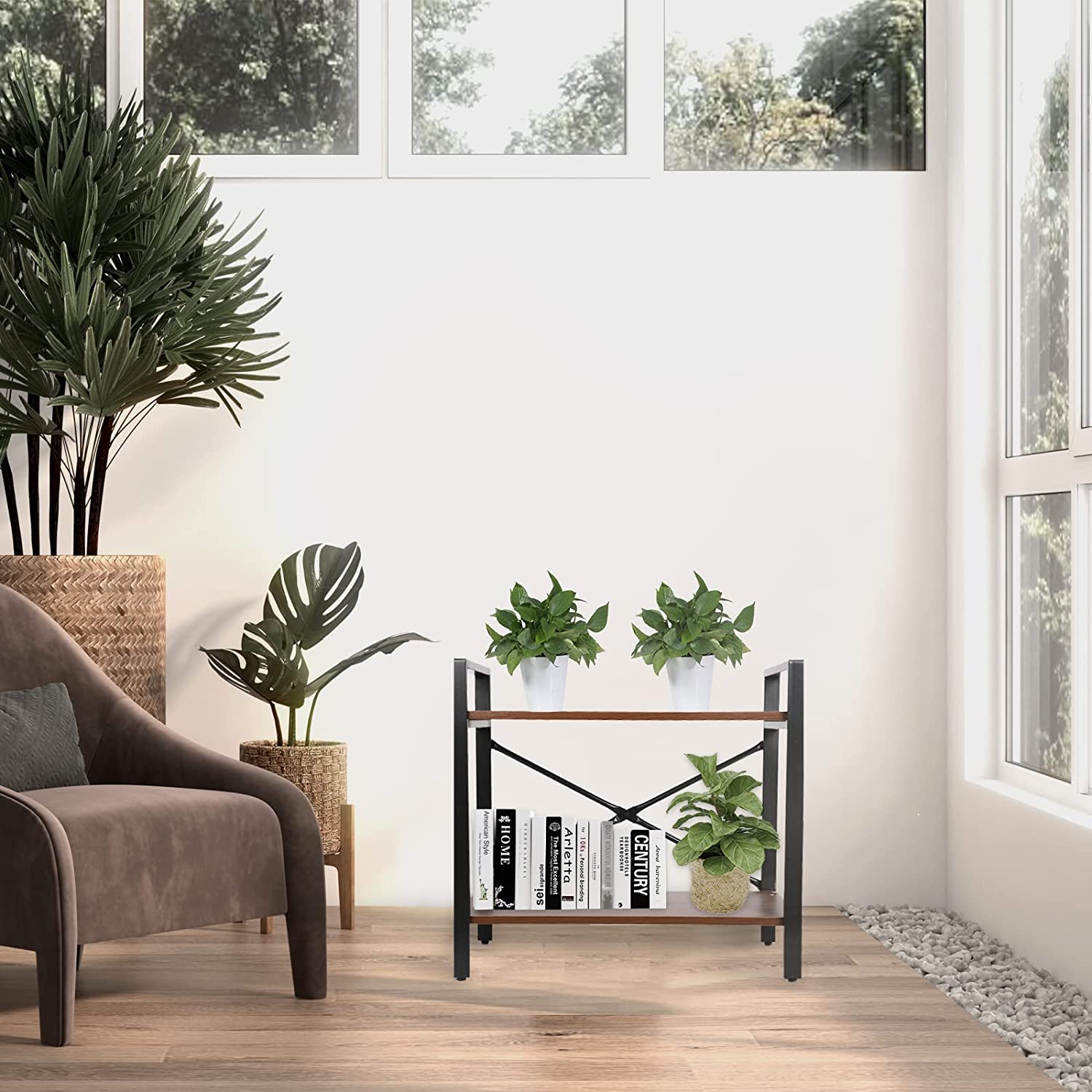 2 Tier Frame Bookshelf, Small 2 Shelf Wood and Metal Bookcase, Vintage Storage Rack with Open Shelves, 23.6”x12.6”x21.6”, Double Layer Wooden Shelf for Entryway, Hallway, Living Room,Rustic Brown