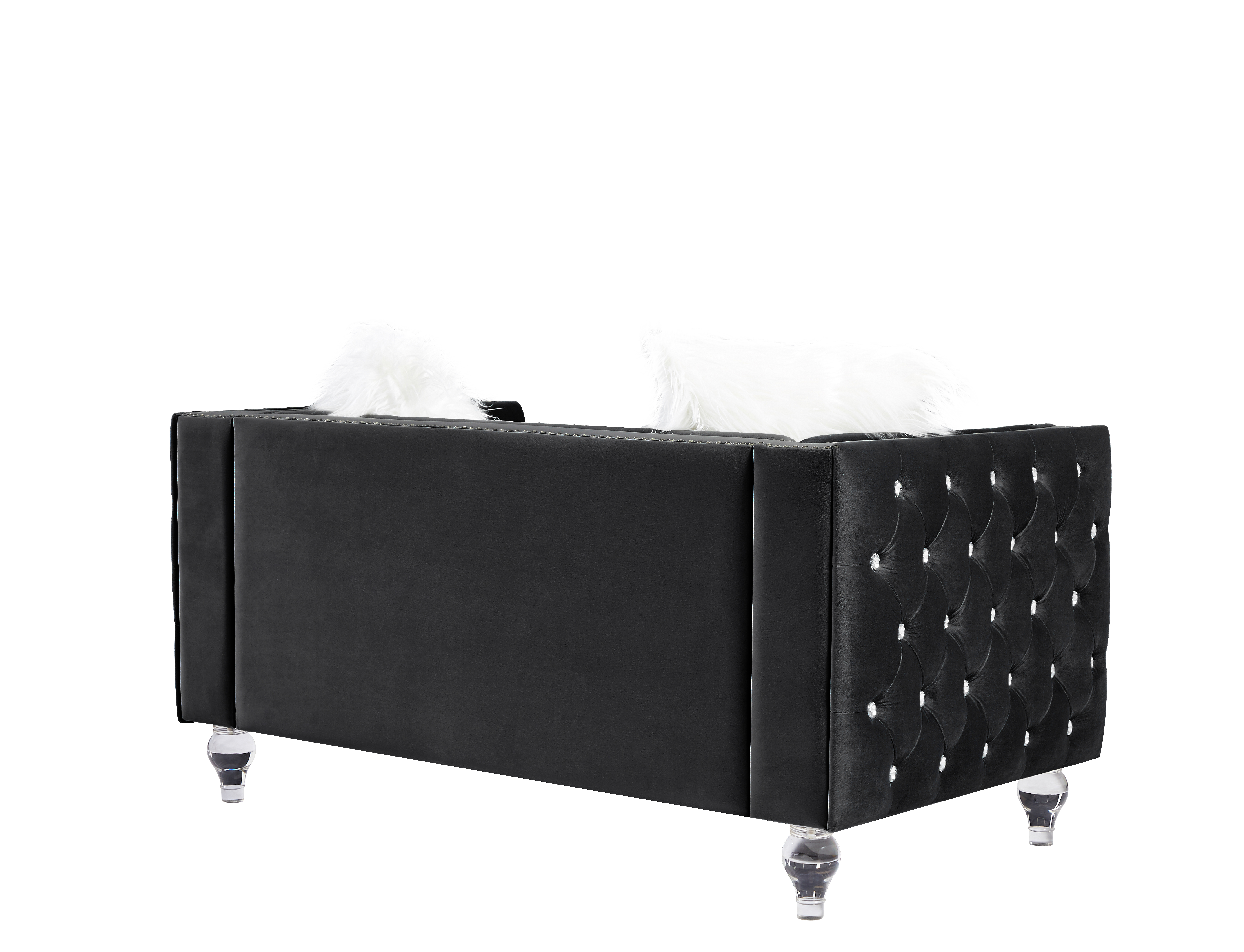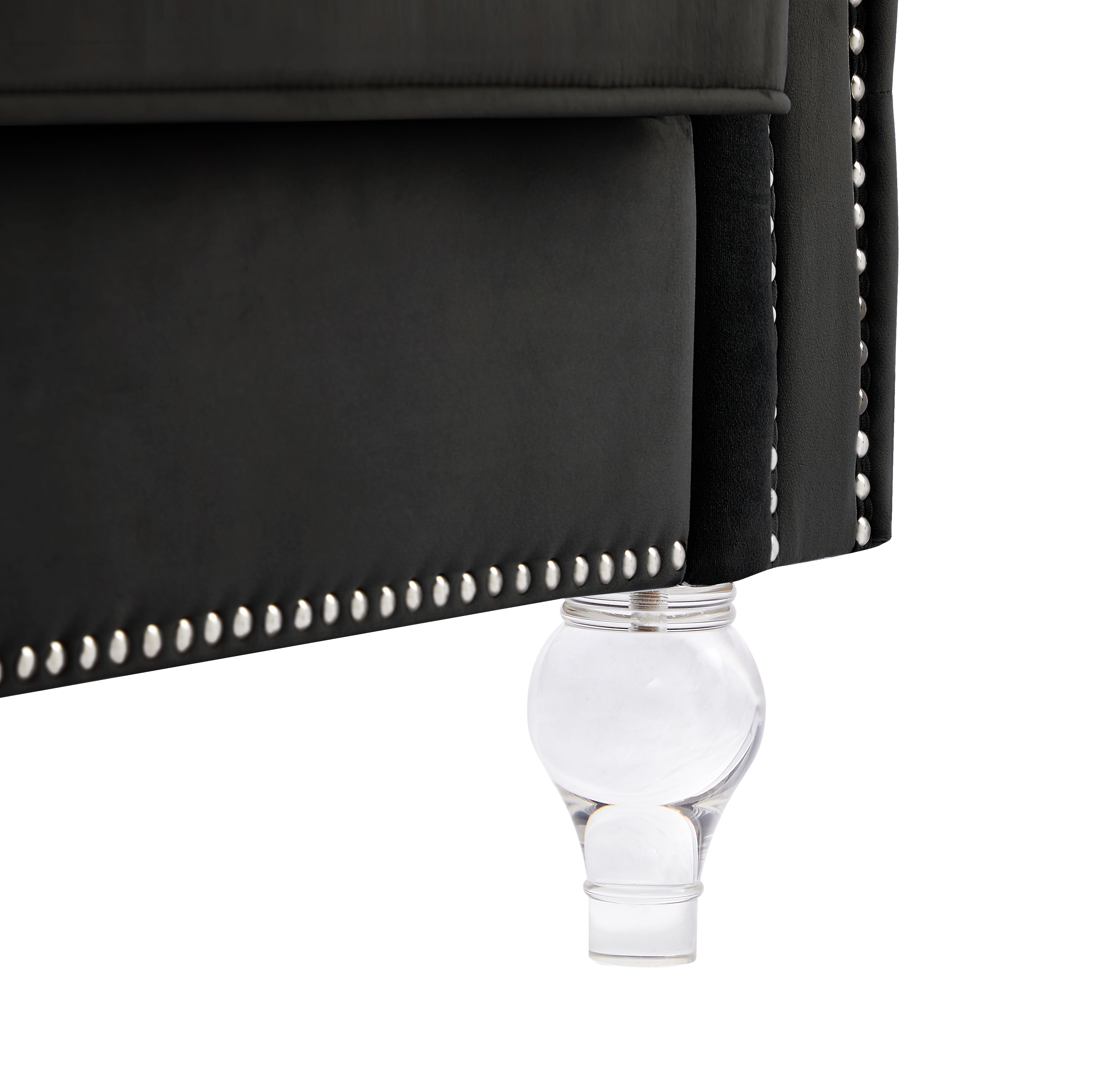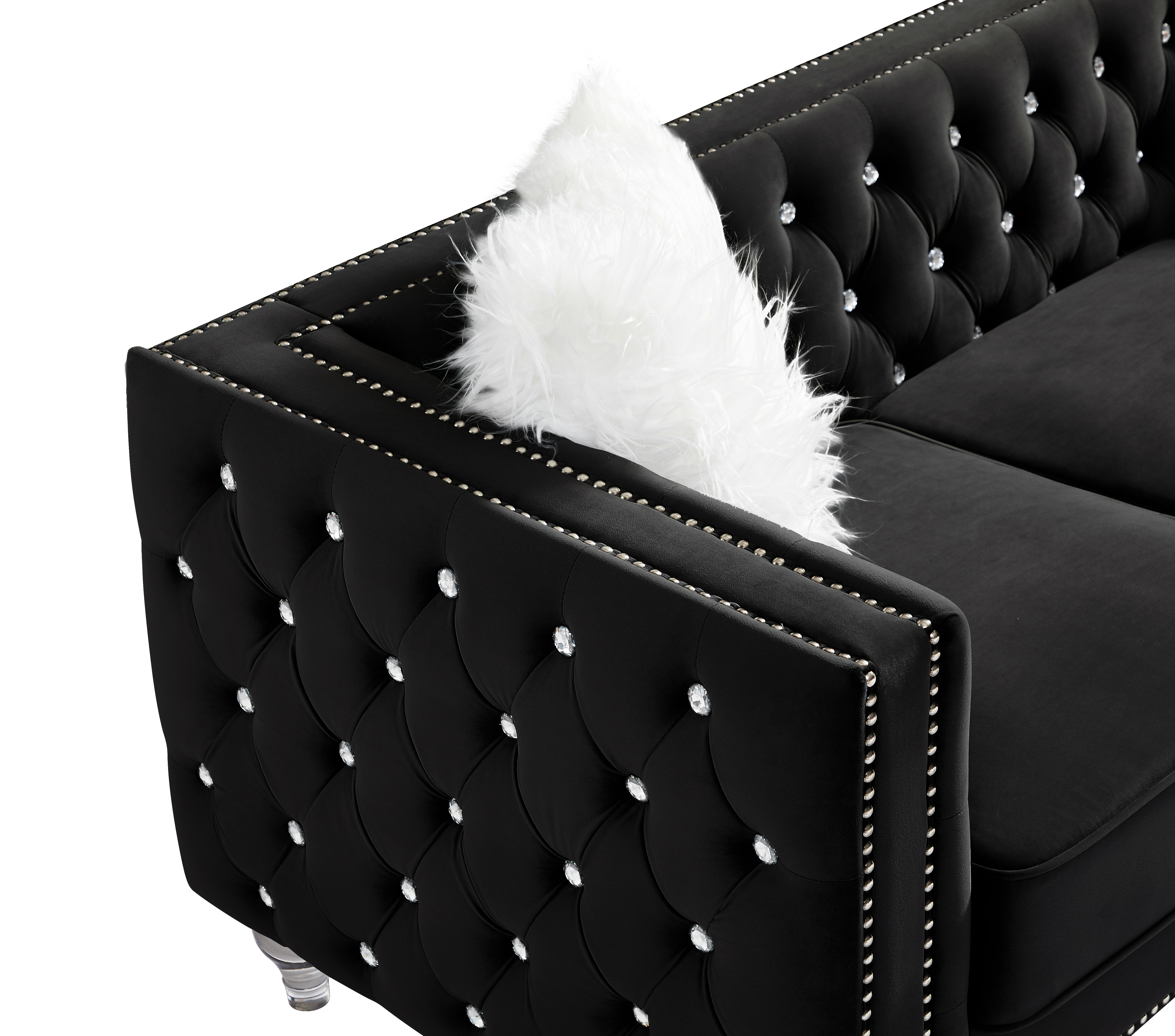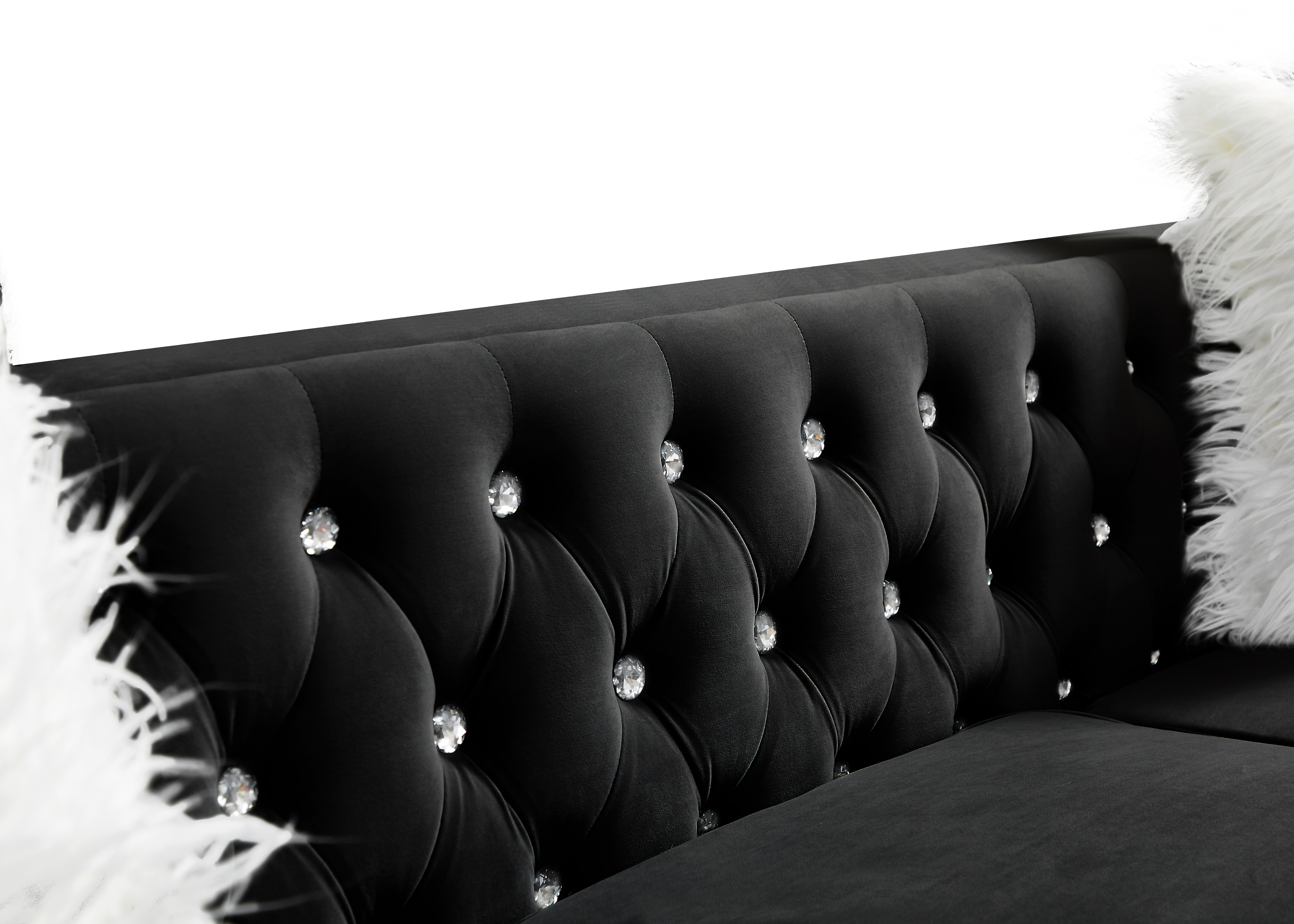 2069 Velvet Sofa - BlackEmbossed stripes for more modern featuresMetal squares inlaid on the armrests echo the hardware feet in the same colorSquare armrests2 pillowsSerpentine springs + spring packageEucalyptus wood frameMetal hardware feet2 wraps