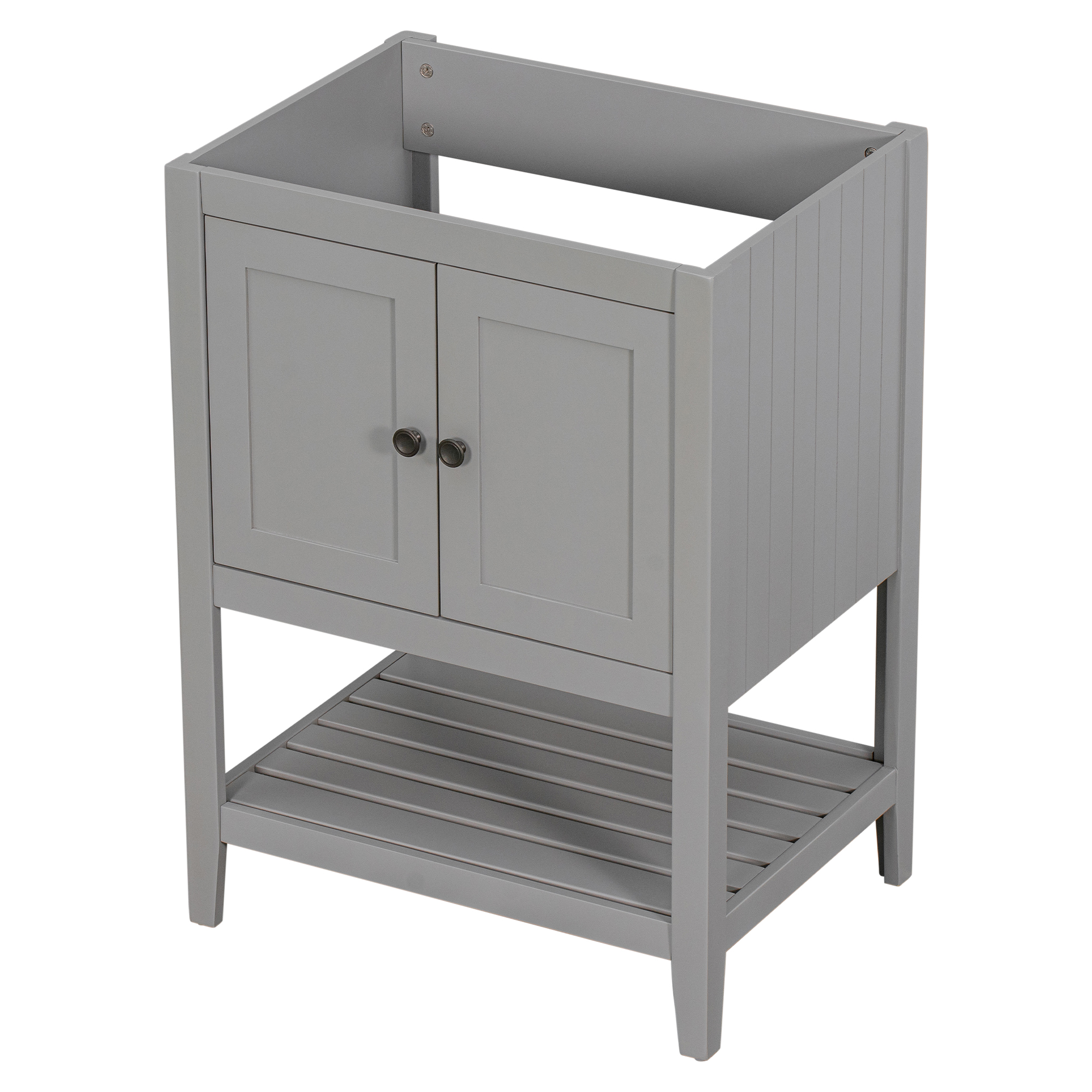 Demonstrate beauty and grace with the 24" grey bathroom vanity base to your room. The vanity's frame is crafted out of solid wood and features a painted finish, with a groove pattern design, tapered feet, and metal hardware for an added element of beauty and grace. Fully finished inside and out ensures that the vanity is water and moisture-resistant. The storage cabinet with two doors and an open shelf allows a big space to store your essentials.