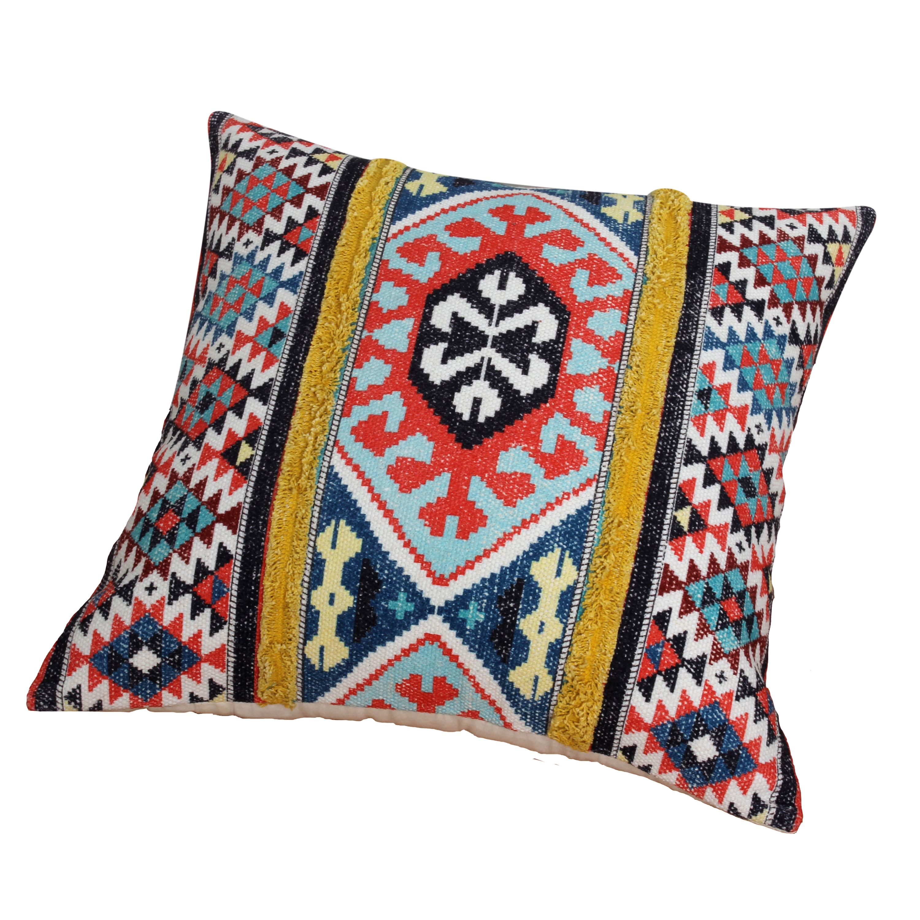 With a bright multi tone finish, this square accent throw pillow makes a gorgeous fit for your sofa set, bed set pieces, or accent chairs. Depicting a tribal inspired kilim pattern, the rich siliconized polyester fiber fill provides you with a cozy and fuzzy experience any time of the day or evening. Wrapped in an ultra soft cotton fabric, the trimmed fringe details add elegance and uniqueness to its look. With a clean square shape, this piece is stylish, contemporary, and trending, perfectly matching a wide variety of decor styles.