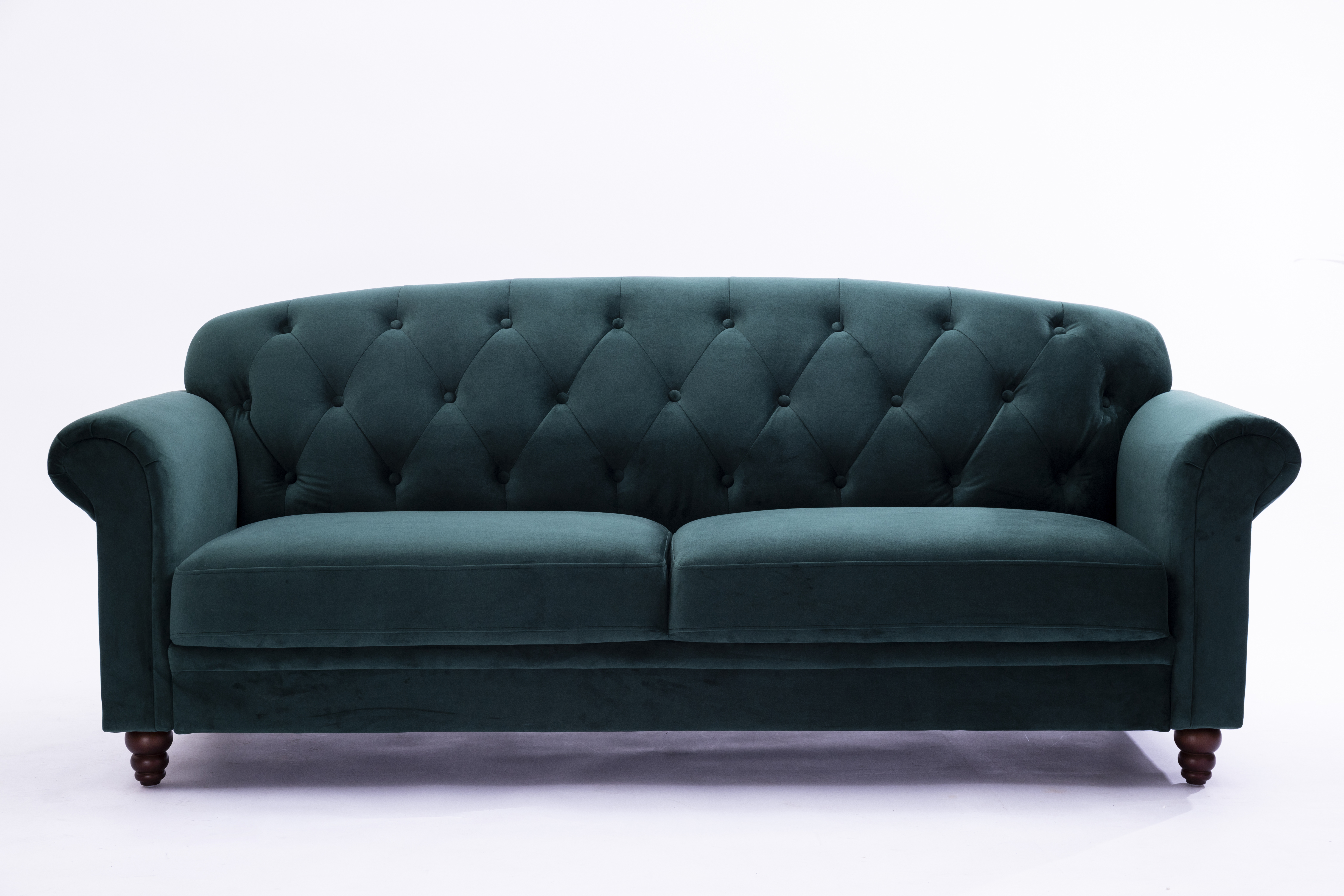 Product Features:1. Stylish appearance: This sofa uses velvet fabric upholstery to create a stylish look, blending vintage style and modern style, flannel button backrest and roll-up arm design to make its appearance more refined, and evenly distributed stitching to make it more comfortable. 2. Sturdy and durable: The sturdy wooden frame and stylish wooden feet give this sofa excellent support, which can bear a weight of 300 pounds per seat.3. Comfortable seat: The seat cushion is filled with highly elastic foam and velvet fabric padding to provide comfortable support for your body when sitting down, and easily regain shape when you get up.4. Easy to assemble: please refer to the installation instructions for details.5. Suitable for any scene: This sofa can be perfectly matched with any style of home decoration. The fresh look brings comfort to your living space and a sense of pleasure to your mood, and can be applied to any apartment, studio, living room, bedroom.