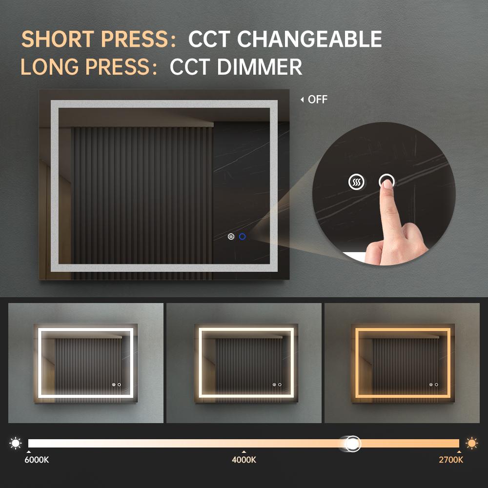 Adjustable Color Temperature. Short touch(<1s) Adjust the color temperature. 3 Color temperature 2700K ~ 6000K dimming. Simulate natural sunlight to protect your eyes. Warm, relaxing tones (2700K) replicate indoor light to help you unwind before bed or ease into your morning.This vitality lighted mirror offers remarkably accurate color rending at 90+ CRI, so you can see your truest reflection.