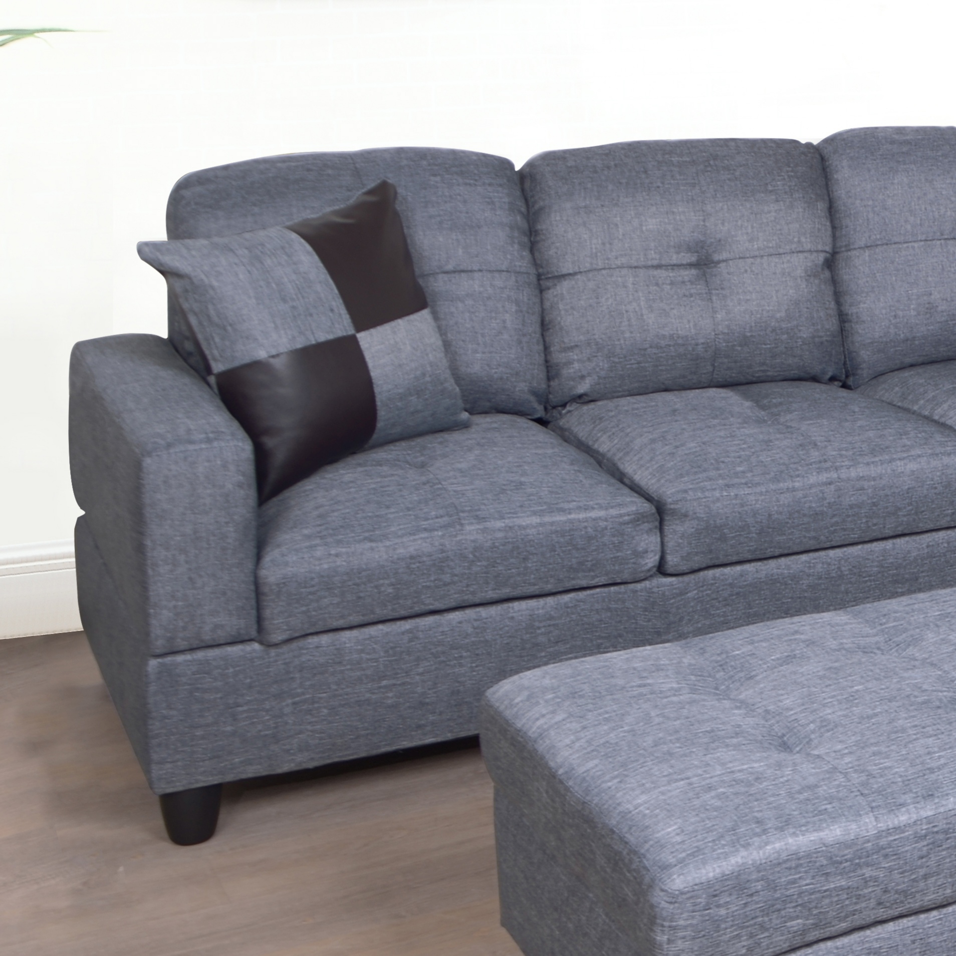 Sofa upholstery material: Microfiber and faux leather Package included: 2-piece sectional sofa set with a storage ottoman, 2-picese square pillows,
