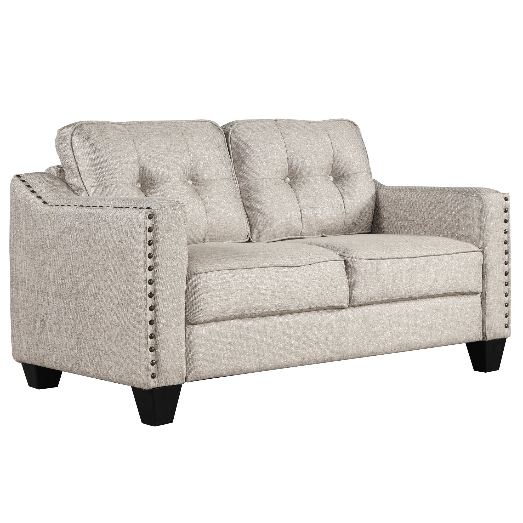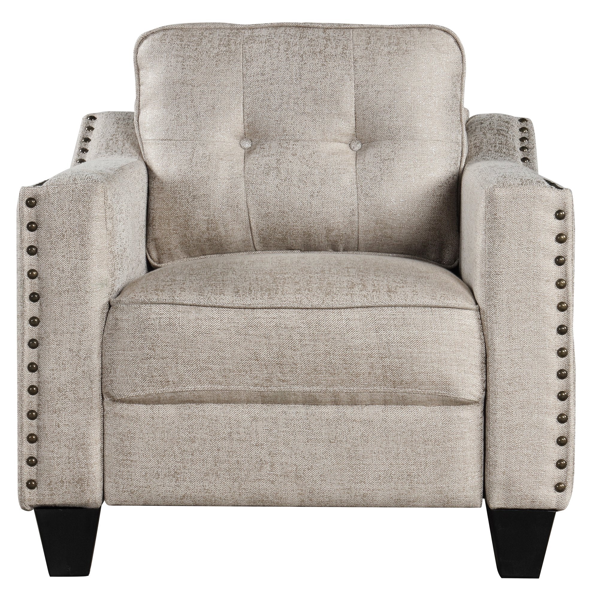- Contemporary Style:The perfect pick for meeting your aesthetic needs, this set features a contemporary look and a streamlined silhouette. The brass nail head trip tastefully line the edges while the gilded patterned fabric offers a natural sheen featuring button tufted back cushions for a polished accent.