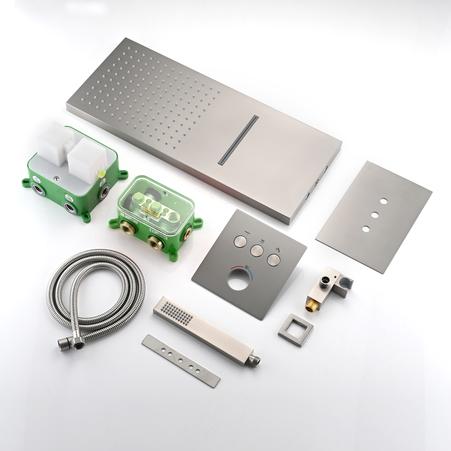 - Thermostatic Shower Valve: The thermostatic regulator eliminates annoying temperature fluctuations. The 38°C safety lock prevents children from playing and setting the water temperature too high. Especially suitable for families with children and the elderly. Three functions shower valves (Rain, waterfall, handheld shower) are controlled by an independent button.