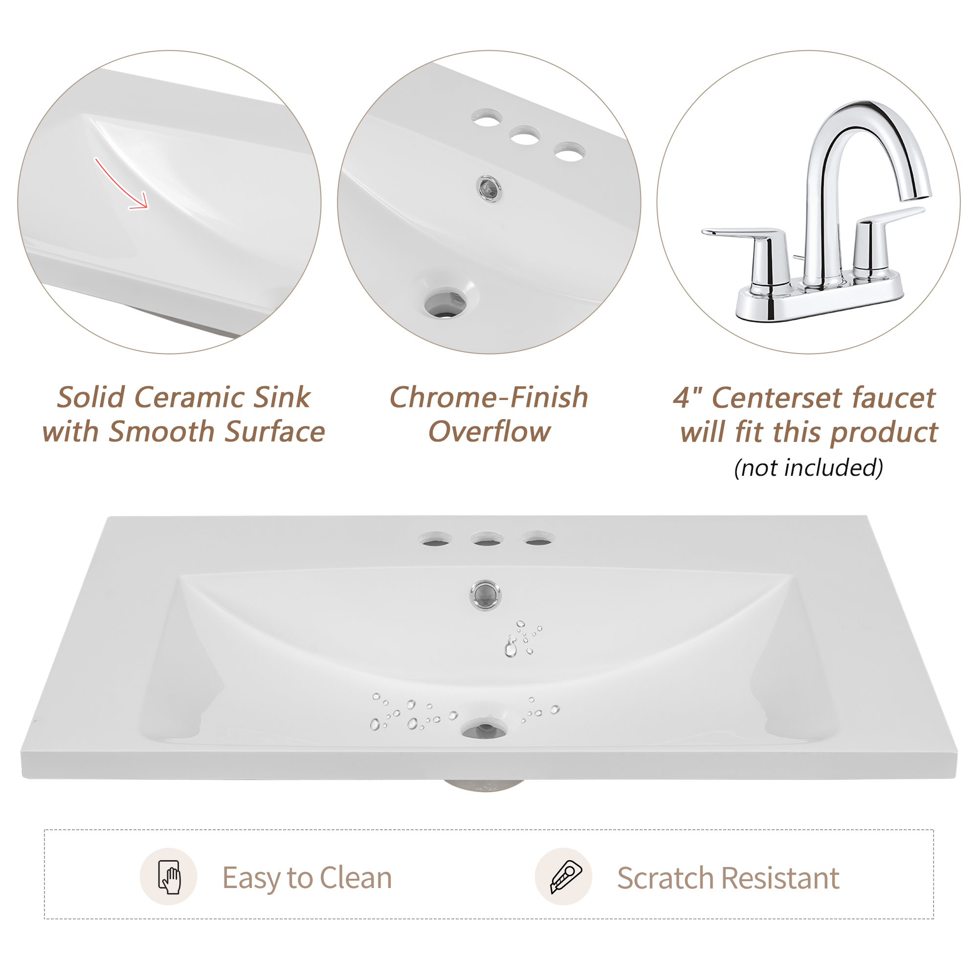 Our bathroom basin sink is made of solid ceramic with smooth and water-proof finish, which hardly leaves water stains. The pre-drilled three holes on the top is available to 4" centerset faucet (not included). Besides, the overflow with metal circle is in case of water spilling over when you forgot to turn off the tap.