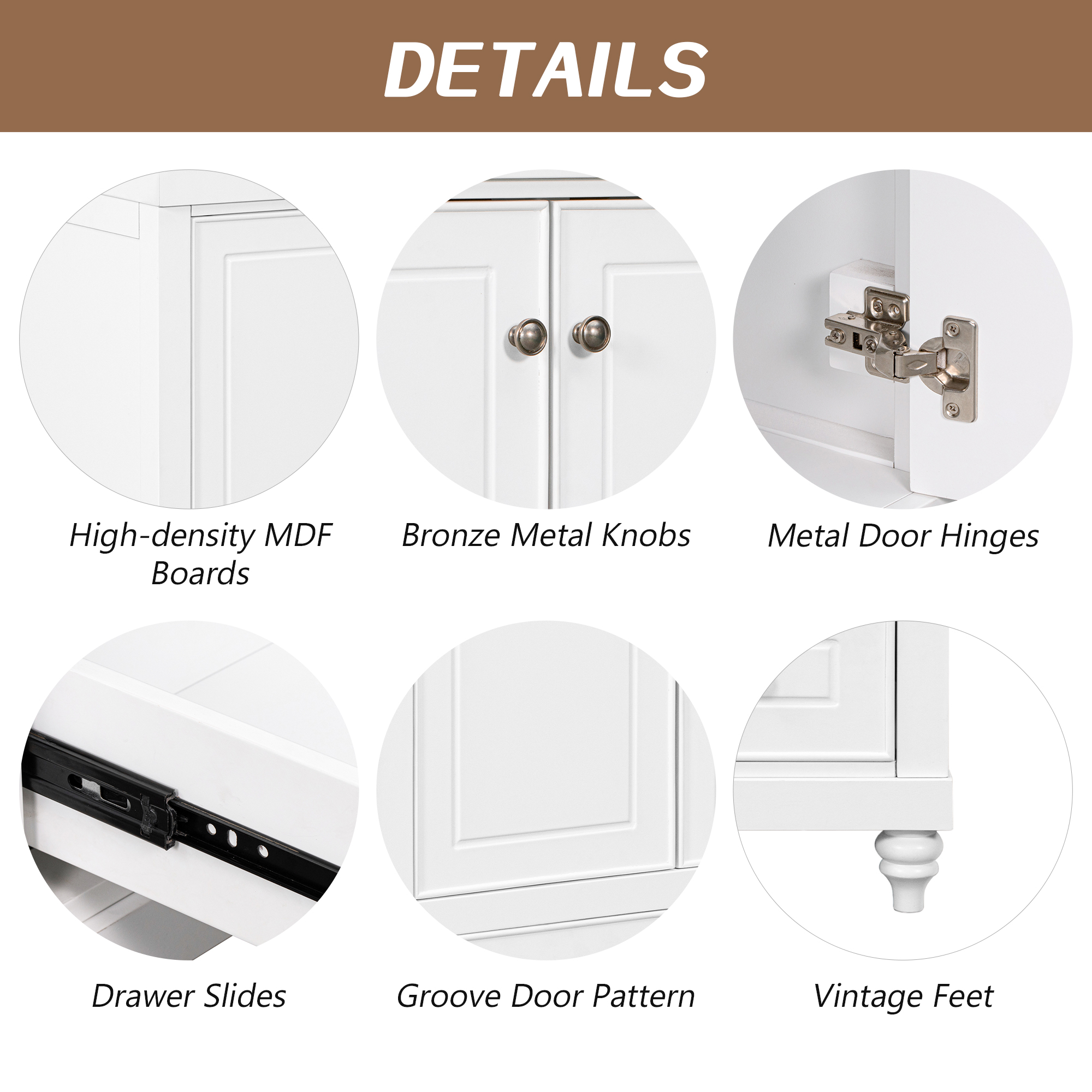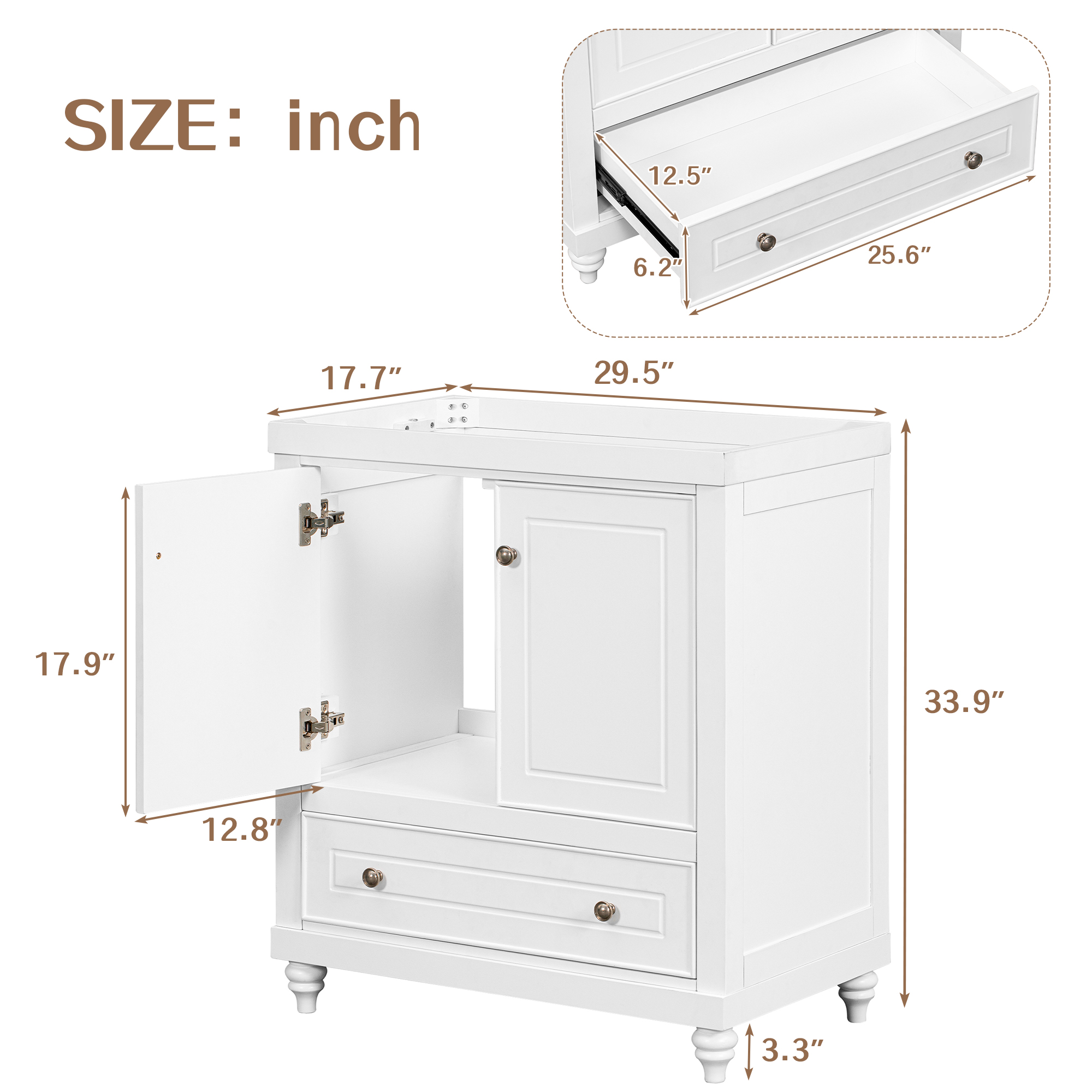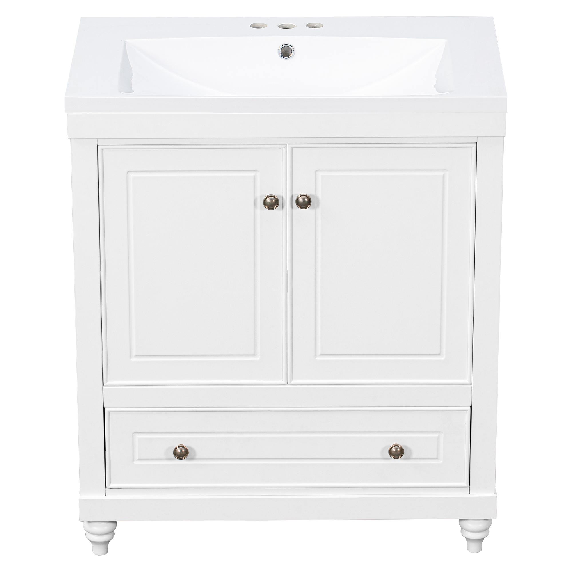 This 30" bathroom vanity is suitable for bathroom in any decoration style. Freestanding white vanity cabinet with bronze handles complies with your bathroom facilities. The groove design on the door and drawer increases the artistry and aesthetics of the home environment. If you're looking for a simple but stylish bathroom sink vanity, our product will be a great choice to upgrade your bathroom.