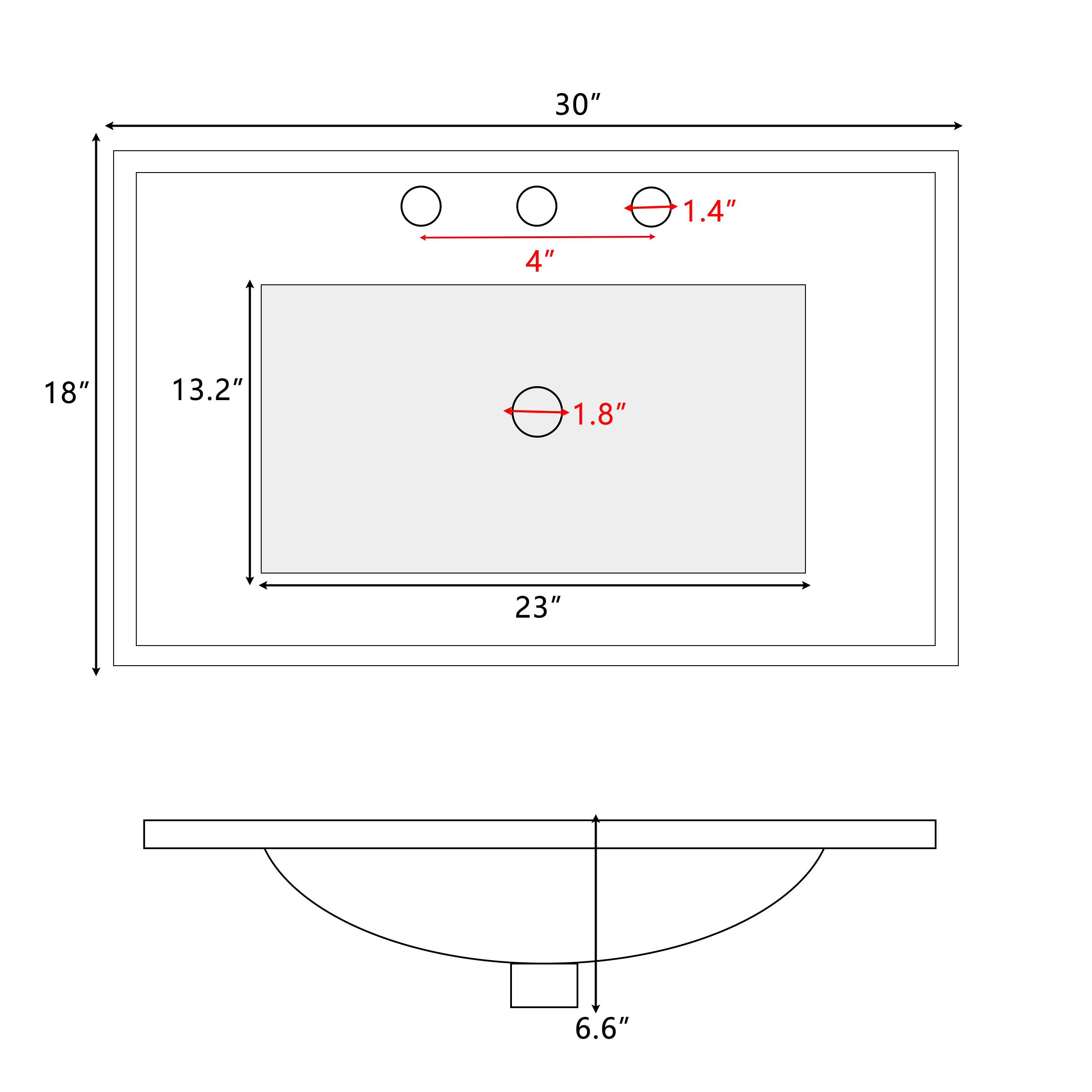 30" Single Bathroom Vanity Top with White Basin, 3-Faucet Holes, Ceramic