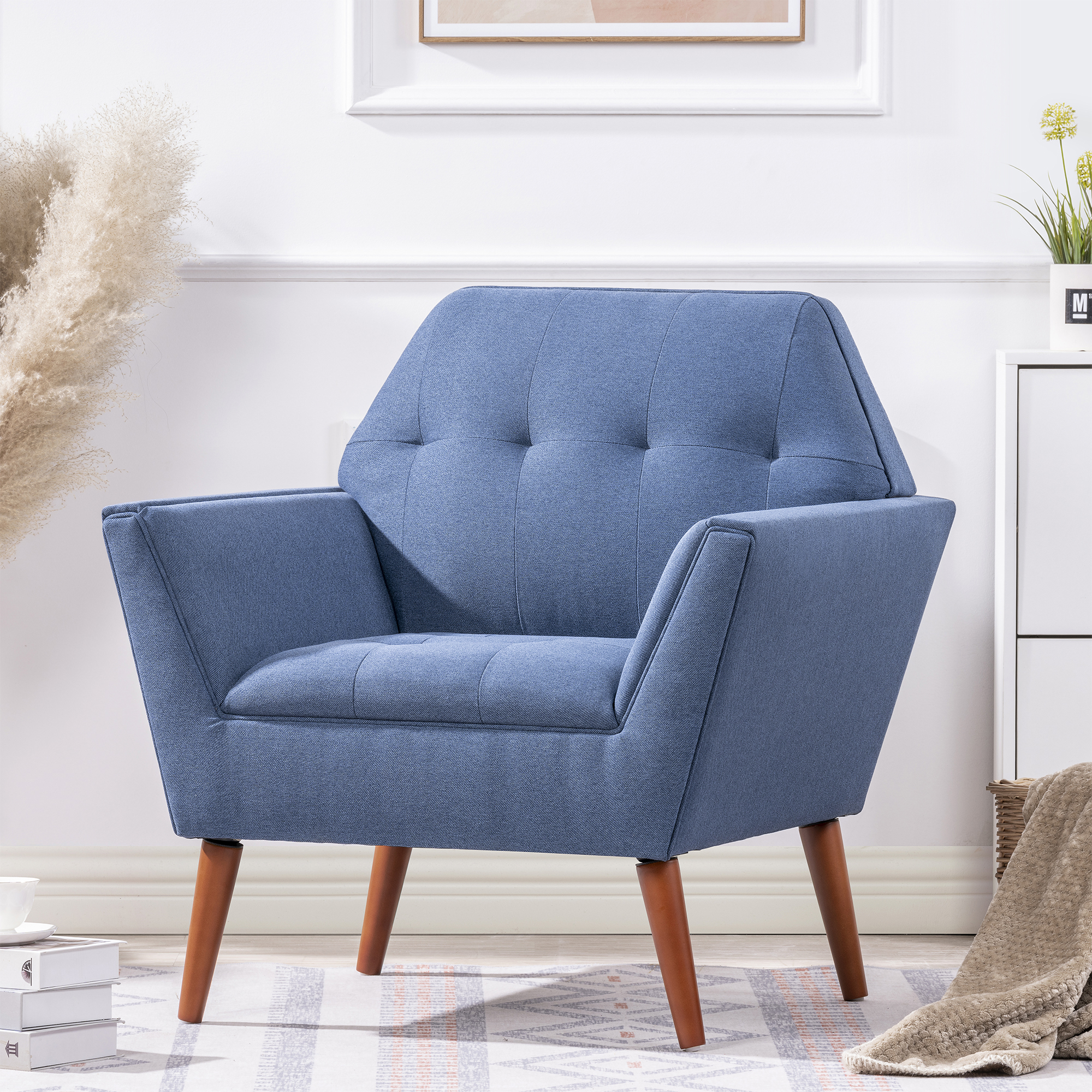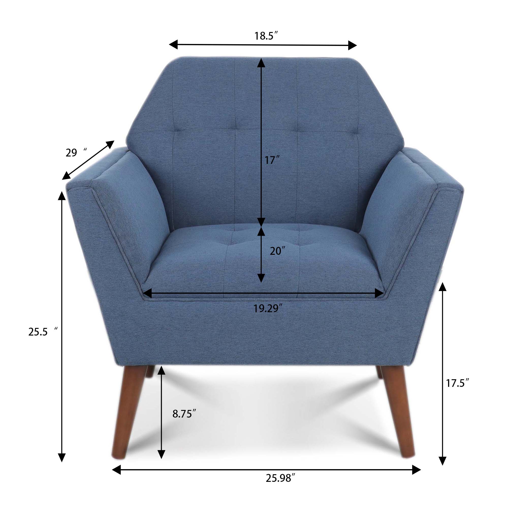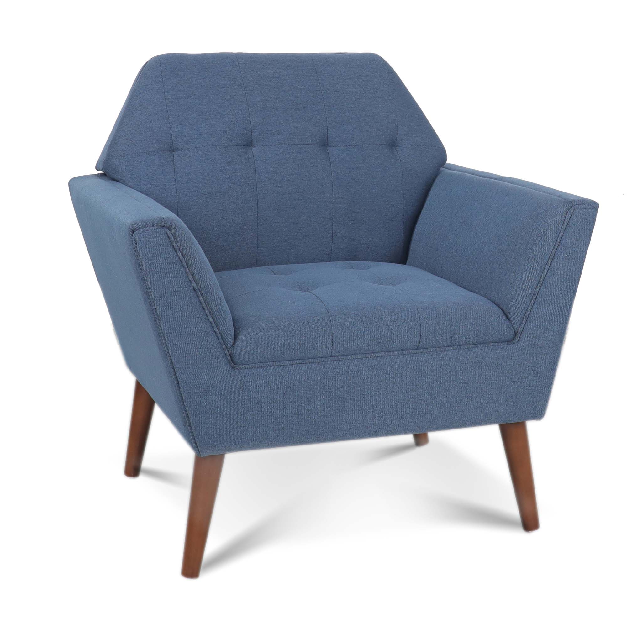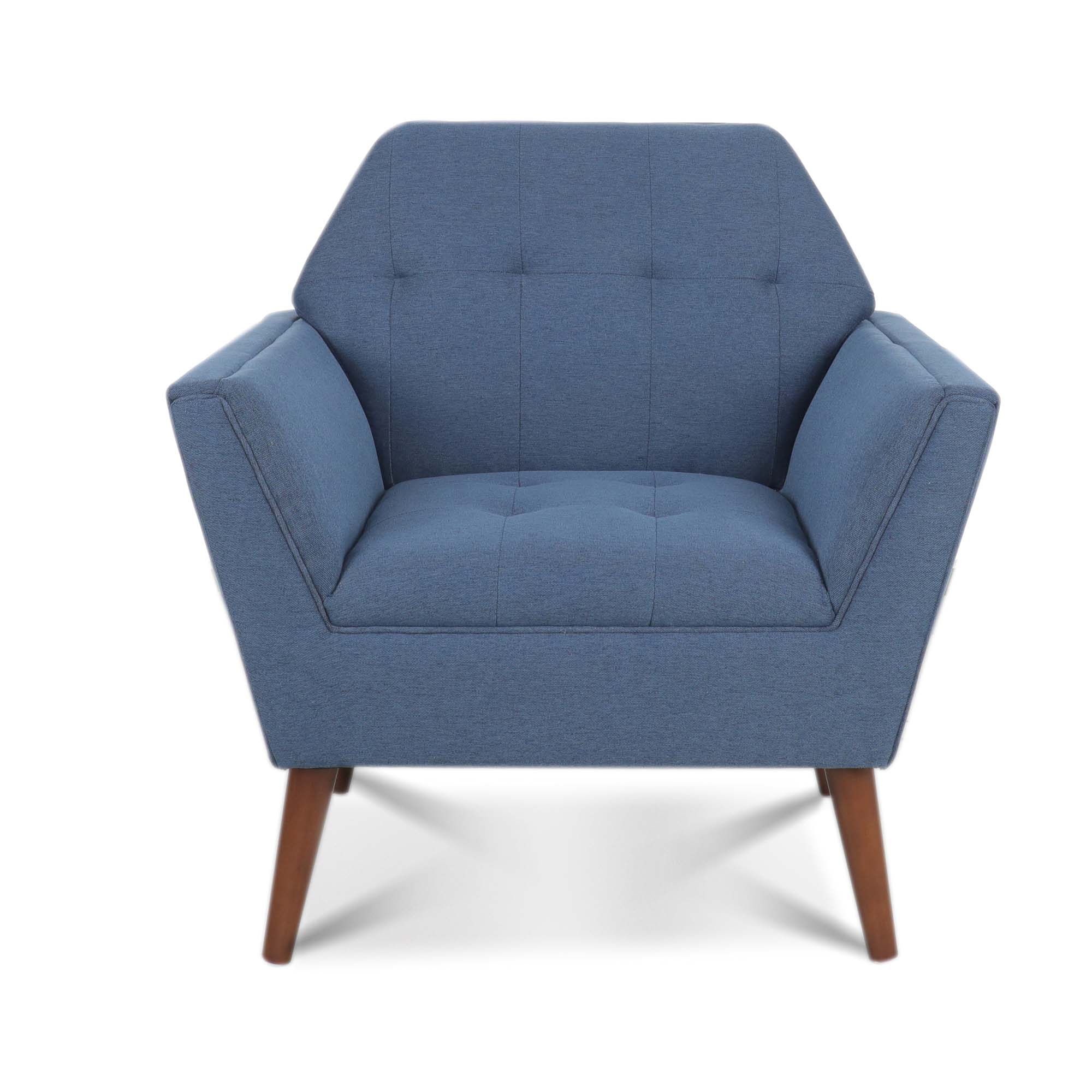 This armchair brings boxy lines to your bedroom or living space. It's made with solid wood and plywood frame and rests on solid wood legs in a warm color finish. Wrapped in 100% polyester upholstery, its foam-filled, sinuous spring cushions give you just the right. Amount of support and prevent sagging over time. It strikes an angular, hexagonal silhouette with flared arms and splayed legs for a mid-century modern feel. Button-tufted cushions add a tailored touch, effortlessly elevating your surrounding design scheme.