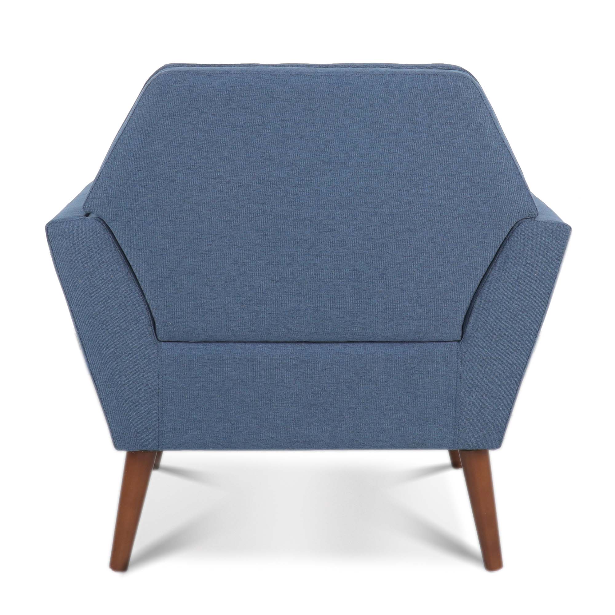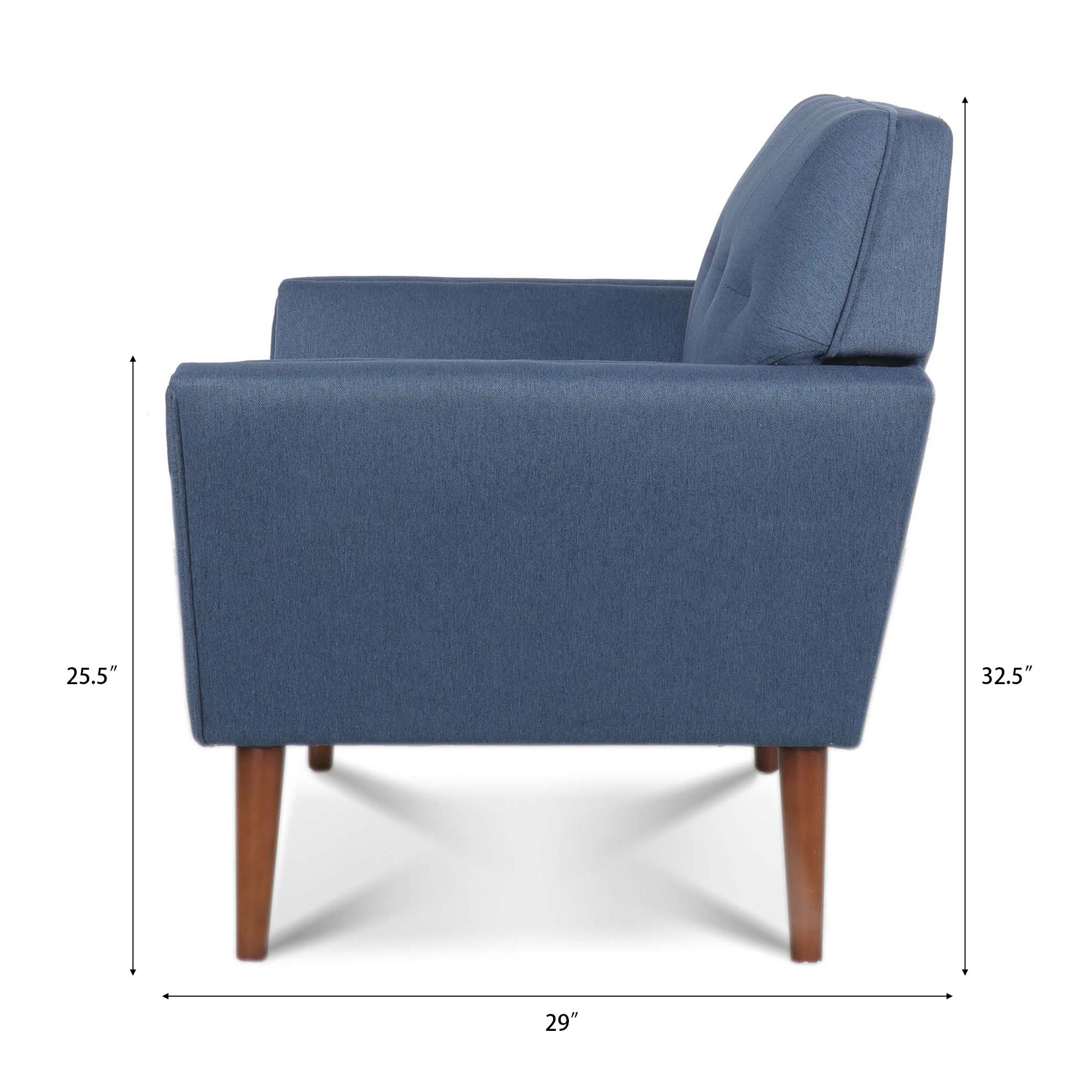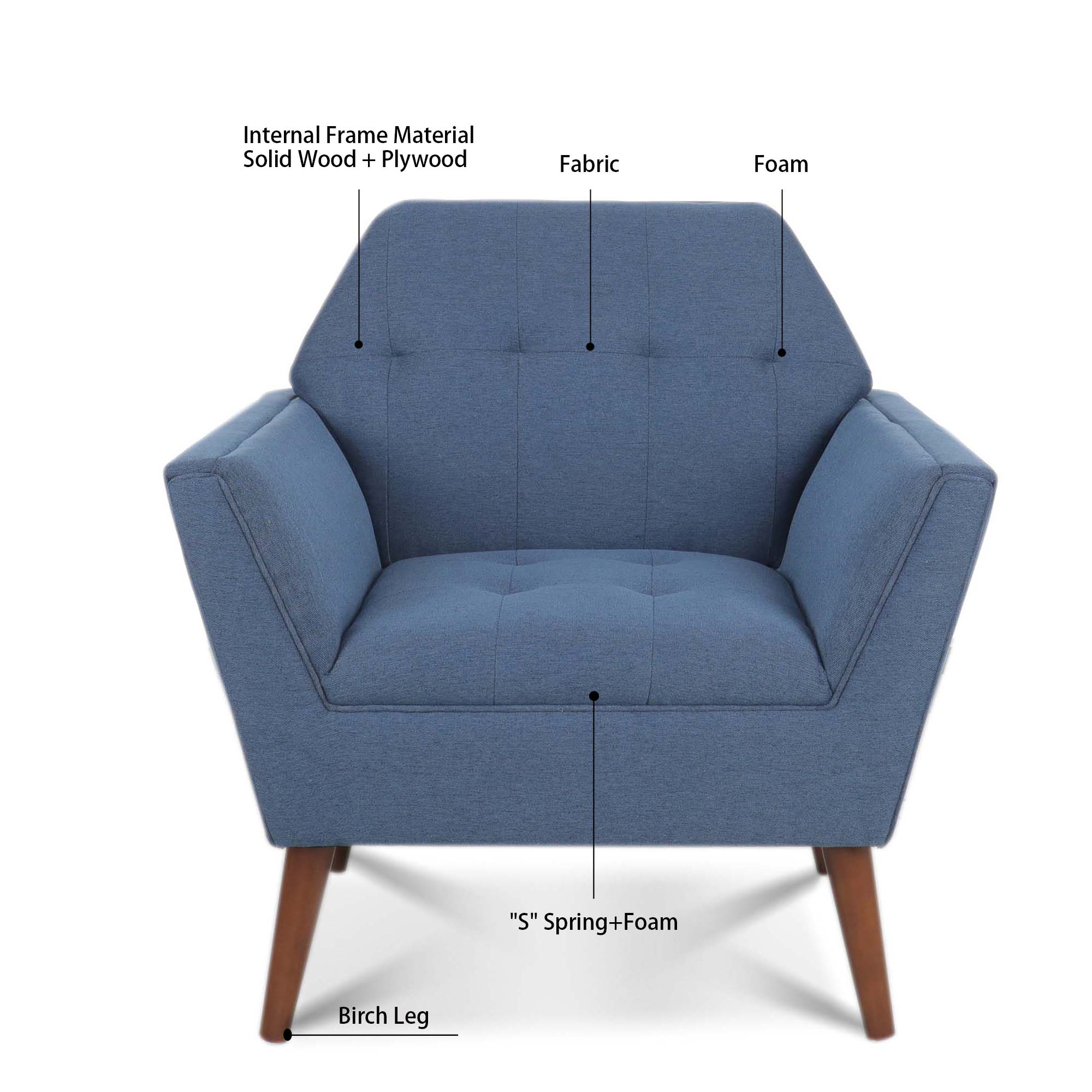 This armchair brings boxy lines to your bedroom or living space. It's made with solid wood and plywood frame and rests on solid wood legs in a warm color finish. Wrapped in 100% polyester upholstery, its foam-filled, sinuous spring cushions give you just the right. Amount of support and prevent sagging over time. It strikes an angular, hexagonal silhouette with flared arms and splayed legs for a mid-century modern feel. Button-tufted cushions add a tailored touch, effortlessly elevating your surrounding design scheme.