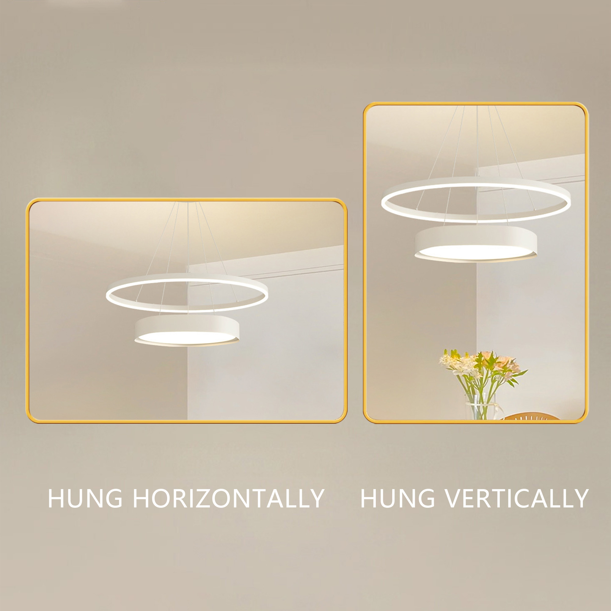 This lightweight mirror comes with more reinforced "+" holes on the back, wall hardware, and screws that can be hung horizontally or vertically. Just drive the screws into the wall and chose two holes to hang the mirror on the screws to complete the installation.