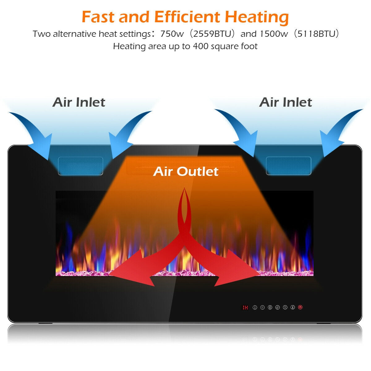 - 2 Heat Settings & Energy Savings: 750W & 1500W for different rooms and weathers which can be adjusted accordingly for both warm and energy-saving purposes. This fireplace also has energy-saving LED technology. The supplemental zone heating is up to 400 square feet.