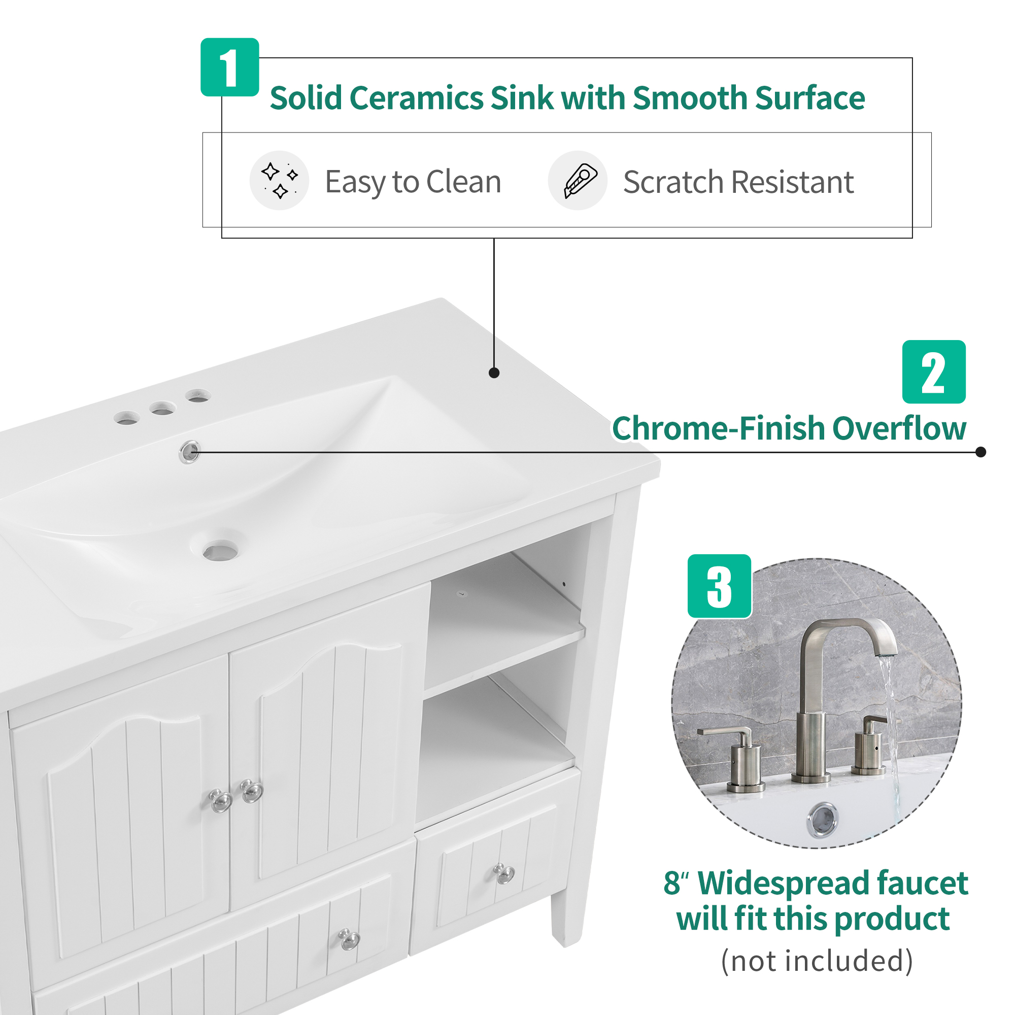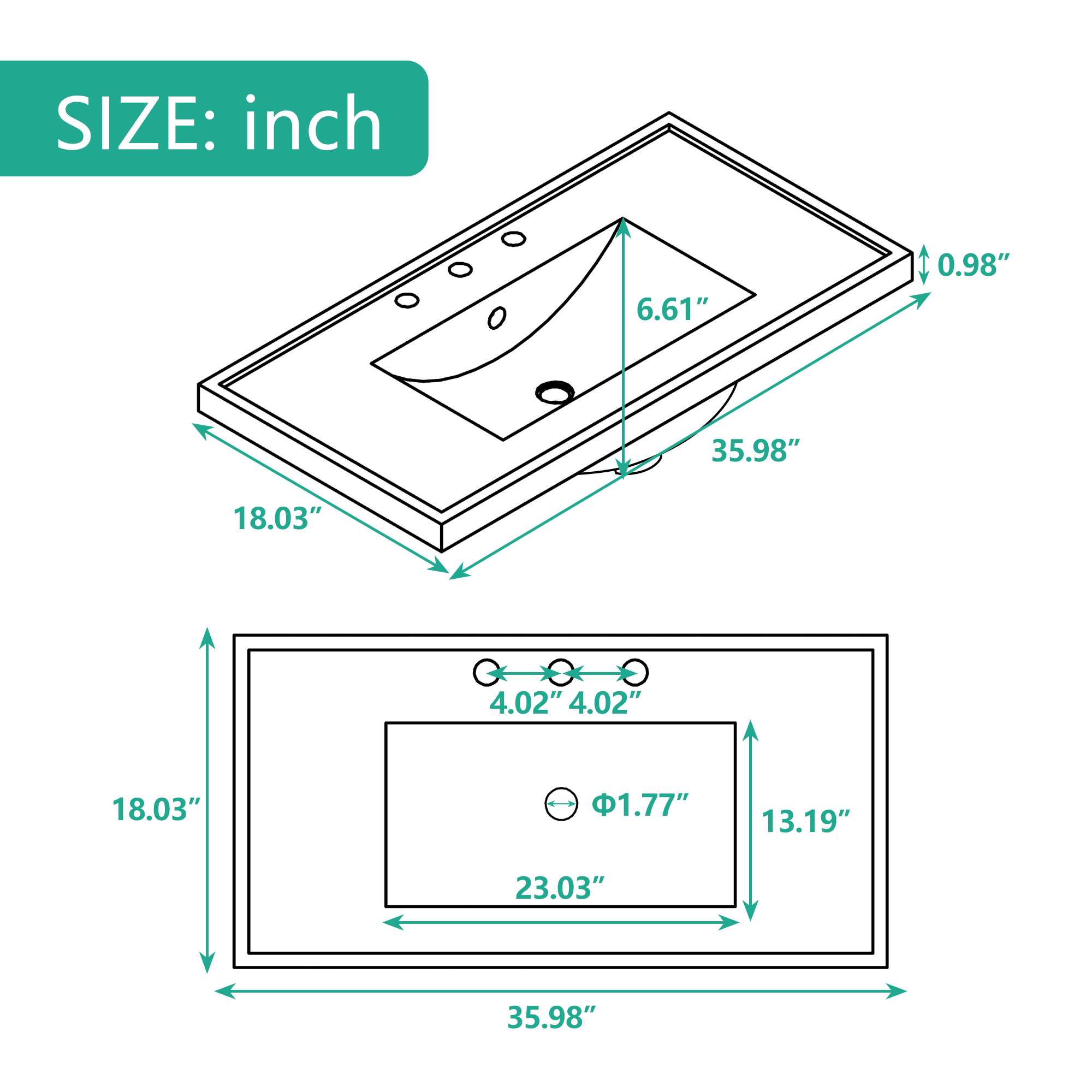 36" Single Bathroom Vanity Top with White Basin, 3-Faucet Holes, Ceramic