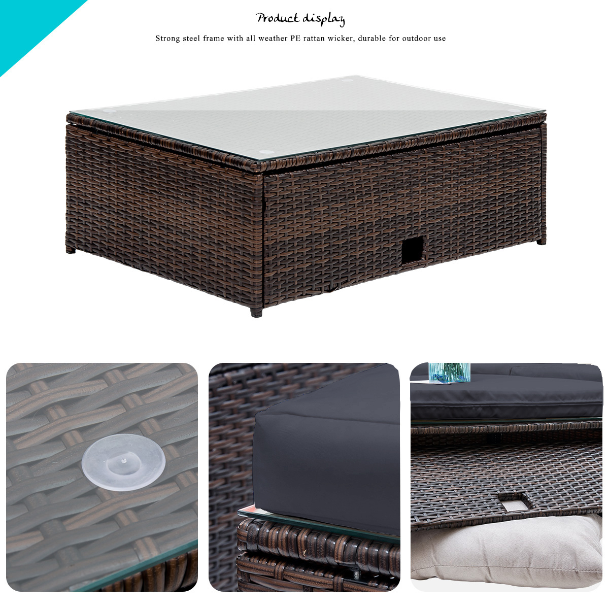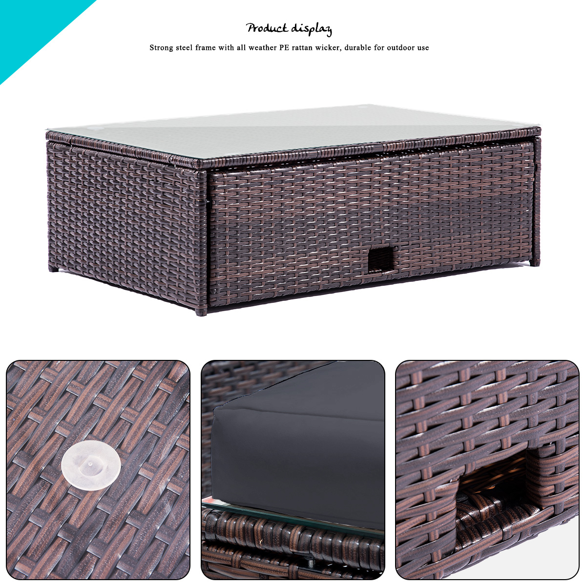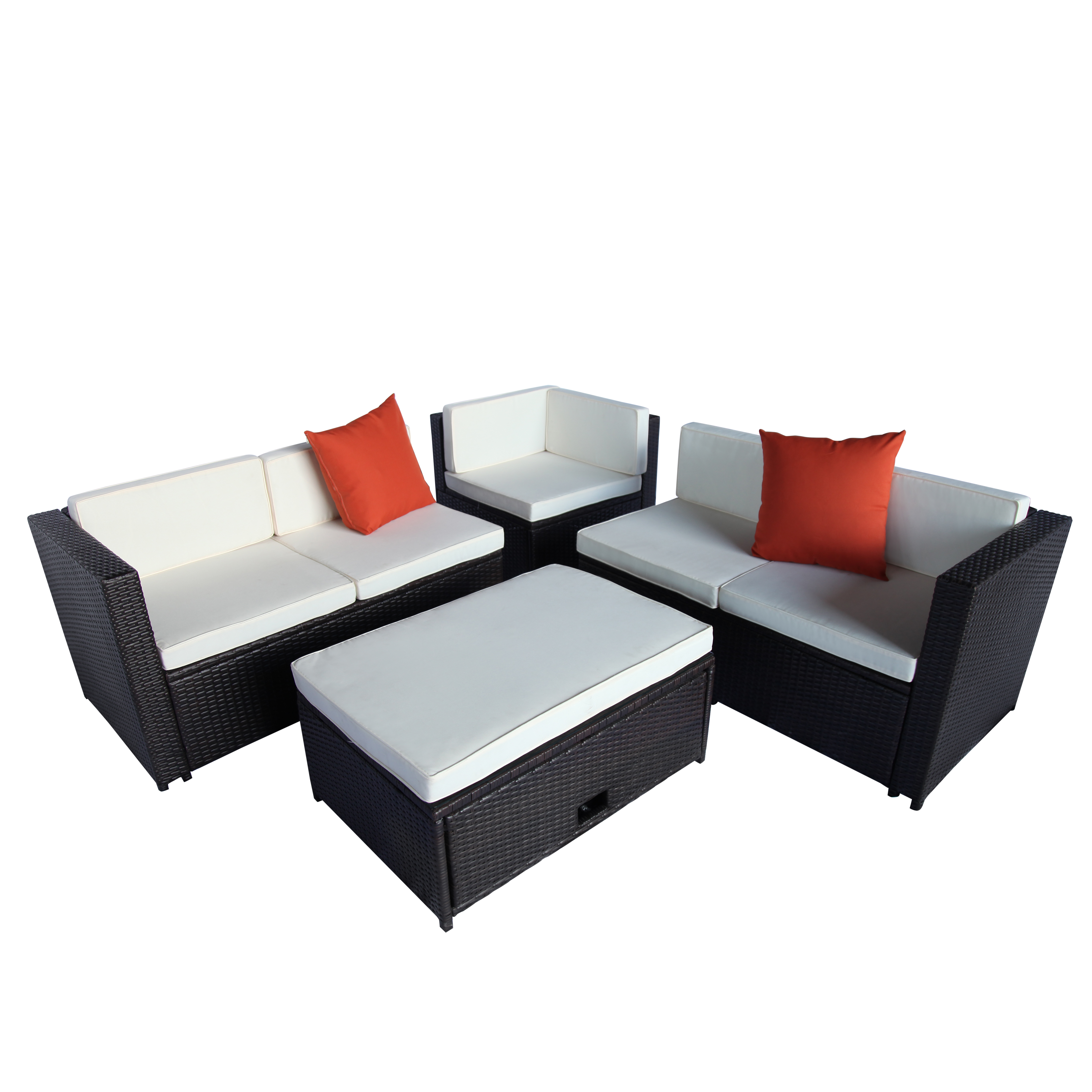 A full outdoor patio set with 2 double-seat sofas, 1 single-seat corner sofa, and 1 table ottoman provides plenty of space for you, family, and your guests. Set it up by the poolside and soak in some rays or in a cool shady spot for complete relaxation to unwind after a long day. Outfitted with spacious cushioned seating to comfortably fit a party of 5, have tasteful seating options for guests when entertaining outdoors, or for a change in scenery when lounging and bonding with family. A matching center coffee table with a thick tempered glass surface offers the perfect location for snacks and refreshments or to play card games with loved ones while not being cooped up inside. Remove the table cushion from the underside compartment for an instant transformation into a comfortable ottoman. Perfect for any backyard, add this set to your home so you can lean back, relax and enjoy the great outdoors.