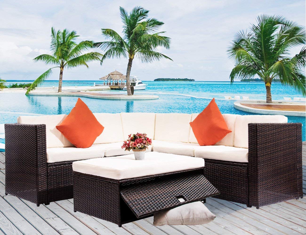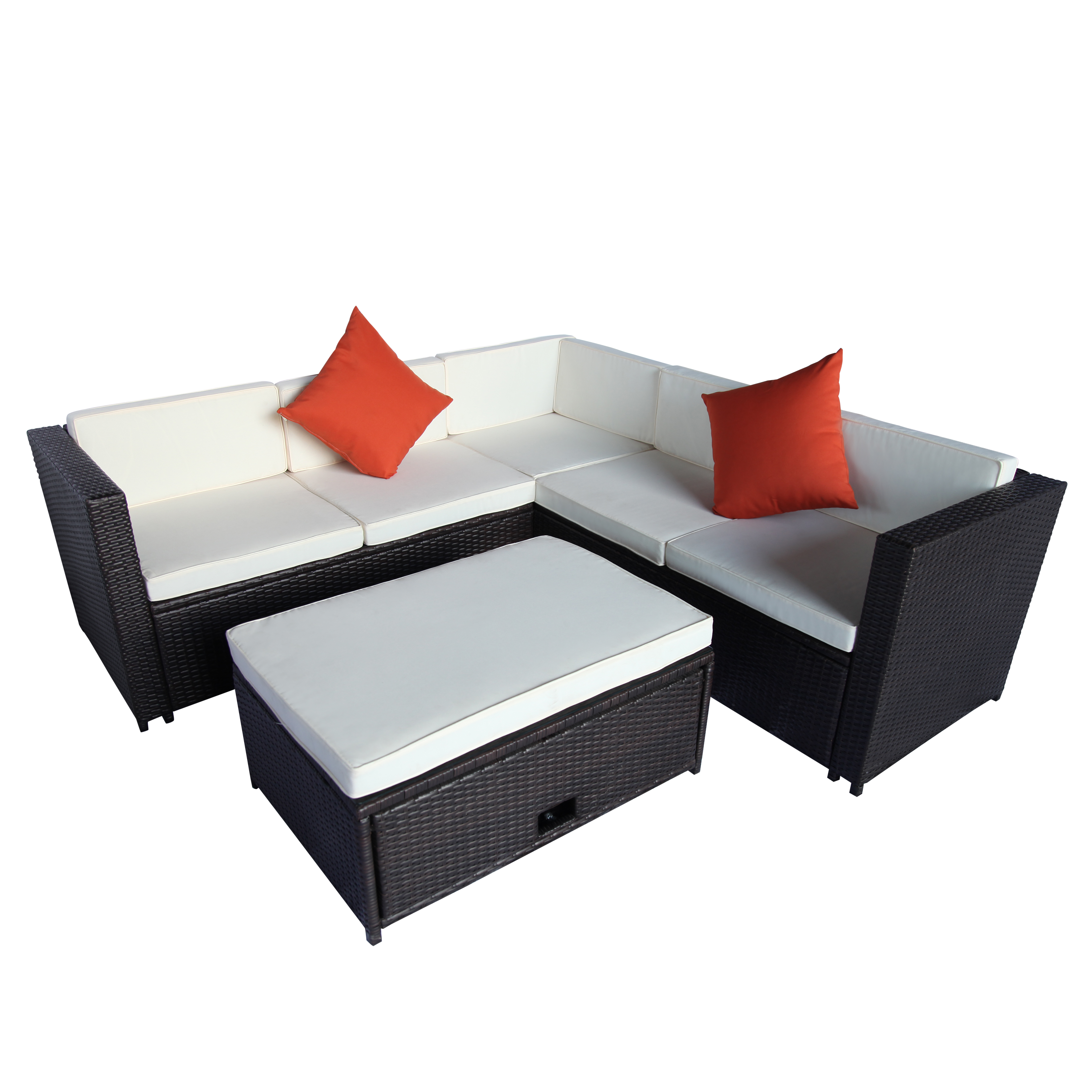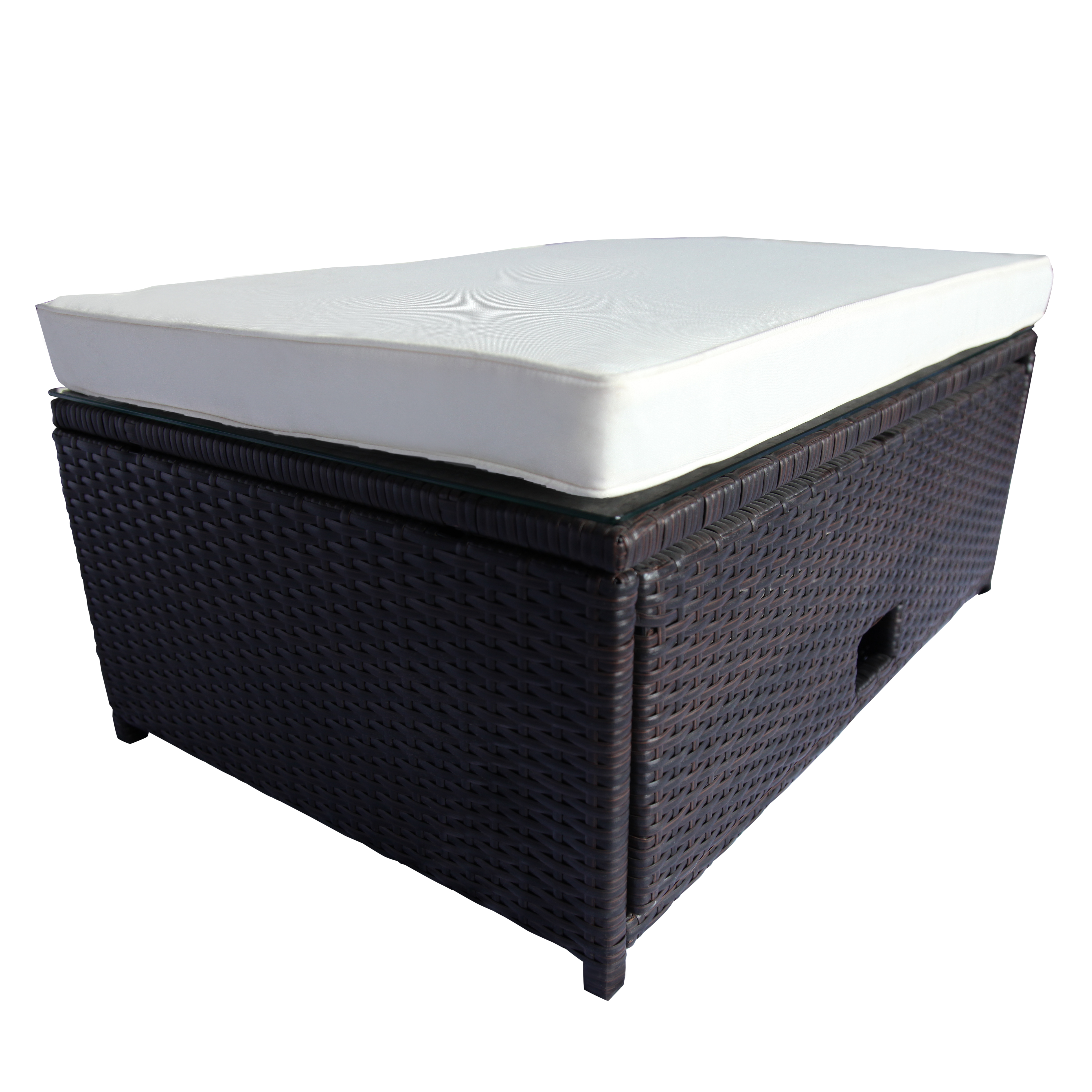 A full outdoor patio set with 2 double-seat sofas, 1 single-seat corner sofa, and 1 table ottoman provides plenty of space for you, family, and your guests. Set it up by the poolside and soak in some rays or in a cool shady spot for complete relaxation to unwind after a long day. Outfitted with spacious cushioned seating to comfortably fit a party of 5, have tasteful seating options for guests when entertaining outdoors, or for a change in scenery when lounging and bonding with family. A matching center coffee table with a thick tempered glass surface offers the perfect location for snacks and refreshments or to play card games with loved ones while not being cooped up inside. Remove the table cushion from the underside compartment for an instant transformation into a comfortable ottoman. Perfect for any backyard, add this set to your home so you can lean back, relax and enjoy the great outdoors.