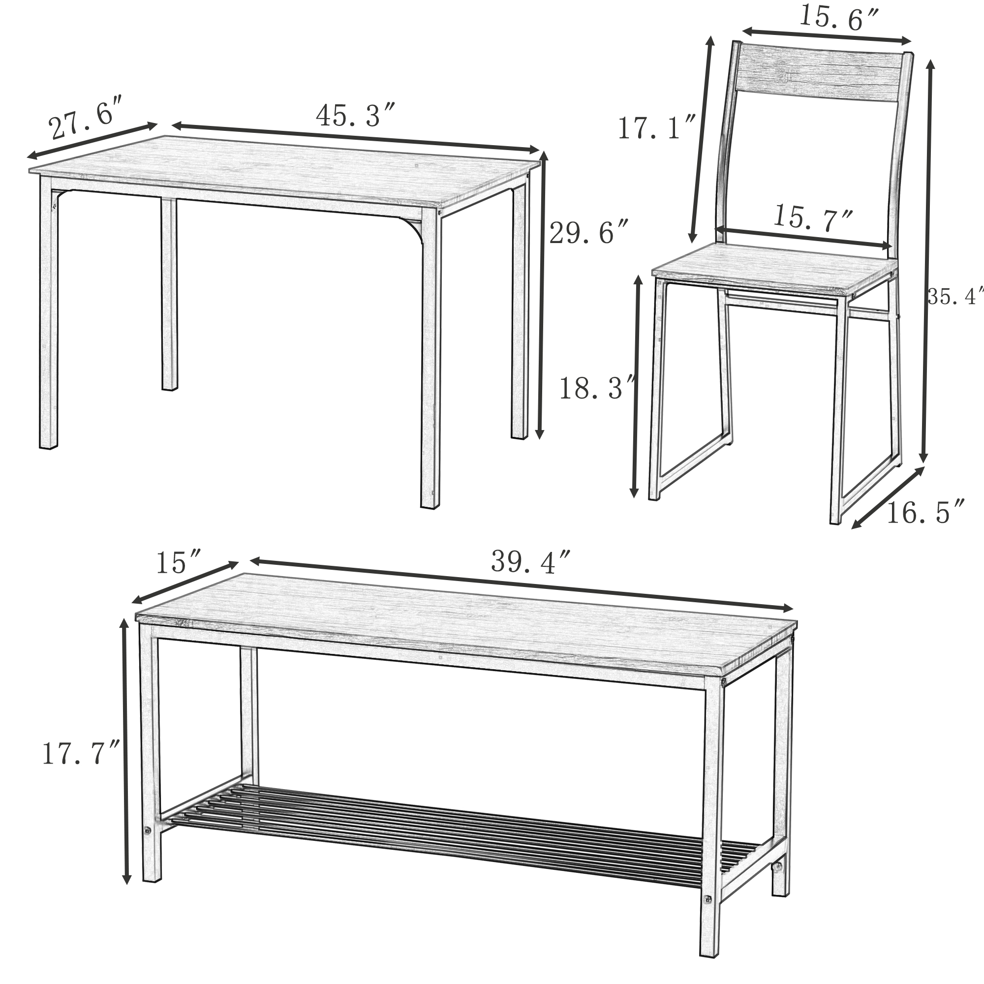 4PCS Kitchen Set---Come with one table, 2 armless chairs, and one bench, this set is perfects for 4 people, especially in small places. Made of high-quality MDF and steel frame, this dining set is designed for a long time using with its stability and sturdiness. To strengthen support, 4 triangular sheets are added under the corners of the table to improve loading capacity.