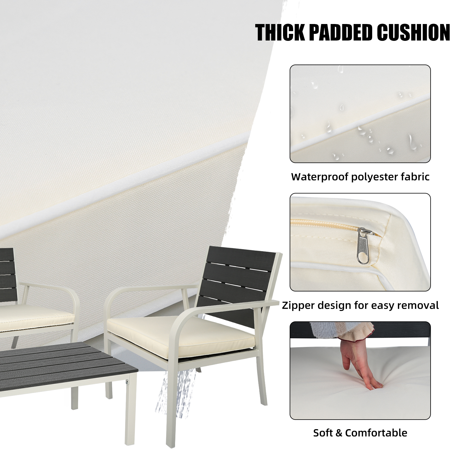 This patio furniture set features an imitation wood grain appearance, clean, smooth lines, textured cushions, and neutral tone, adding luxury and comfort to any outdoor setting.