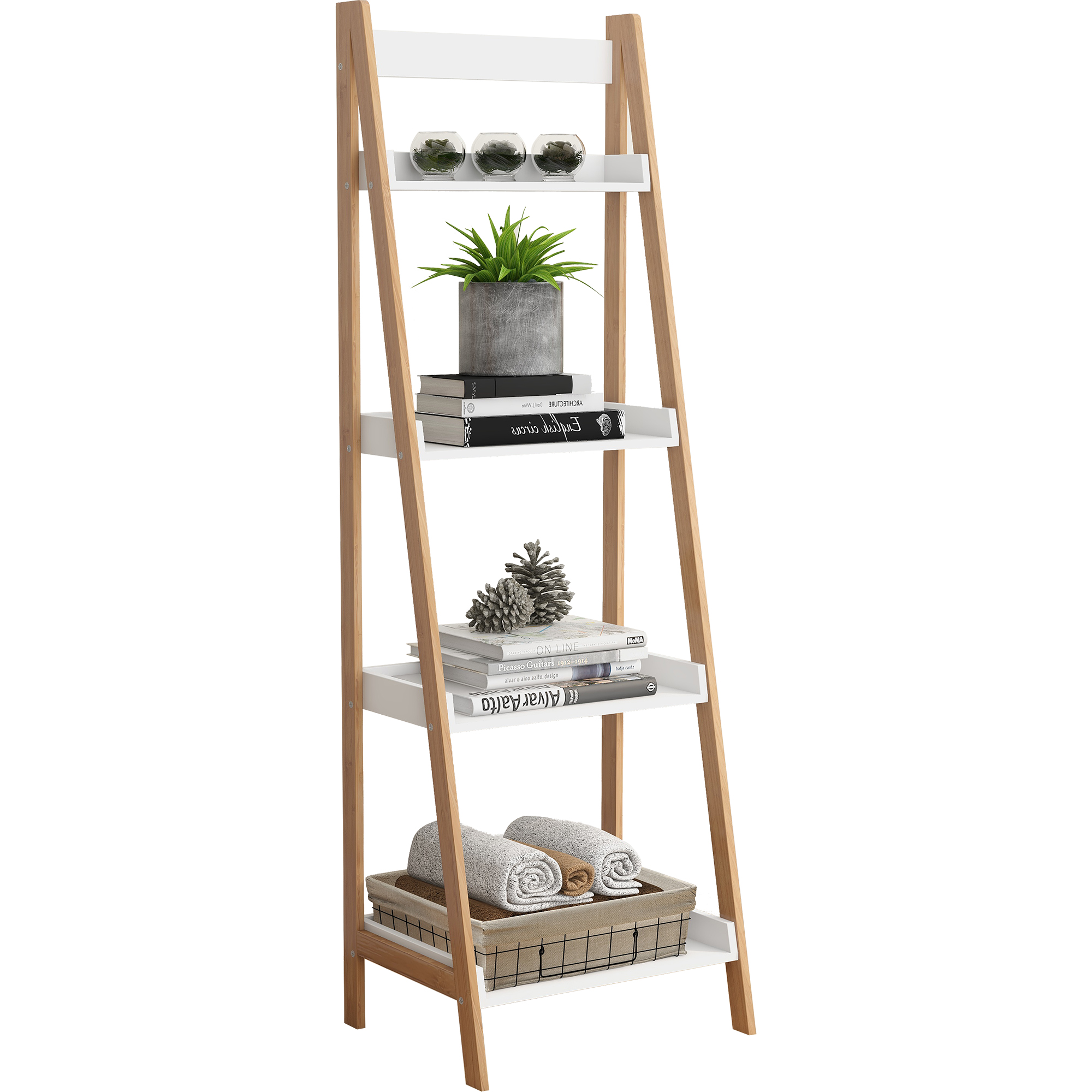Solid Bamboo wood 4 tires ladder shelf. The simple and fashionable design makes the bookshelf suitable for various styles of home decoration, which is very versatile. Four open tires and different sizes of each tire provide a spacious space for your common items. This ladder rack can be used as a plant rack, bookcase or family photo display rack.