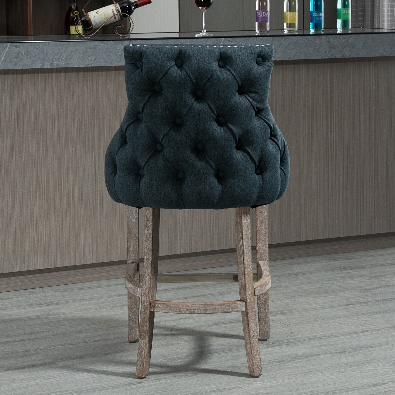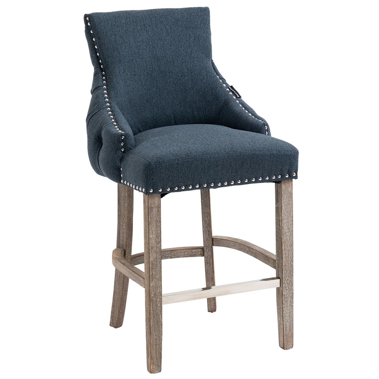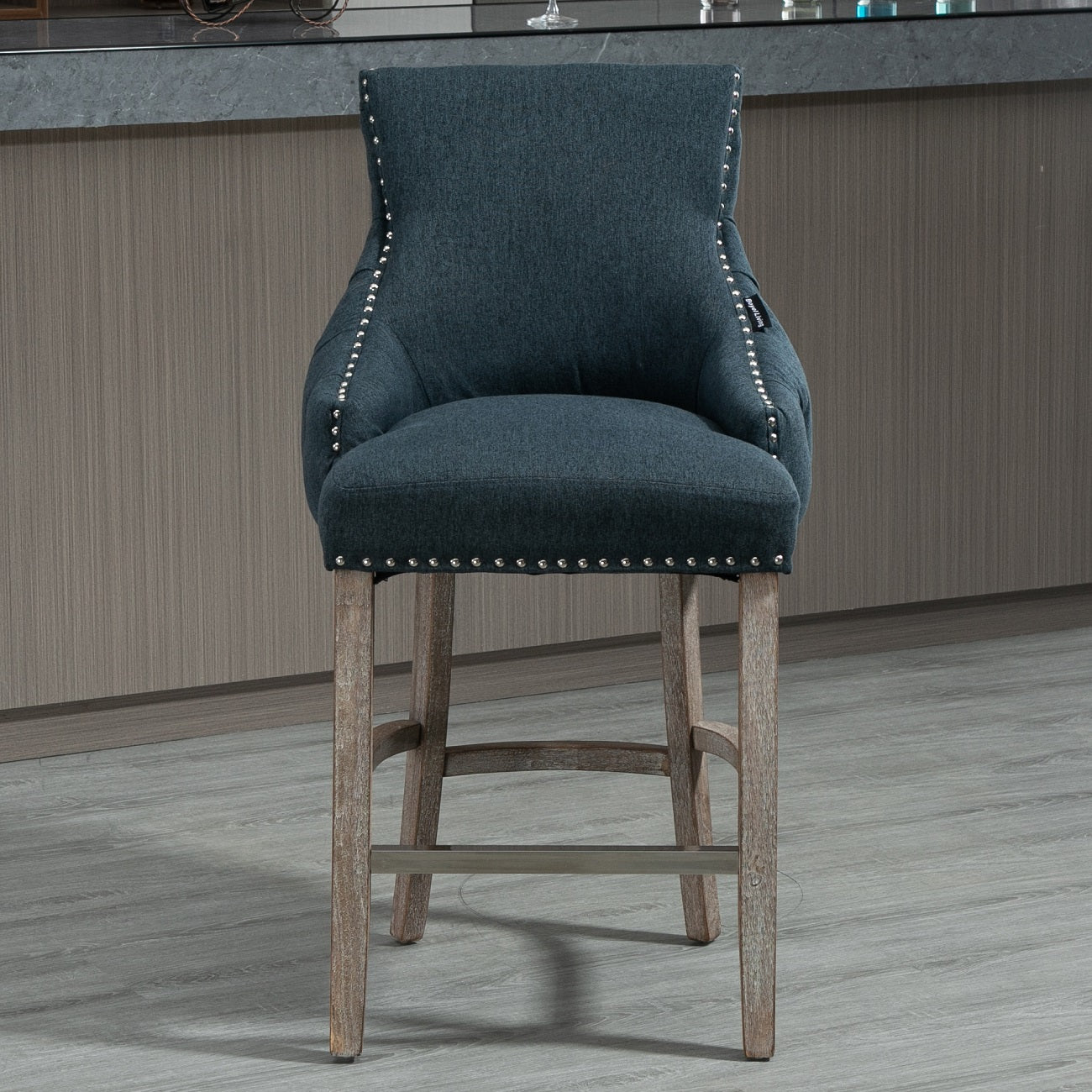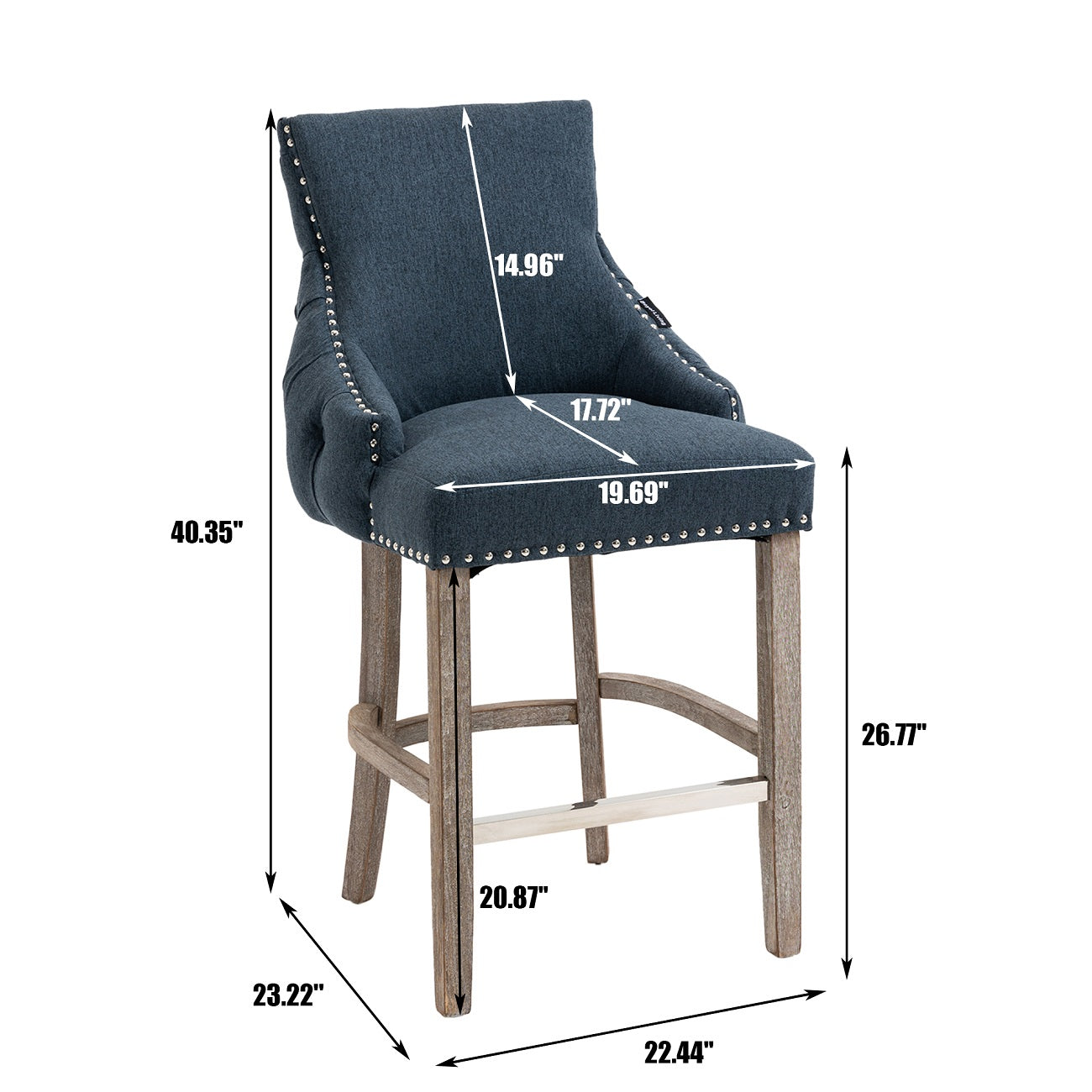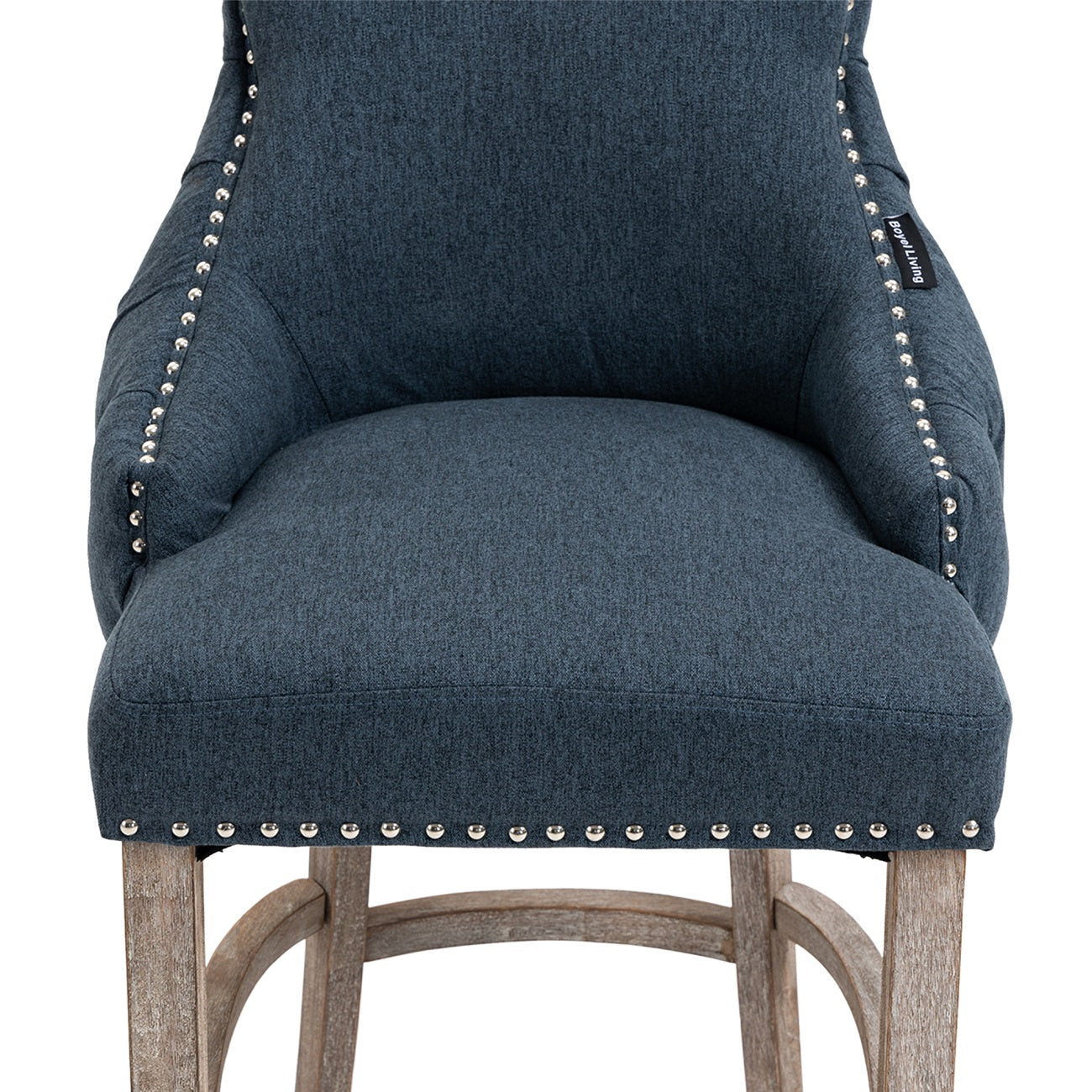 - The seats are upholstered in linen fabric, durable, and styled with silver nailhead trim and tufted backs to add elegance.