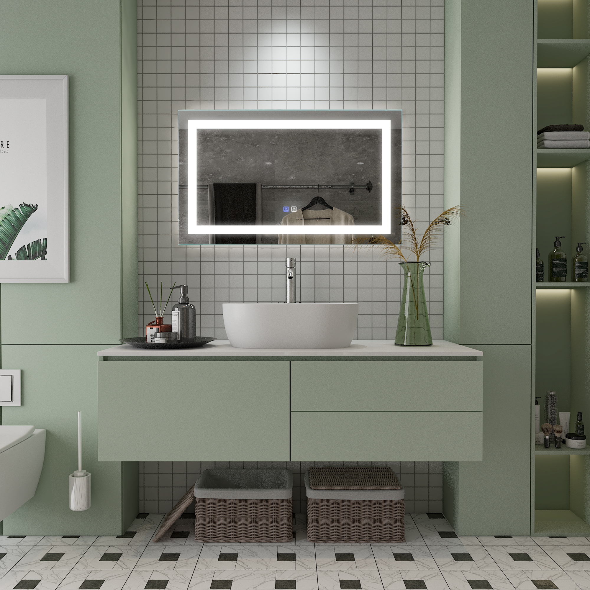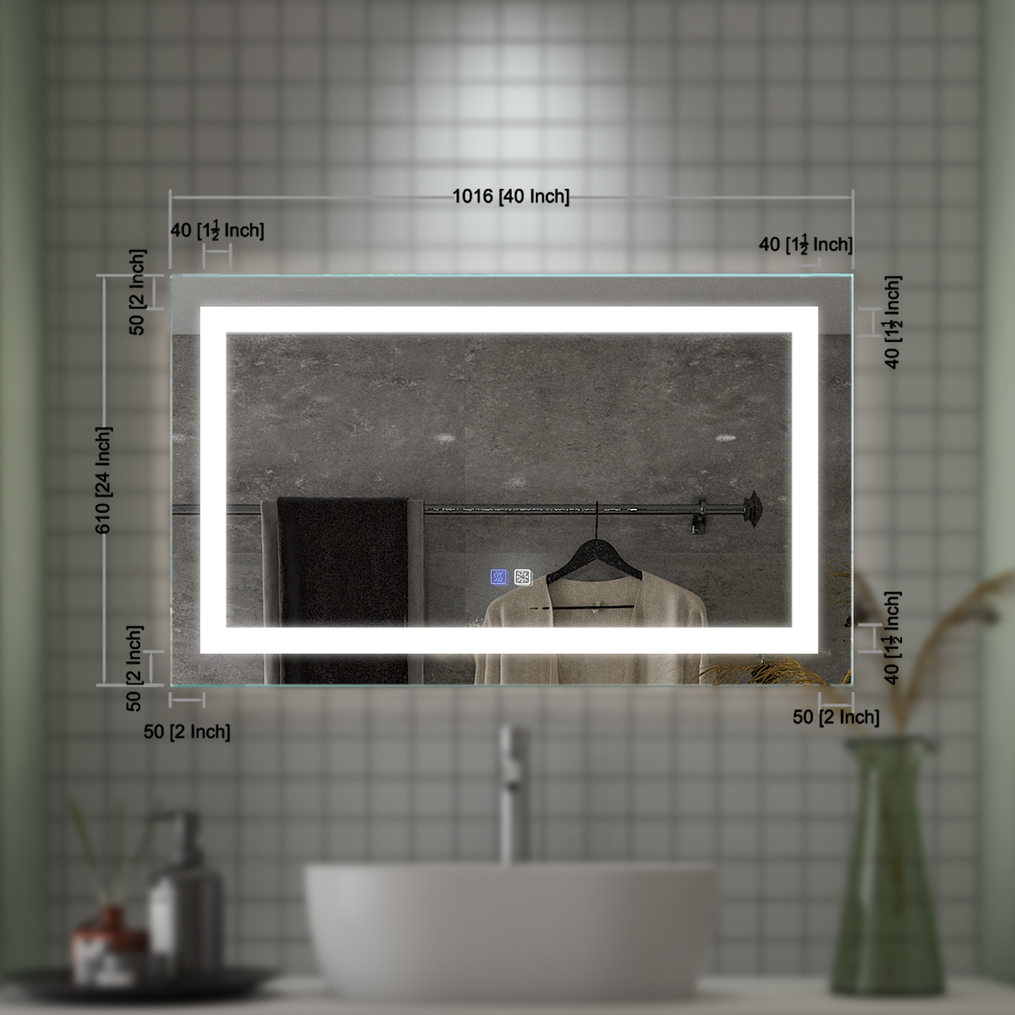 Night LightThe mirror's night light has a light sensor switch and can also be stopped manually. You no longer have to worry about finding the light switch in total darkness. | DefogJust touch the separate anti-fog switch to get a clear mirror. It eliminates the need to frequently use defogging agents to clean or wipe the steam off the glass. | DimmableHold the On/Off button for about 3 seconds, supports 20% - 100% brightness range for adjustment. (Will memory your brightness setting after closing.) | InstallationOur mirrors are equipped with American standard plugs, you can also choose to cut the plug to use the hardwire. Two installation methods, which can be installed horizontally or vertically according to your own needs. |