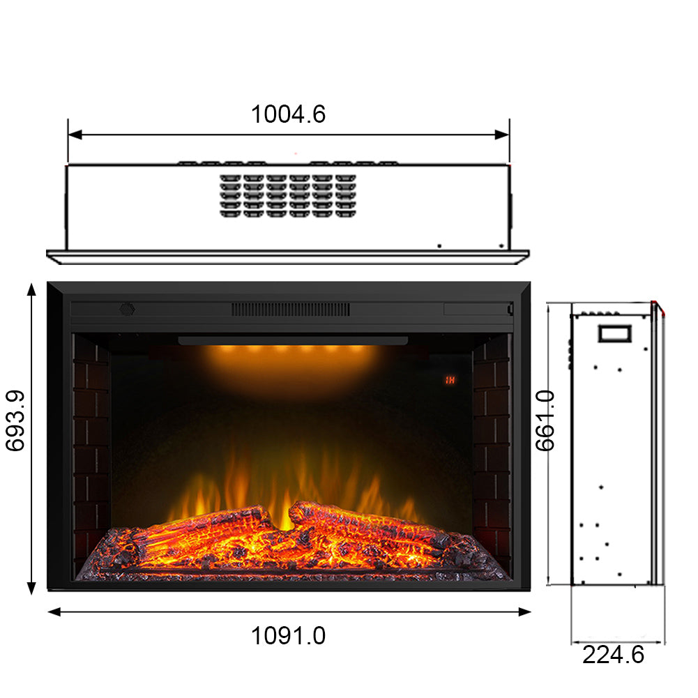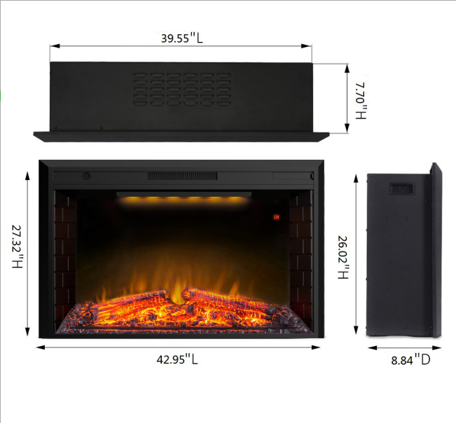 - The overall dimension: 42.95"W X 8.84"D X 27.32"H and the insert dimension is 39.55"W X 7.7"D X 26.02"H, the electric fireplace insert provides supplemental heat for a room up to 400 sq.ft; 5000 BTU; the room will be warm in a few minutes. 6ft power cable; Use 120V AC