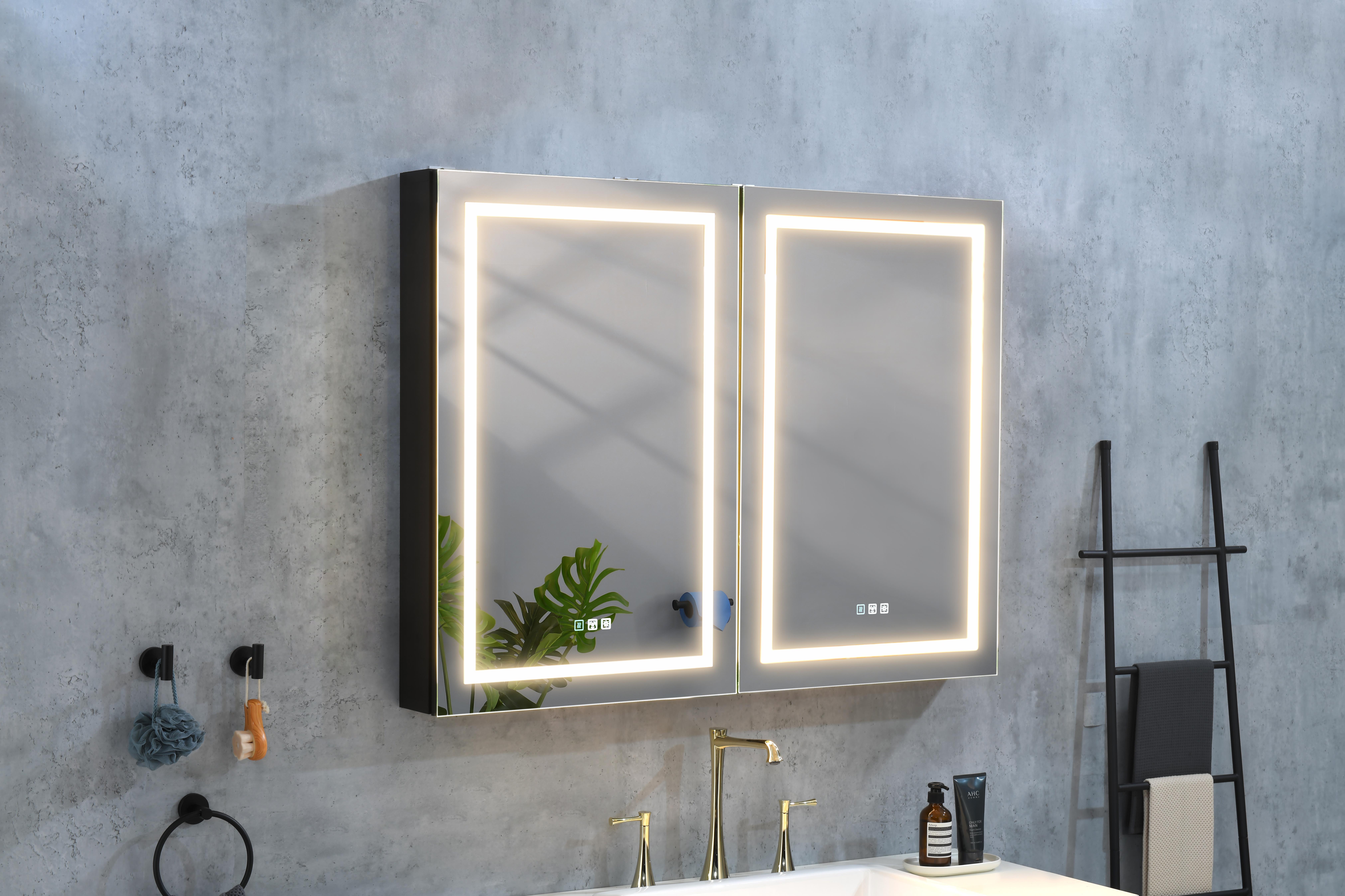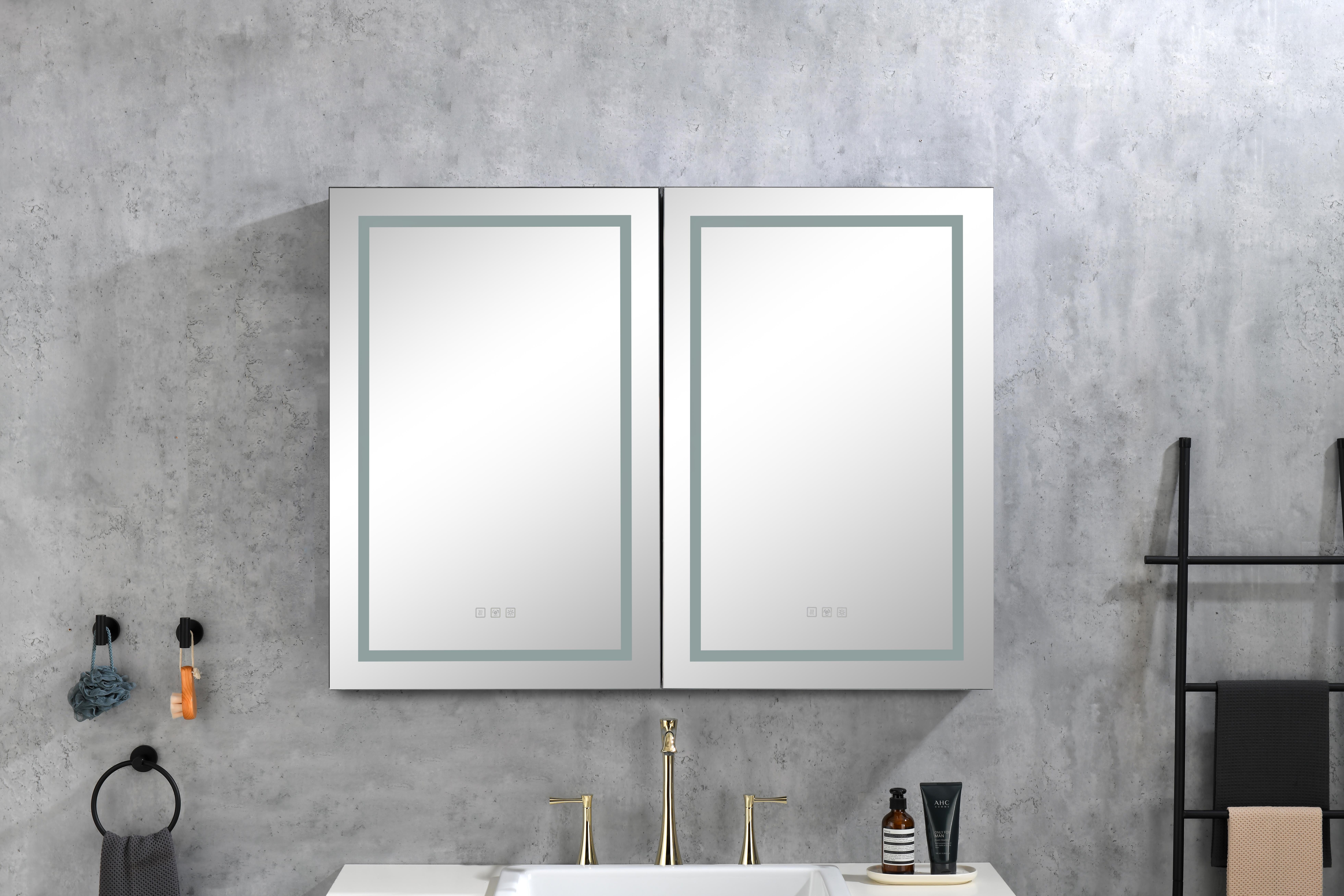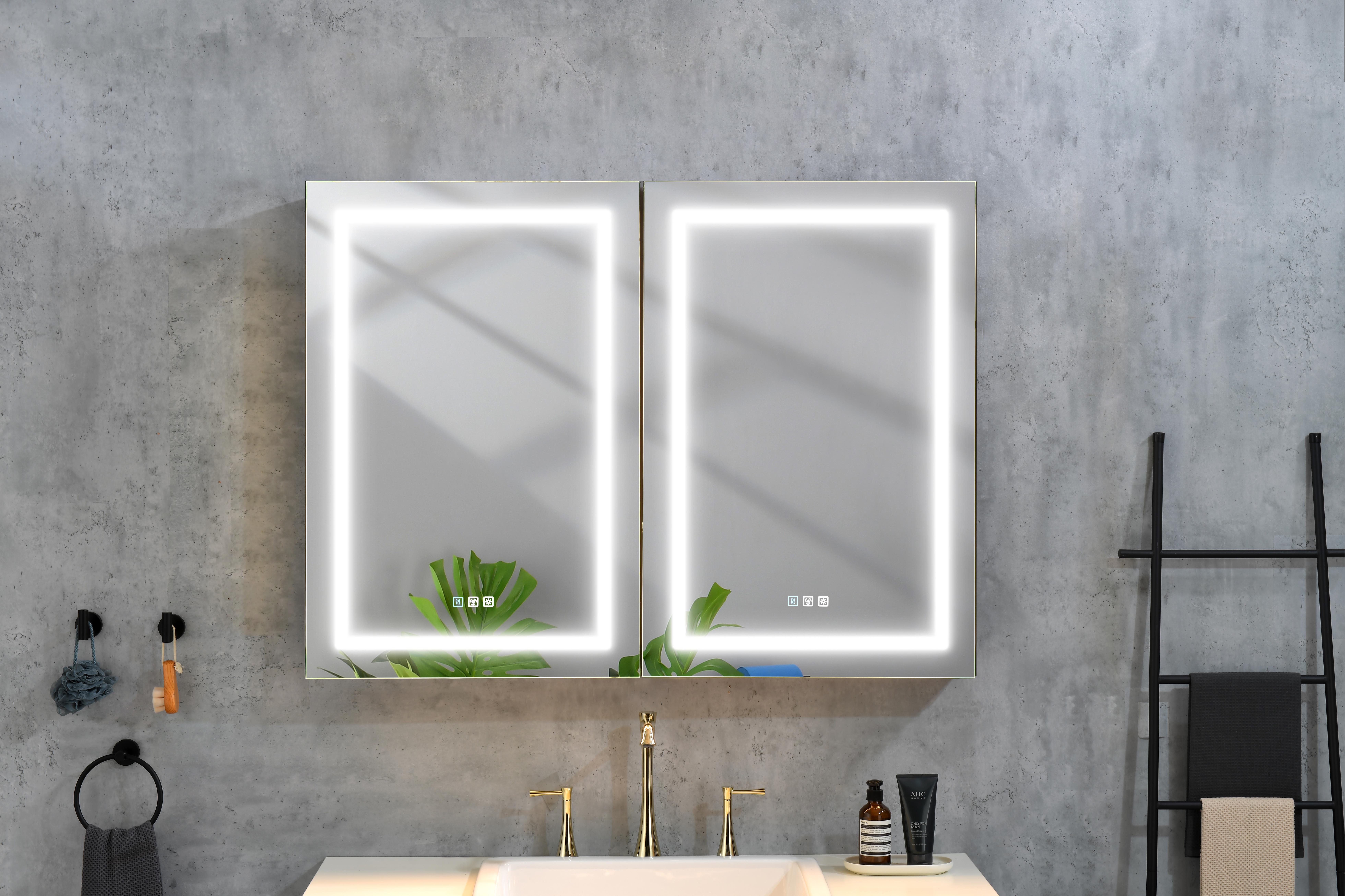 Medicine Cabinets with MirrorsRecessed or Surface Lighted Mirror Medicine Cabinet with Lights, LED Medicine Cabinet w/Defogger, Dimmer, 3X Makeup Mirror, Outlets & USBTHREE SOFT TOUCH SWITCH makes this LED Medicine Cabinet simple and easy to turn ON/OFF, adjust brightness and change color temperature. fogless makeup time is just one touch away. provides you three levels of brightness options: 5%,50%, 100%. COLOR TEMPERATURE ranges from 3000K - 6000K offers you choices of different light colors for different purposes. All these features make it the perfect led mirror medicine cabinet.Mirrors on both sides of the door, interior walls & both side panels, which makes it a bathroom cabinet with mirror on all sides.Three medicine cabinet shelf.Built-in 20Amp dual outlet and USB 2.0 port for phone or shavers charging inside this bathroom mirror medicine cabinet.3 TIMES AMPLIFY MIRROR makes it super easy for makeup tasks. and convenience to your bathroom.Smart memory function remembers your favorite setting, no need to adjust every time you turn on the mirror.CRI 90+ light source reproduces high-quality task lights perfect for making up. 5 mm COPPER FREE silver medicine cabinet mirror prevents black edges in the harsh bathroom environment.Guaranteed 50,000 hours lifetimes and 100,000 times switch touch.High-end hardware brandsoft close hinges and provides strong support for large medicine cabinet. rated Anodized Aluminum Frame for extra durability. Scratch-free painting finish. Grooved door edges and corners for safe use.48*30Inch bathroom medicine cabinet recessed or surfaced.Surface mount medicine cabinet, recessed medicine cabinet with lights and outlet. PLEASE BE AWARE, any LED medicine cabinet on the market cannot be served as the only lighting power source, additional lighting source may be necessary.