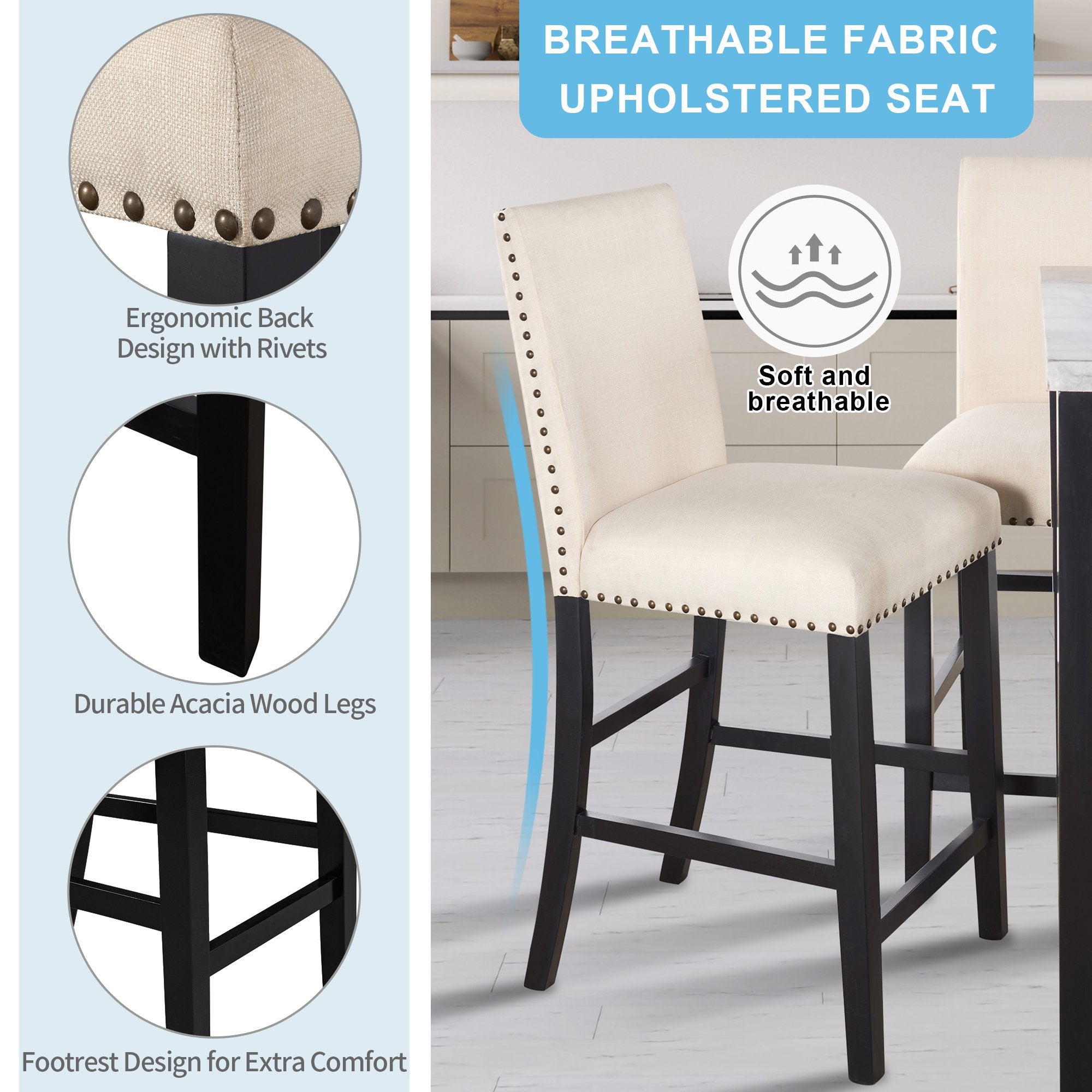Ergonomic Fabric Upholstered Seating:The beige fabric upholstered counter height chairs feature slightly curved back rests for ergonomic support while the seats are filled with plush fire-proof sponge allowing you to sit for extended periods of time in comfort. 4 base wooden spindles offer reinforced support and solid stability for increased weight capacity holding up to 250lbs.