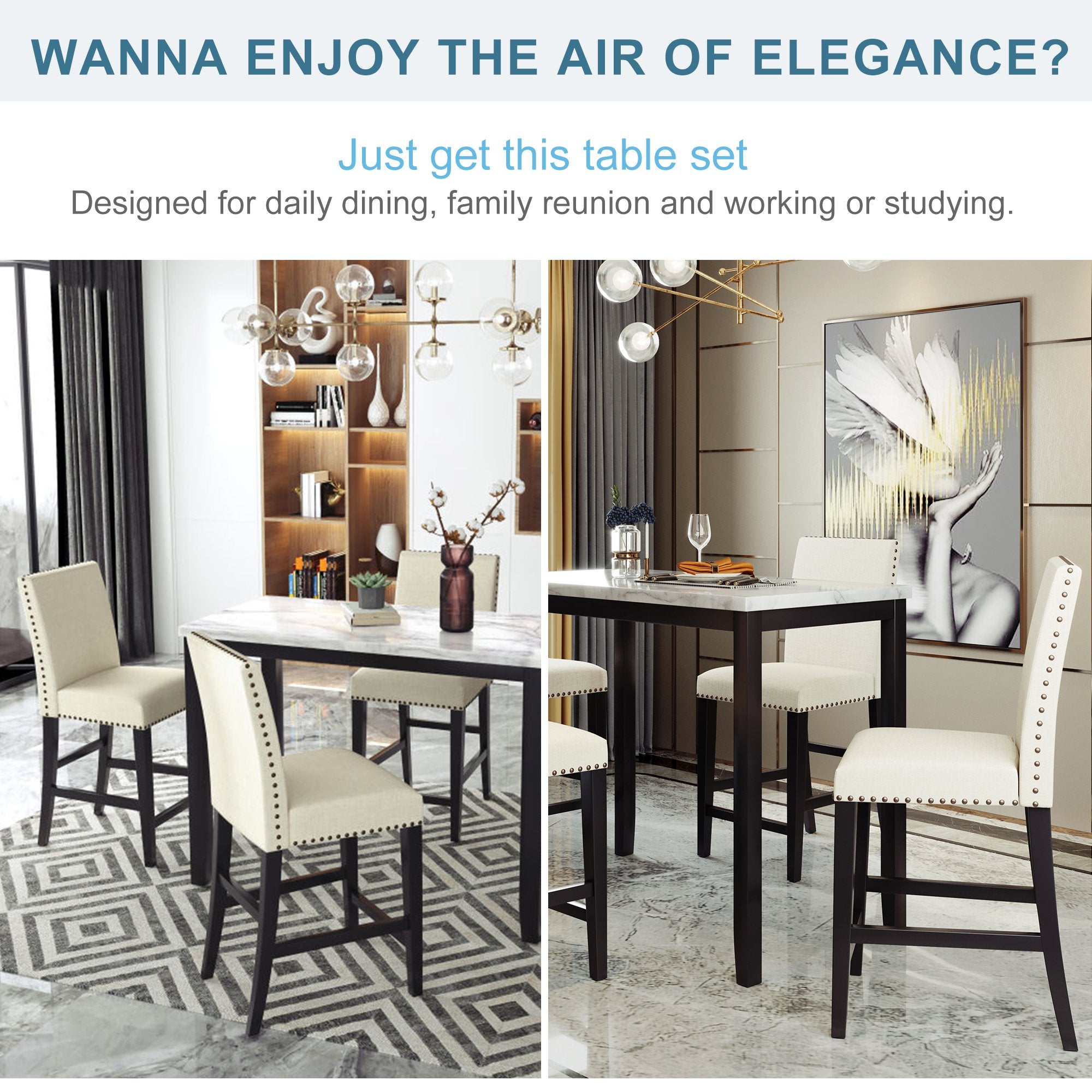 Effortless Elegance:With tasteful elegant accents throughout, this is not your average dining set. Features a marble inspired table top with an organic marbled pattern that matches effortlessly alongside the set of 4 beige fabric upholstered chairs with classic bronze brushed nail head accent trim to help effortlessly refine and tie together any dining or kitchen space.