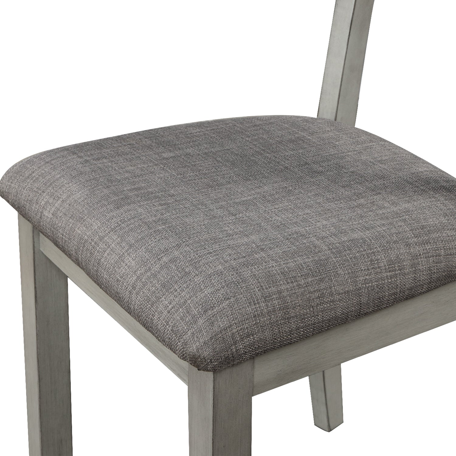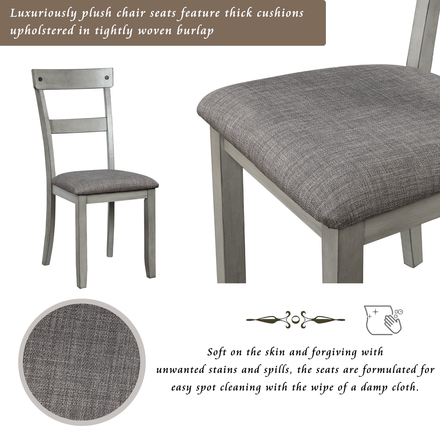 Luxuriously plush chair seats feature thick cushions upholstered in tightly woven burlap in a muted grey for a contemporary monochromatic look. Soft on the skin and forgiving with unwanted stains and spills, the seats are formulated for easy spot cleaning with the wipe of a damp cloth