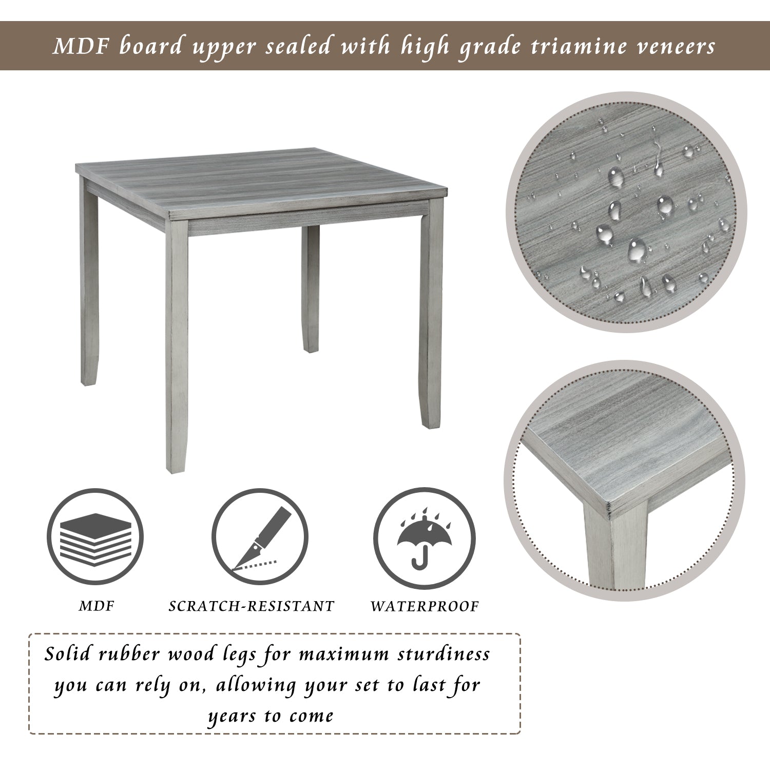 Crafted with durability in mind, this dining table features an MDF board upper sealed with high grade triamine veneers resistant to water and scratches, features solid rubber wood legs for maximum sturdiness you can rely on, allowing your set to last for years to come