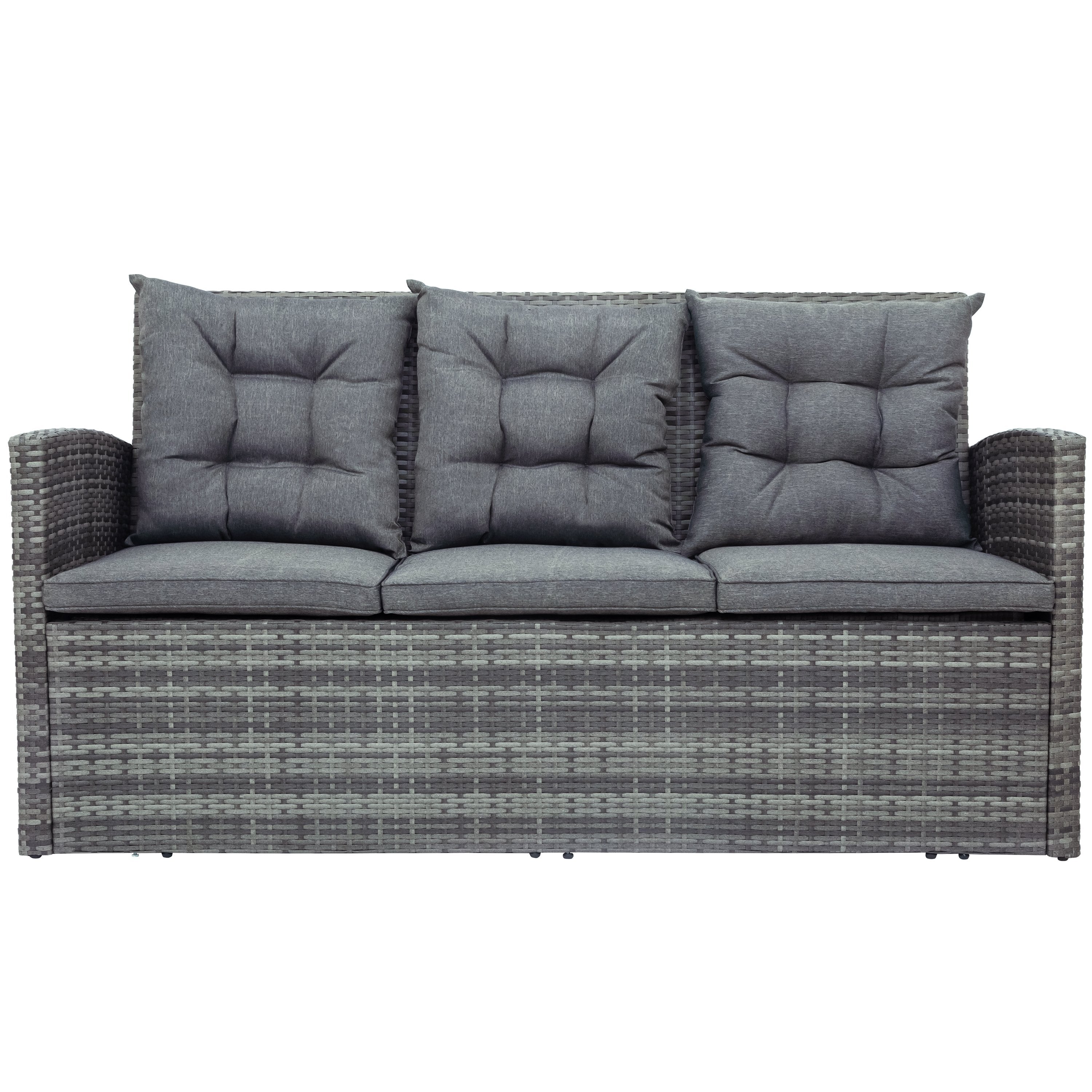 - This modern outdoor sectional patio sofa set comes with 1 3-seat sofa+2 arm chairs+1 tempered glass table+ 1 ottoman+6 cushions+5 pillows. With creative design, the 3-seat sofa can be used to stored pillows or other stuffs. By a flexible gas lift, it's easy to open the board and offers extra space for your home.