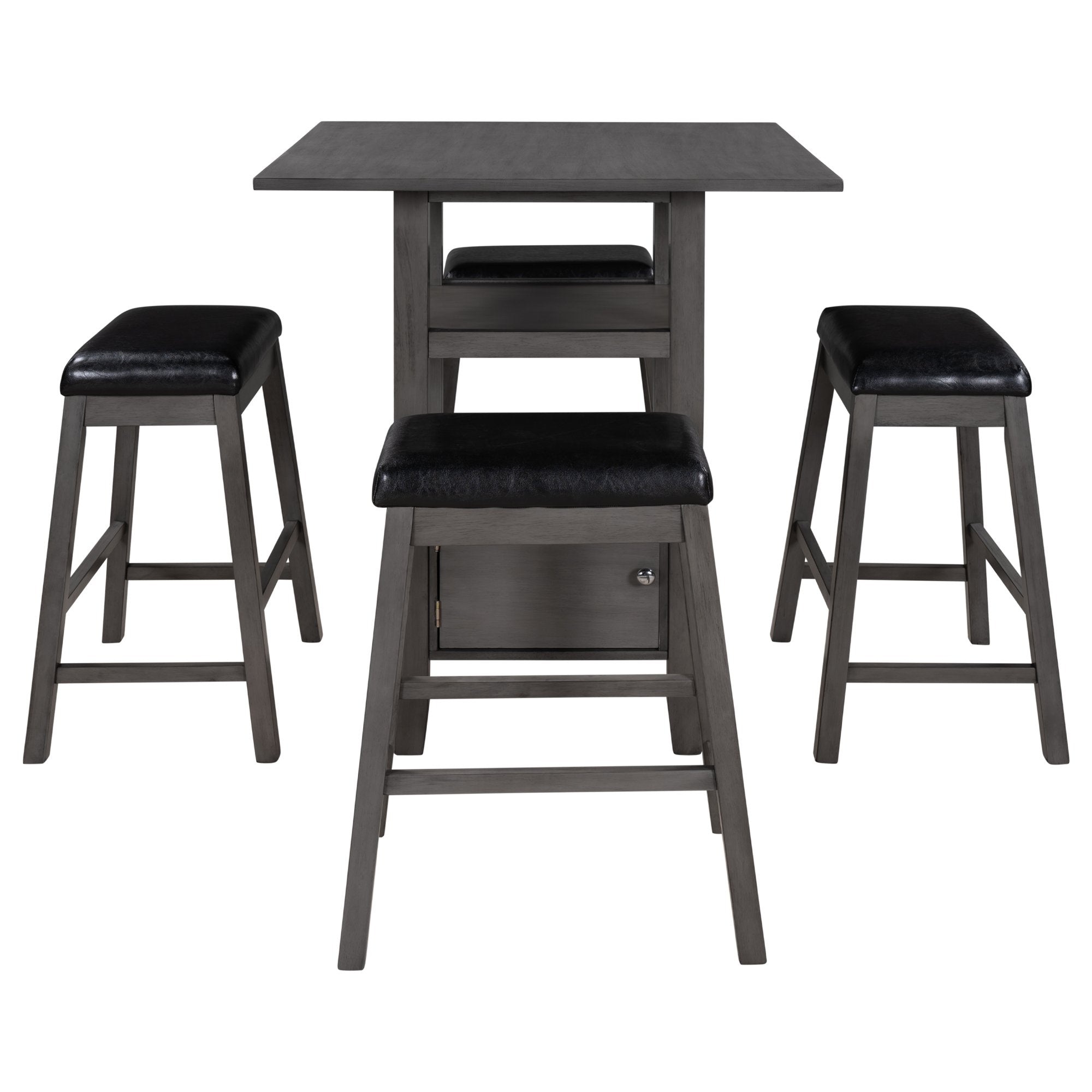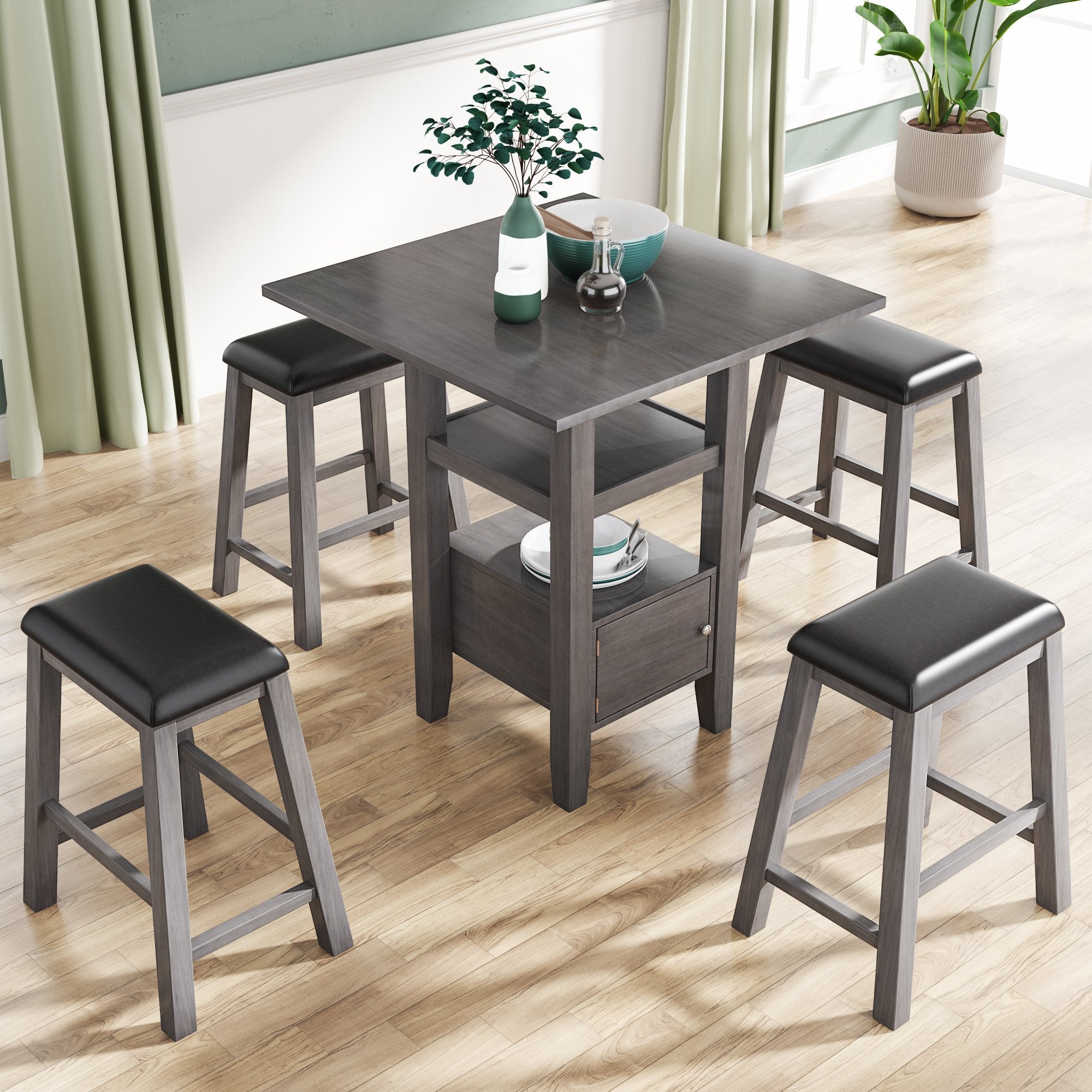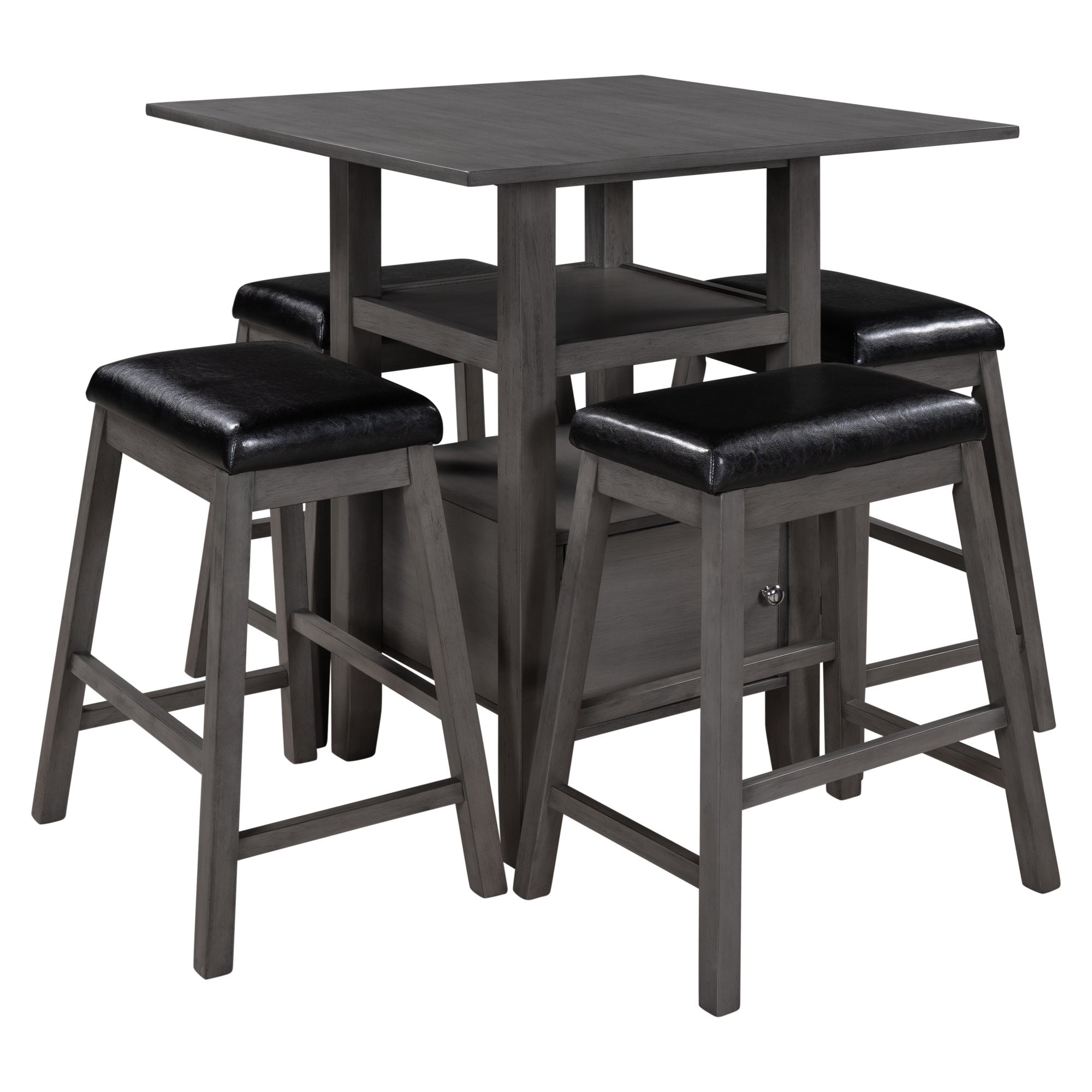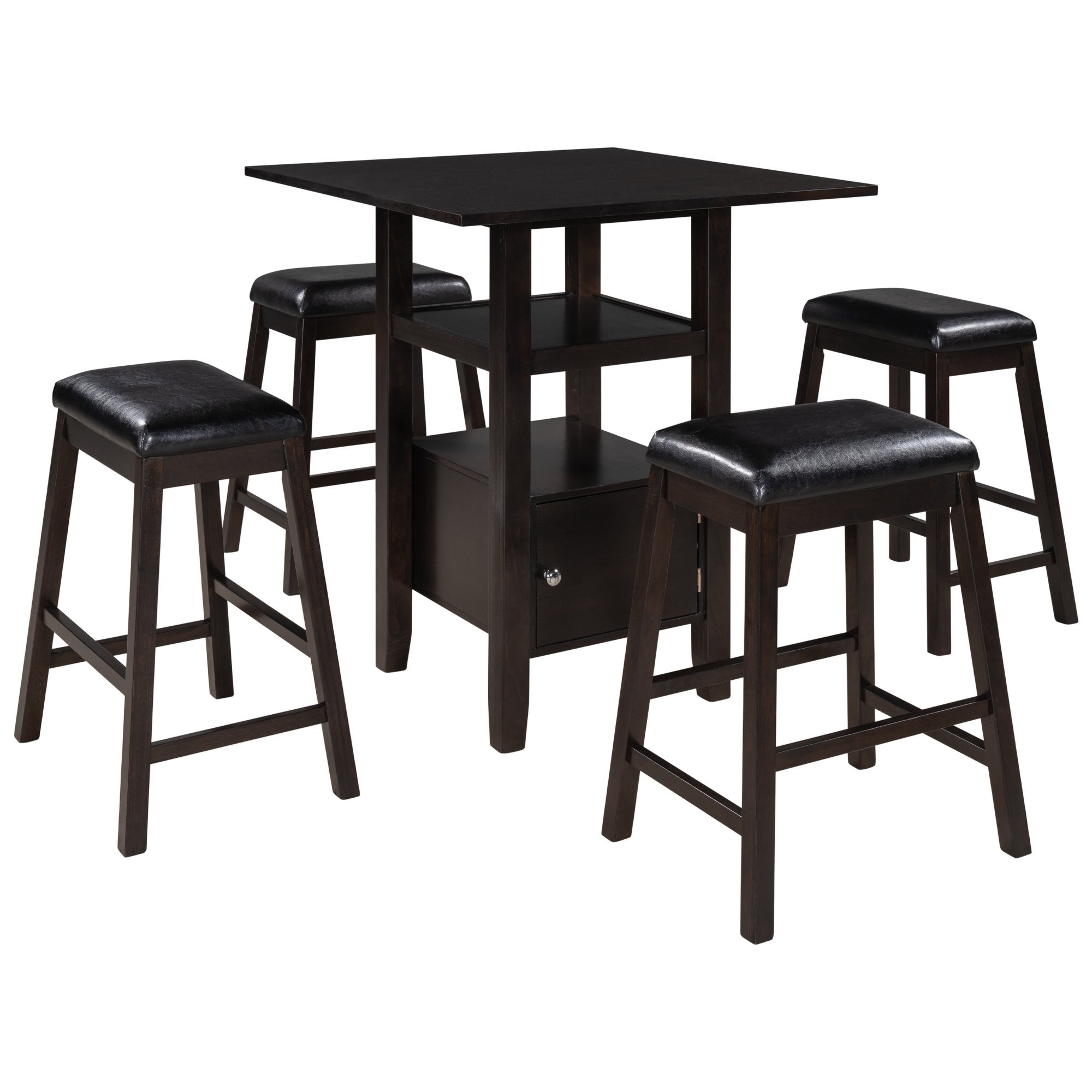 5 Pieces Counter Height Wood Kitchen Dining Table Set with 4 Upholstered Stools with Storage Cupboard and Shelf for Small Places