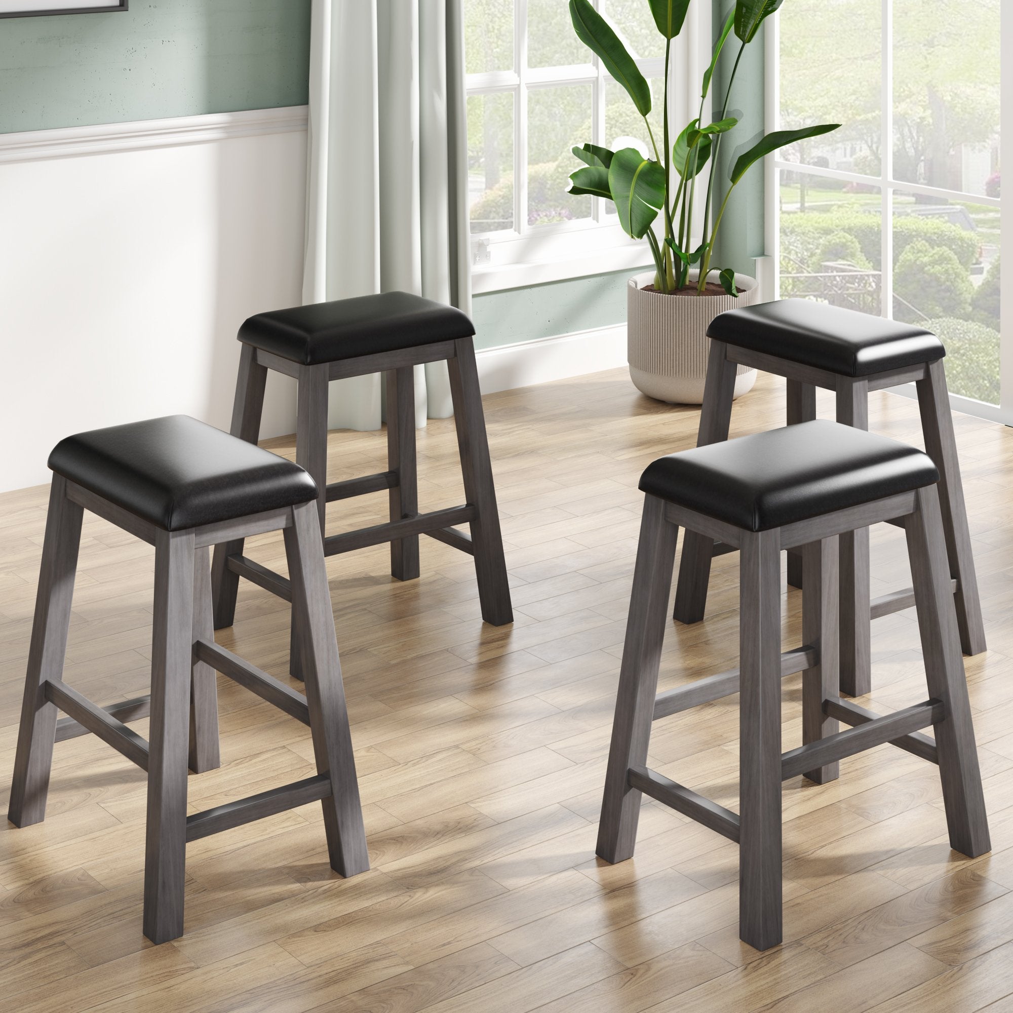 Comfortable Stools---Upgrade your seating experience with these padded stools upholstered in PU leather. Each ergonomically designed stools is completed with footrests to keep your body supported when you put your feet on the stretchers to ensure comfort. The 4 spindles are designed for increased stability while also providing a place to prop your feet up.