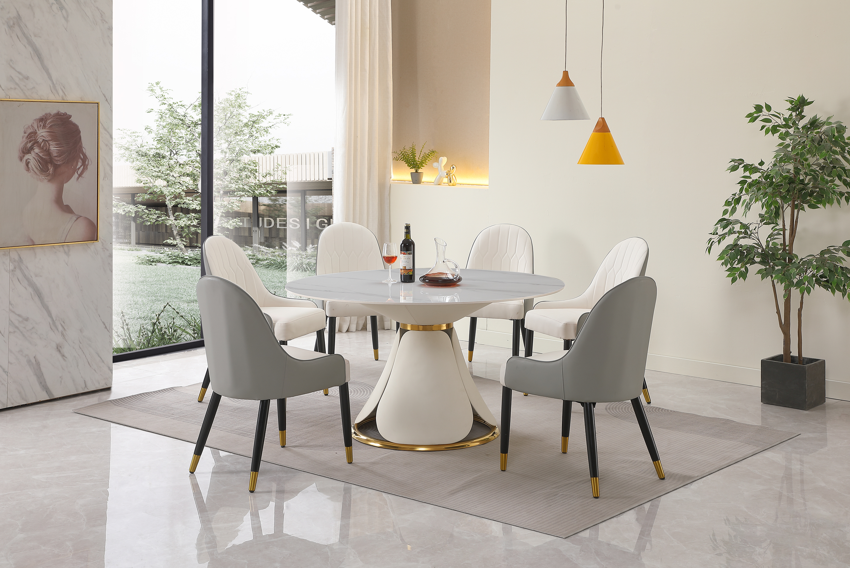 53“ Modern sintered stone round dining table with a stainless steel base with 6pcs Chairs.